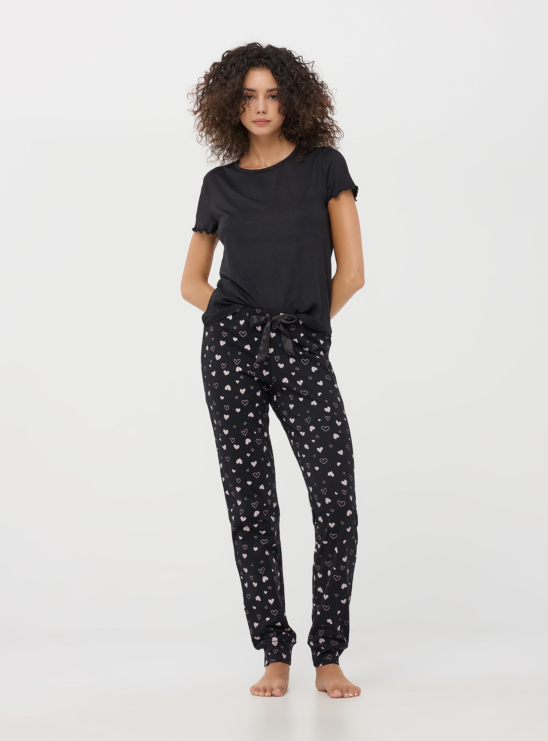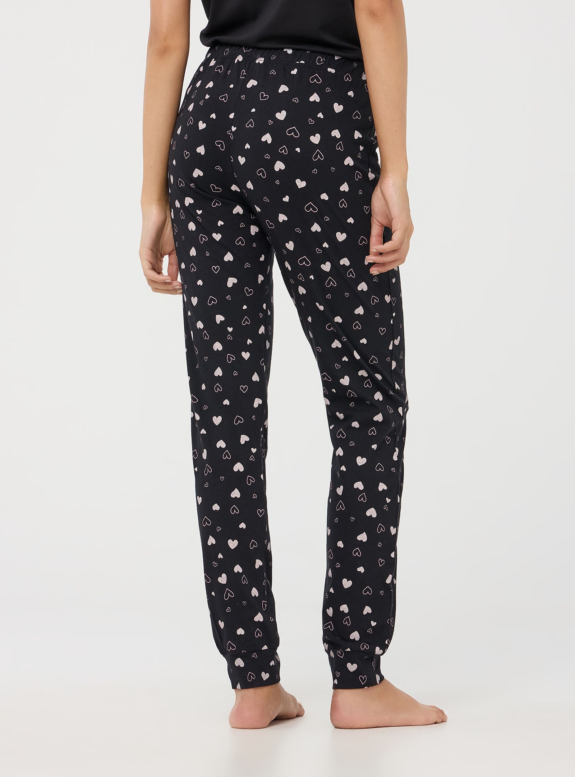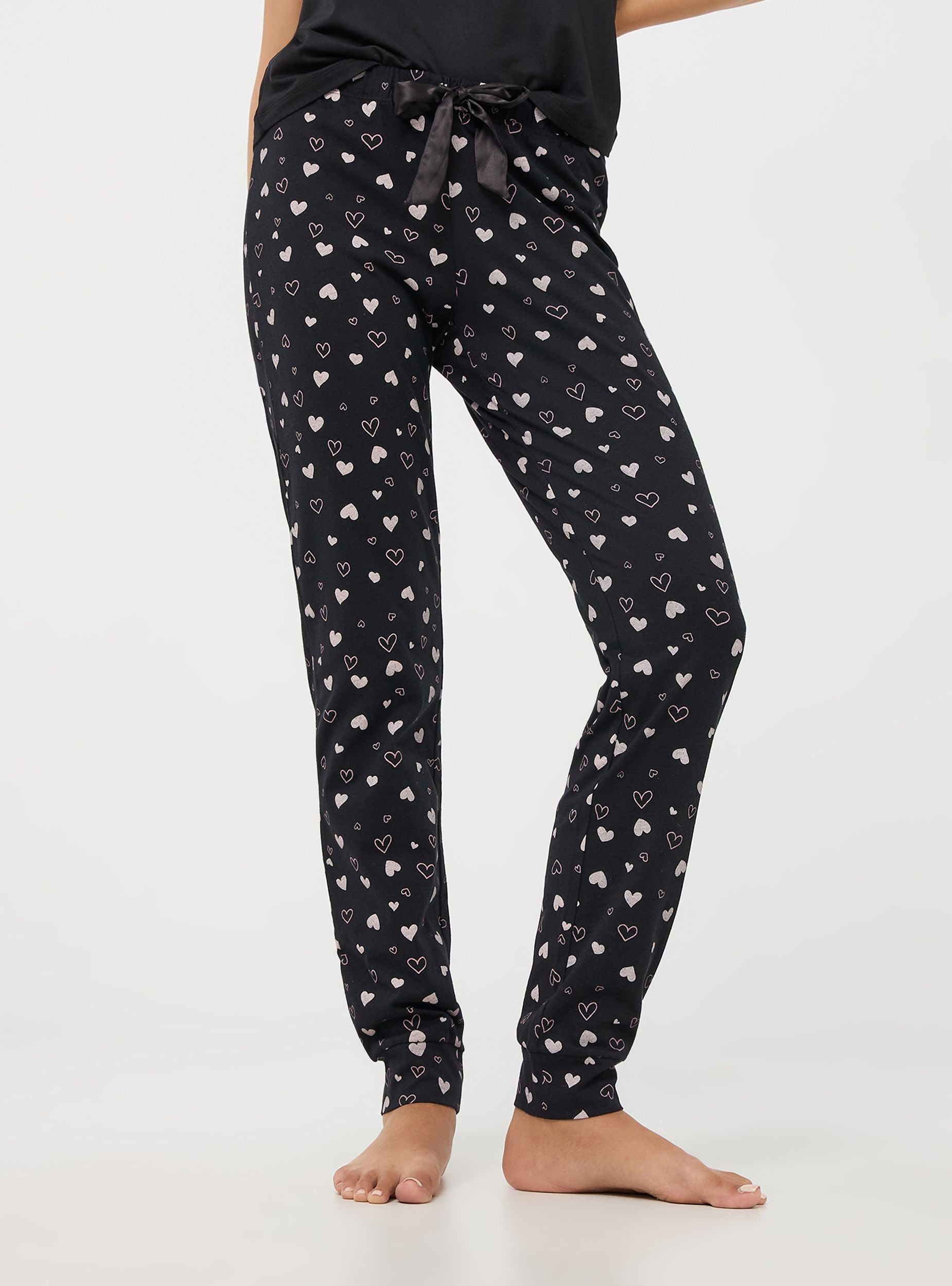 Pantaloni del pigiama da donna in morbido cotone decorati con una deliziosa stampa di cuori. Dotati di elastico e coulisse in vita, offrono una vestibilità comoda e rilassata. Modello senza tasche o zip per un comfort extra. Aggiungono un tocco romantico al tuo abbigliamento da casa. Perfetti per chi cerca comodità senza rinunciare allo stile.Dettagli