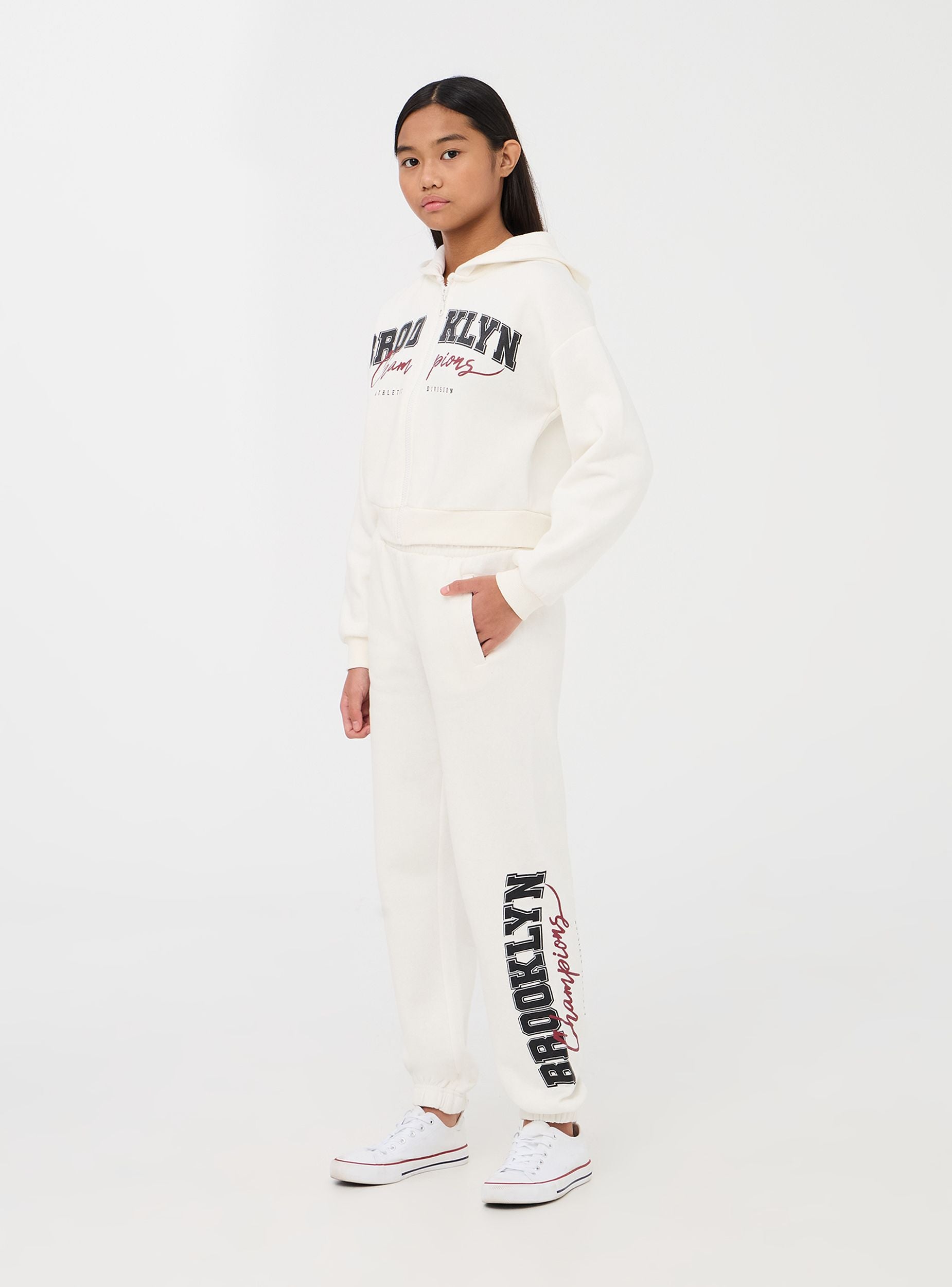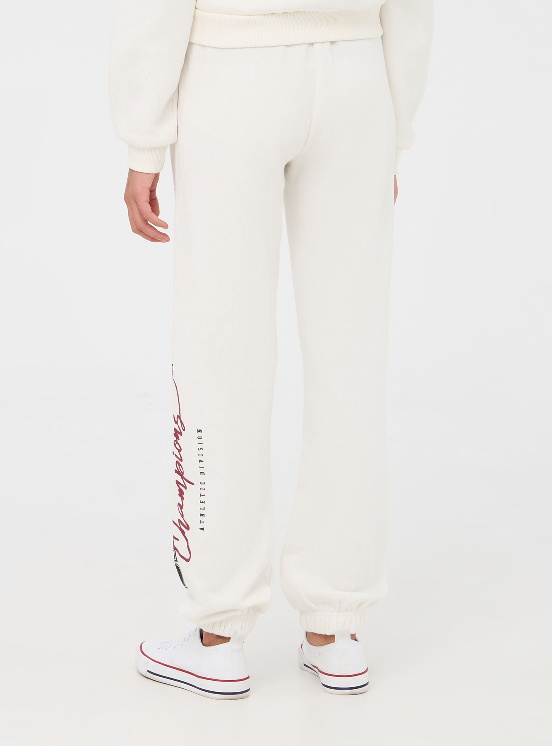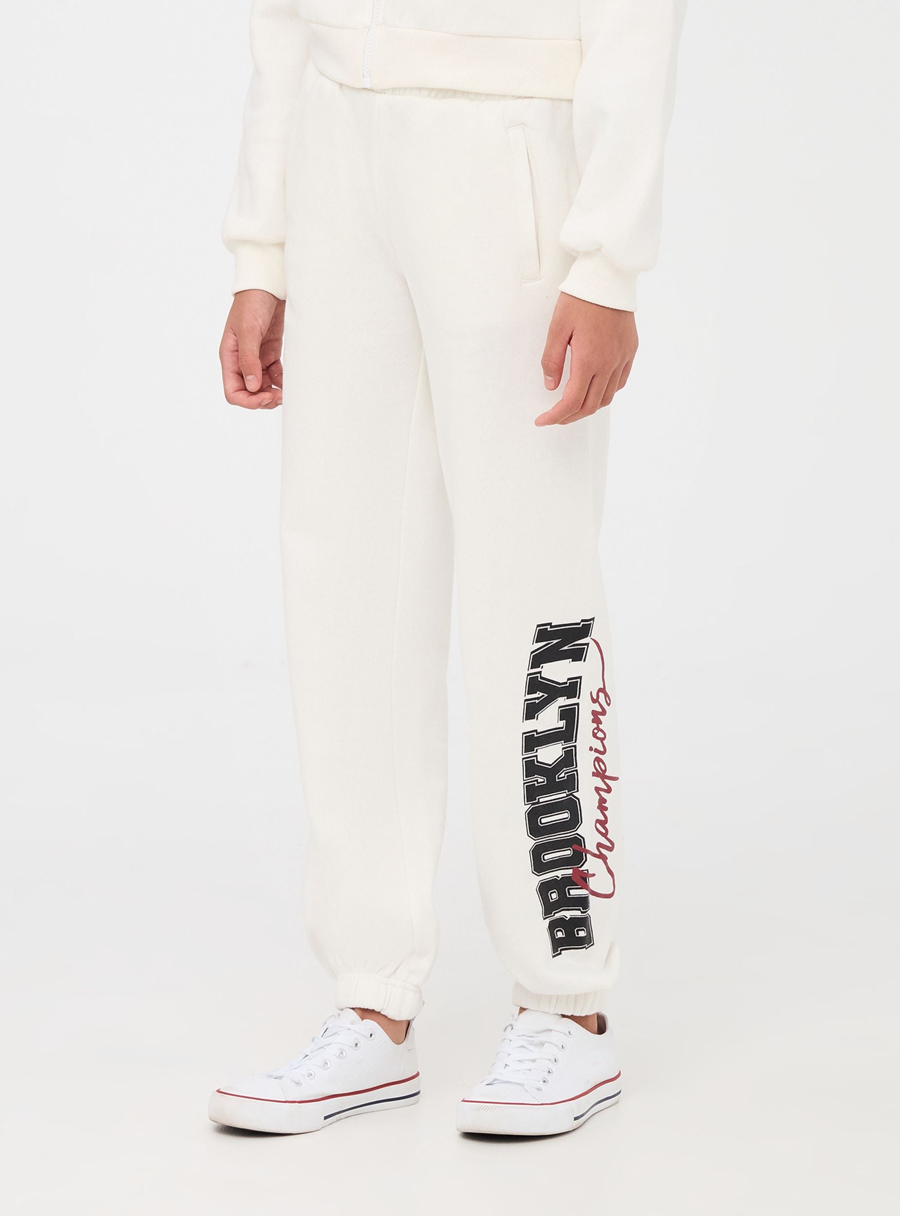 Pantaloni della tuta pesanti da bambina con stampa in stile college americano sulla gamba. Il design presenta una vita elasticizzata e polsini elasticizzati alla caviglia per una vestibilità comoda. Questi pantaloni sono ideali per il periodo invernale, offrendo comfort e calore.Dettagli