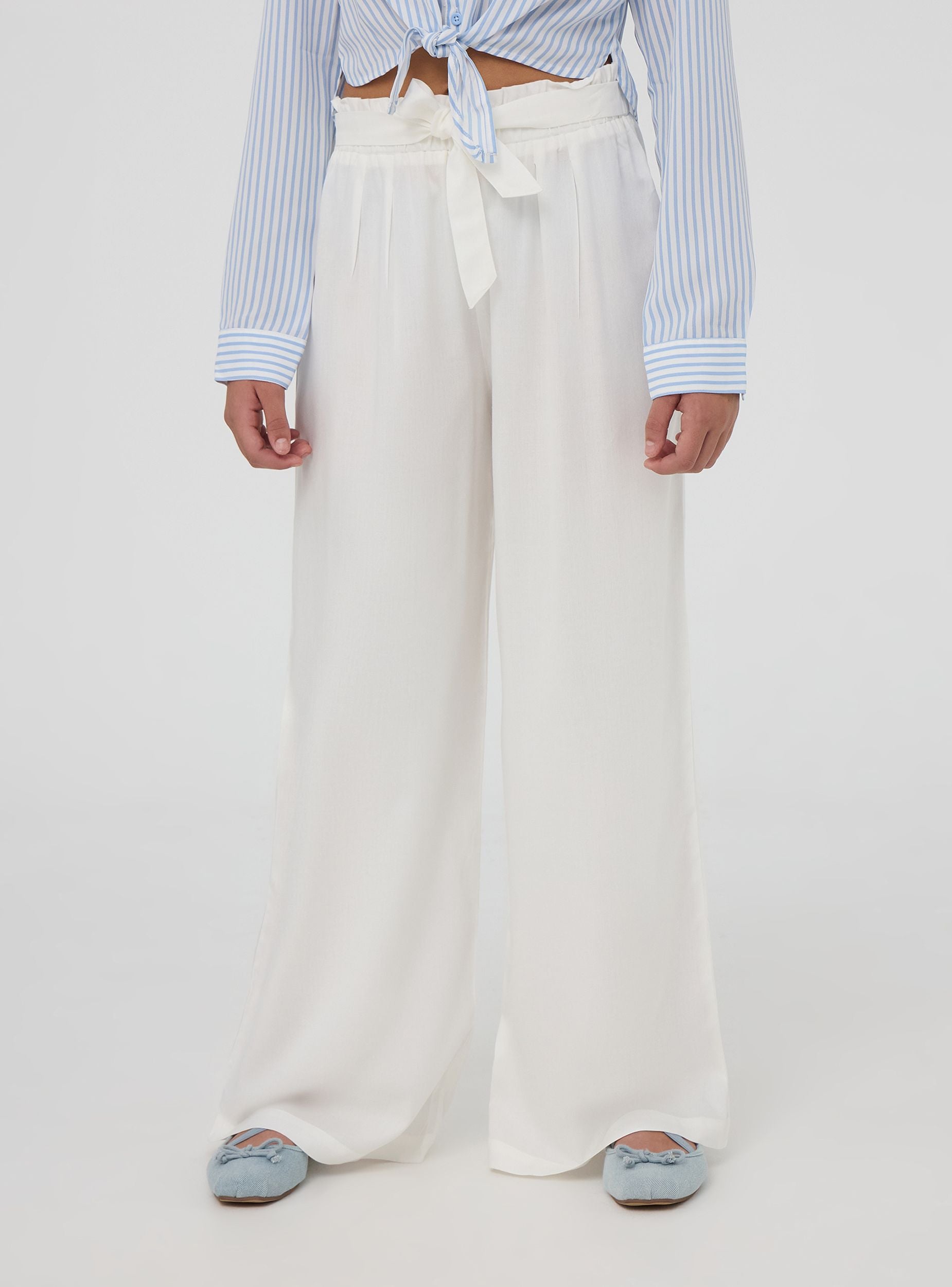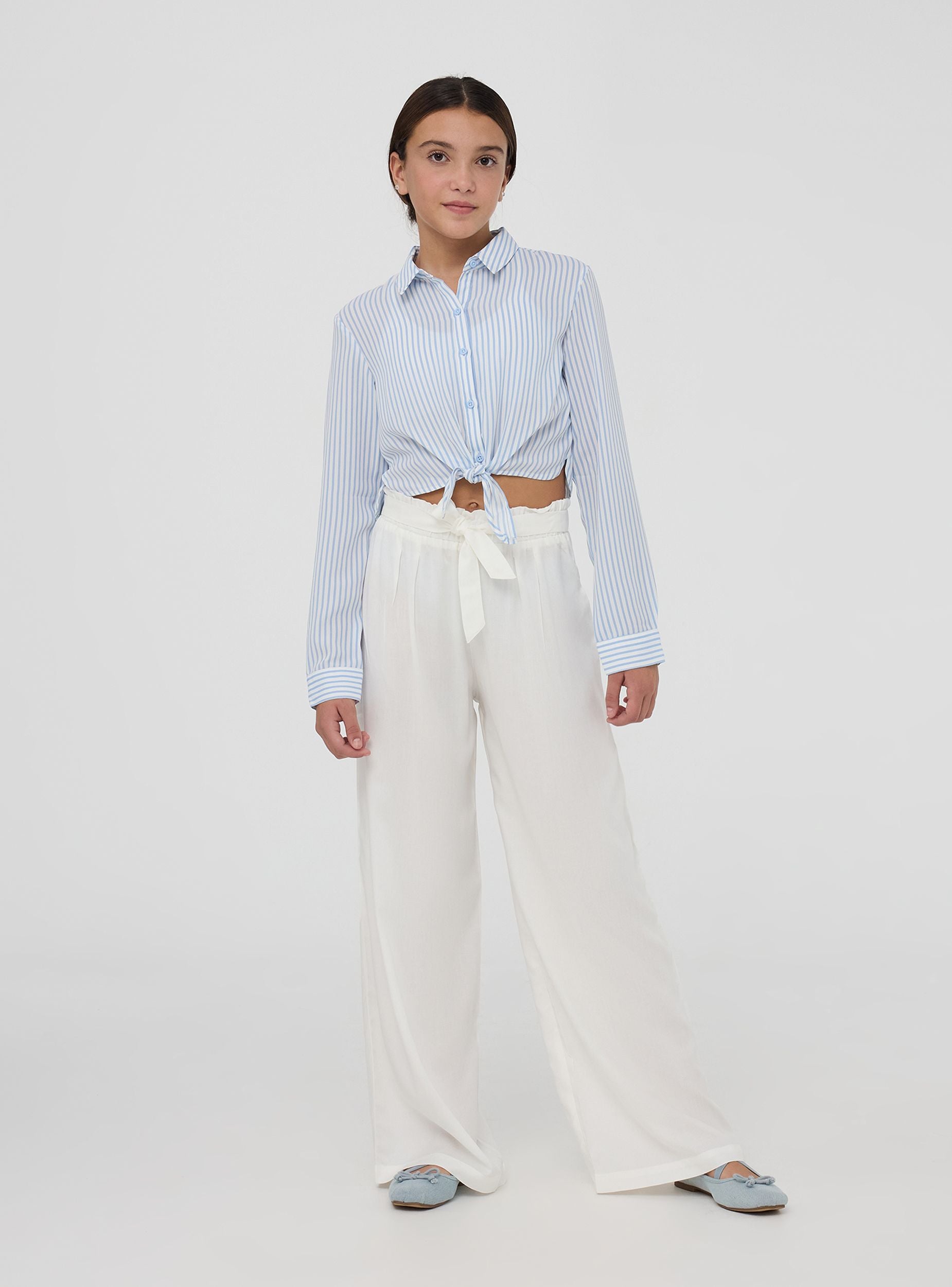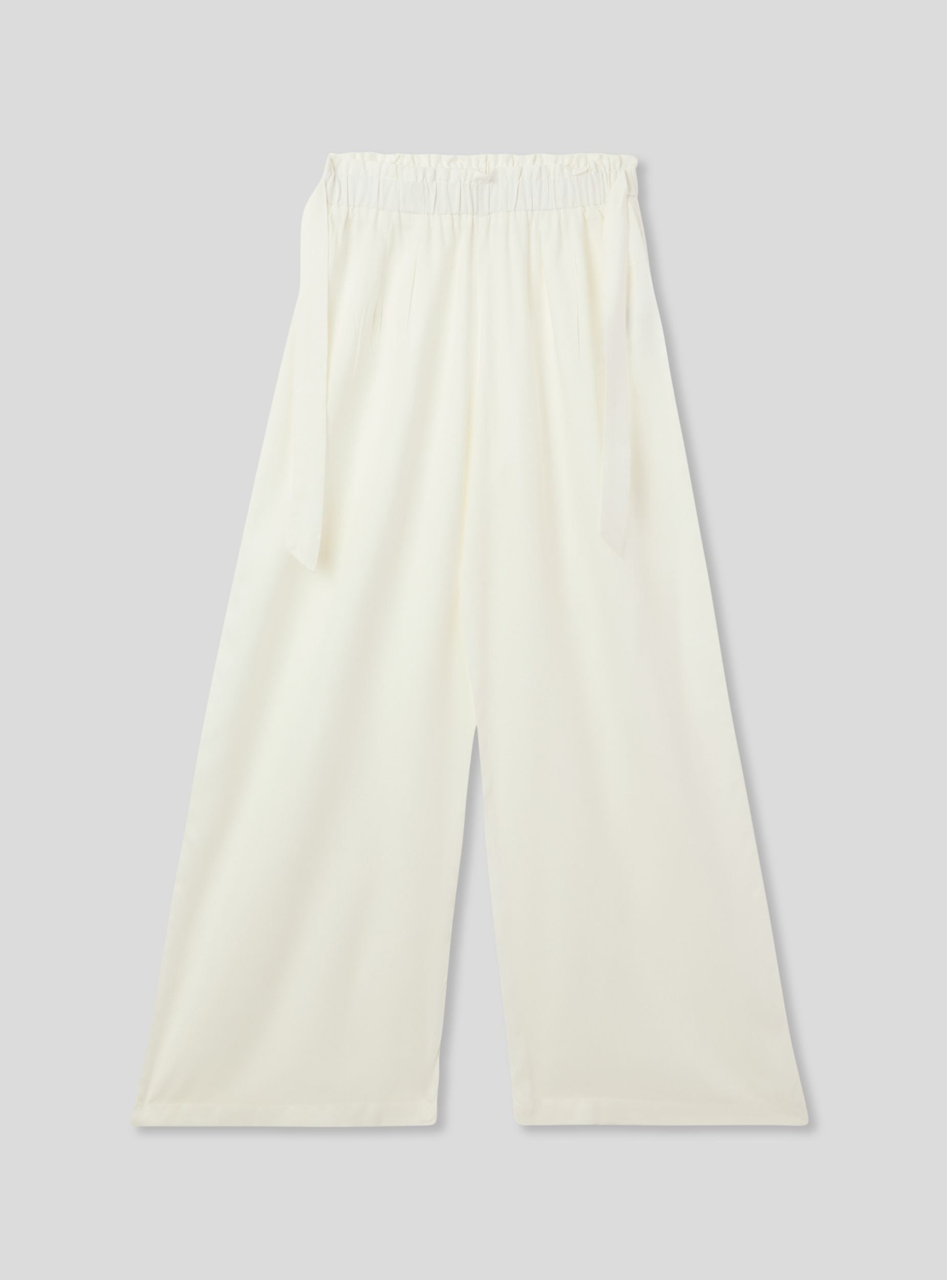 Pantaloni da bambina caratterizzati da un design a tinta unita con una linea lunga e un'ampia vestibilità wide leg. Realizzati in morbida viscosa, sono perfetti per garantire comfort e libertà di movimento in ogni occasione. La fusciacca in vita aggiunge un dettaglio di stile, valorizzando la silhouette e permettendo una vestibilità regolabile. Un capo ideale per look giocosi e ricercati.