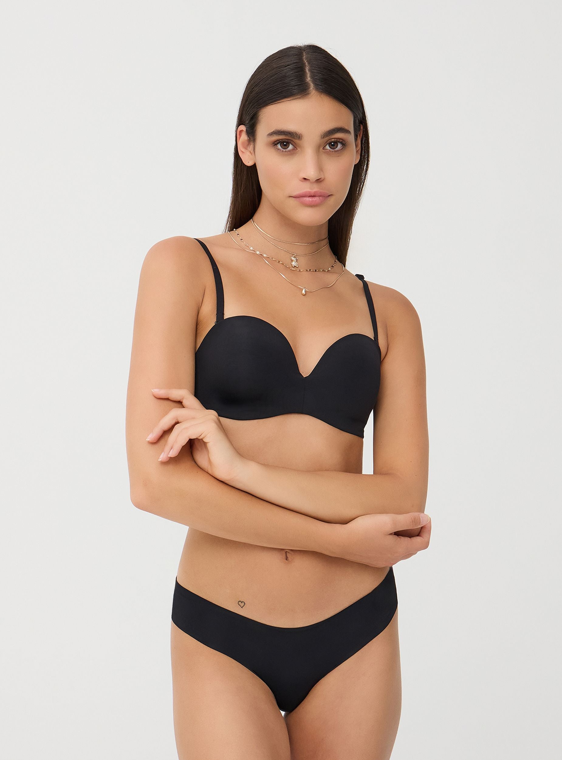 Reggiseno da donna, in microfibra, a fascia dotato di spalline "multiway" e chiusura posteriore con ganci. Il reggiseno presenta un design a fascia con silicone all'interno per garantire una migliore aderenza e stabilità. Le spalline sono regolabili e altamente versatili, offrendo diverse opzioni di utilizzo. Le spalline possono essere regolate e configurate in vari modi per adattarsi a diverse esigenze di abbigliamento.