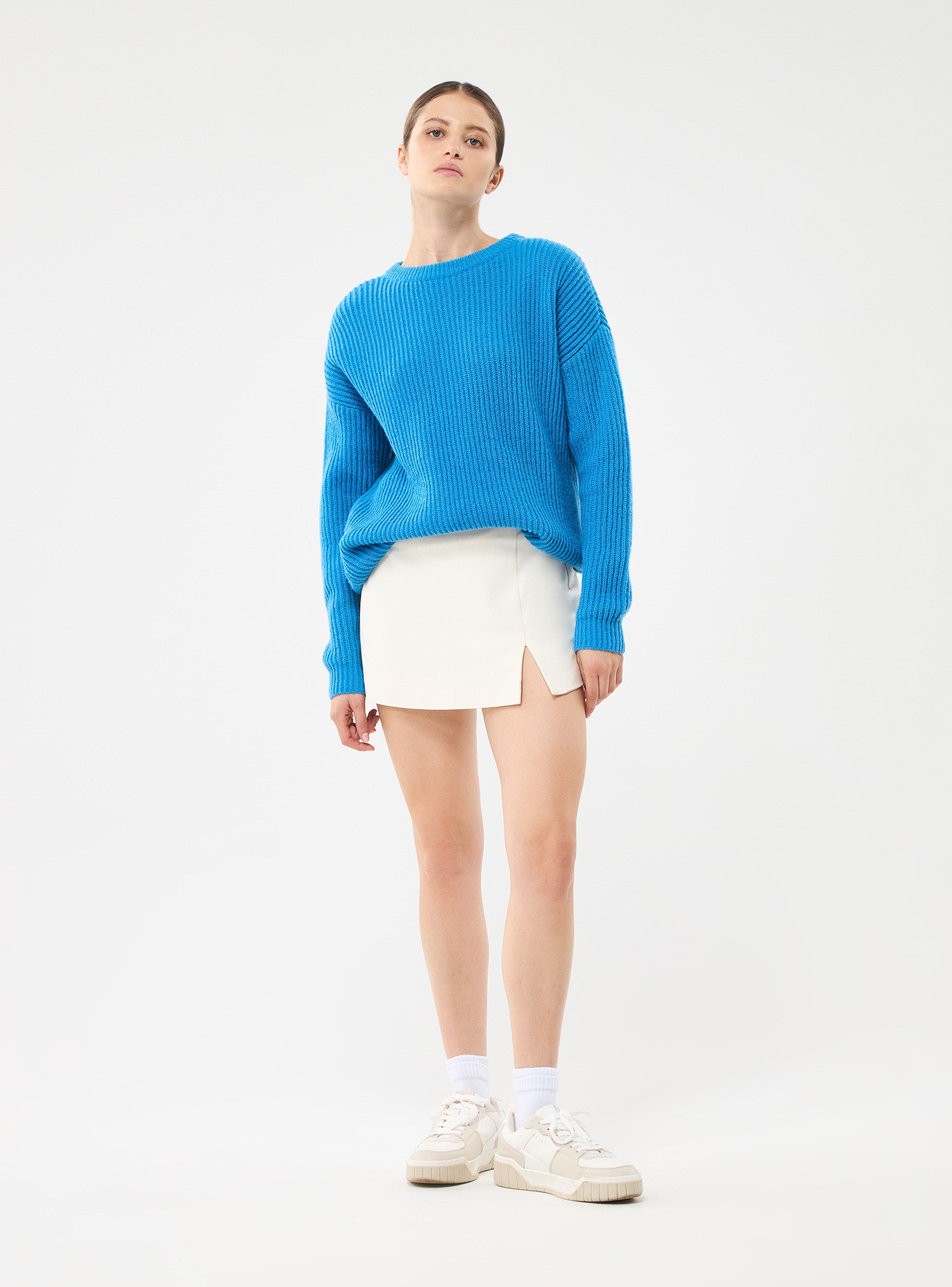 Gonna-pantalone da donna con piccolo spacco frontale. Chiusura a cerniera nascosta sul retro, lunghezza mini.
