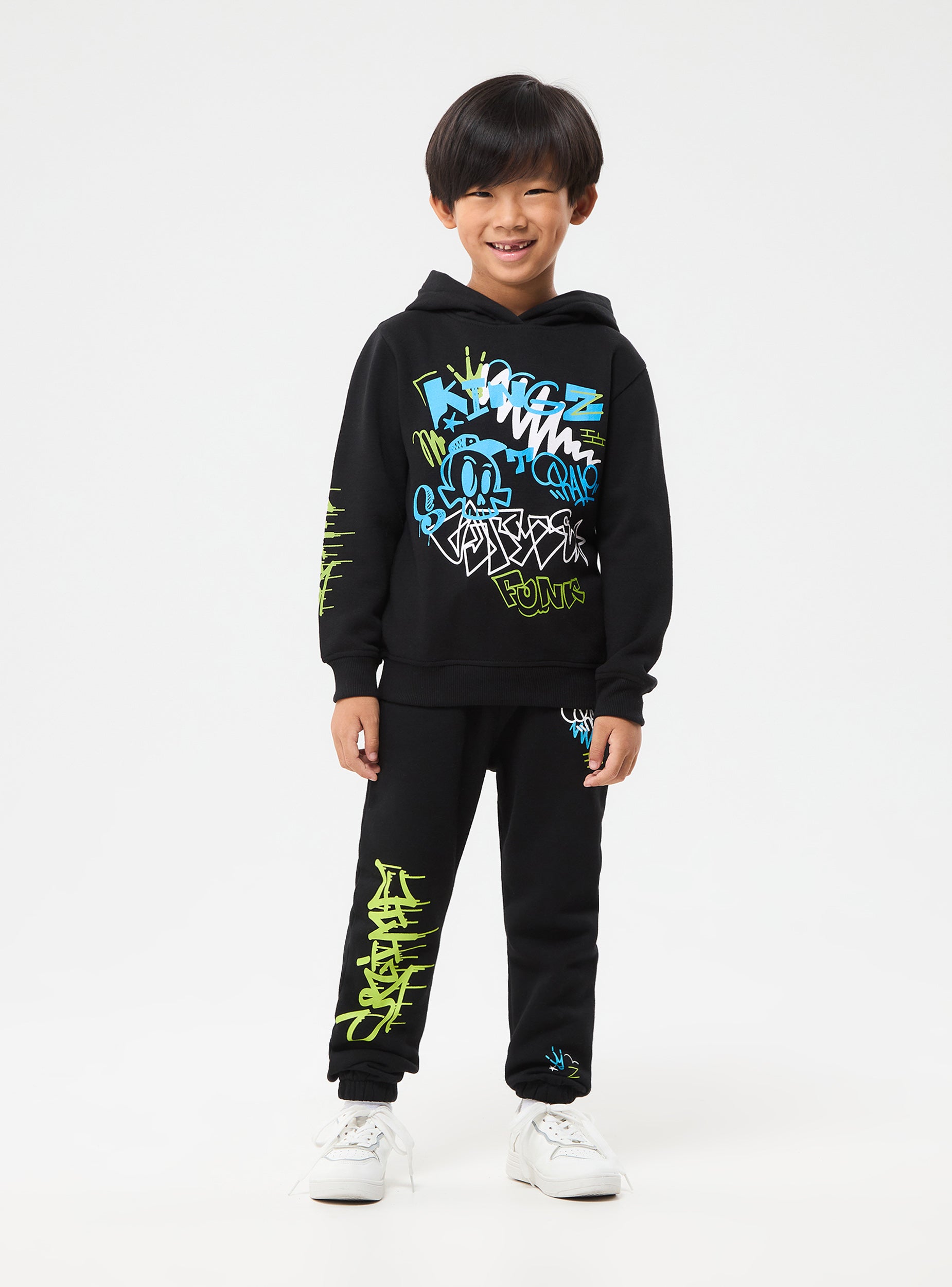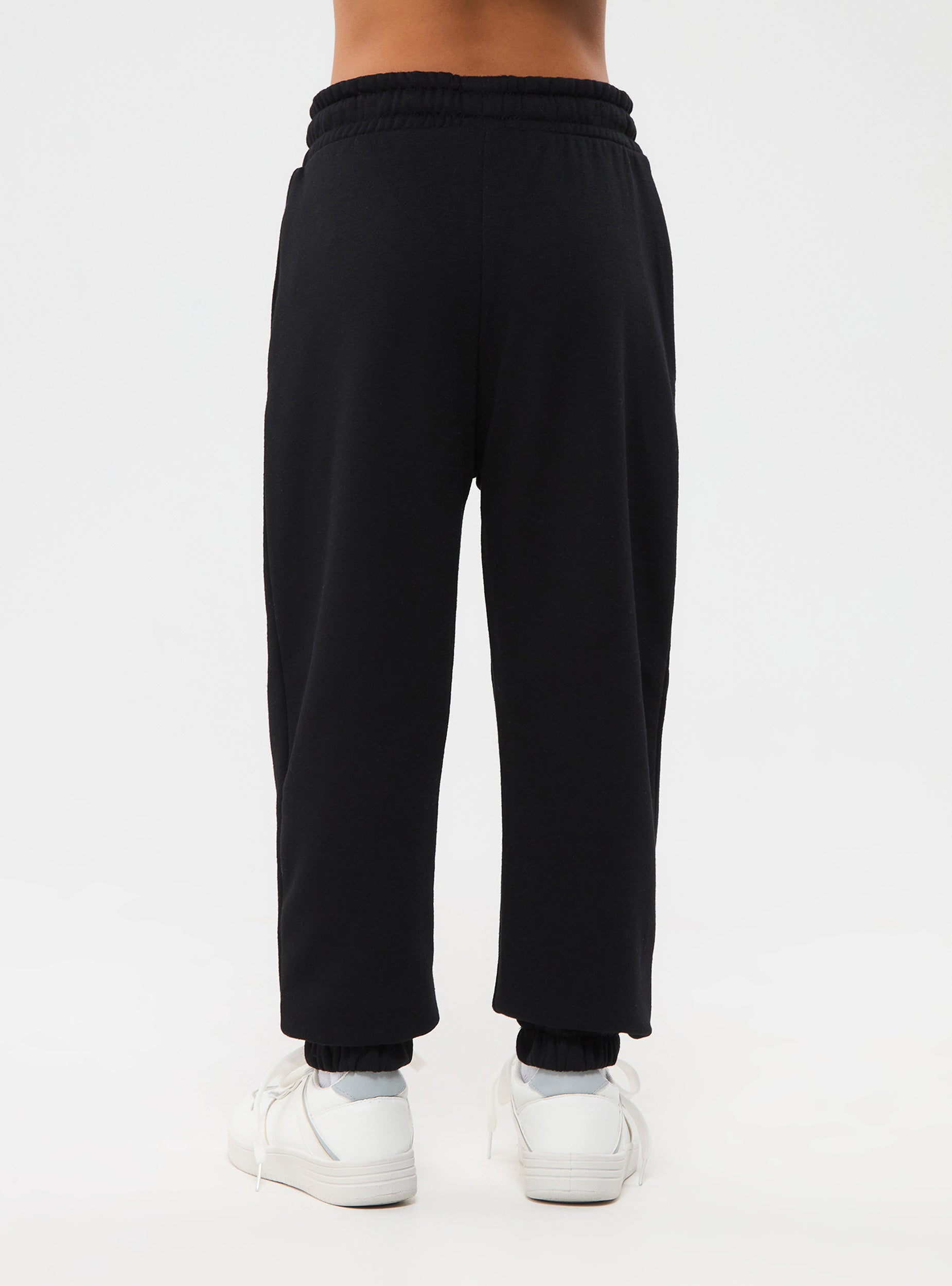 Pantaloni tuta da bambino. Elastico in vita con coulisse, fondo con polsino. Tessuto pesante a tinta unita con stampe stile graffiti.