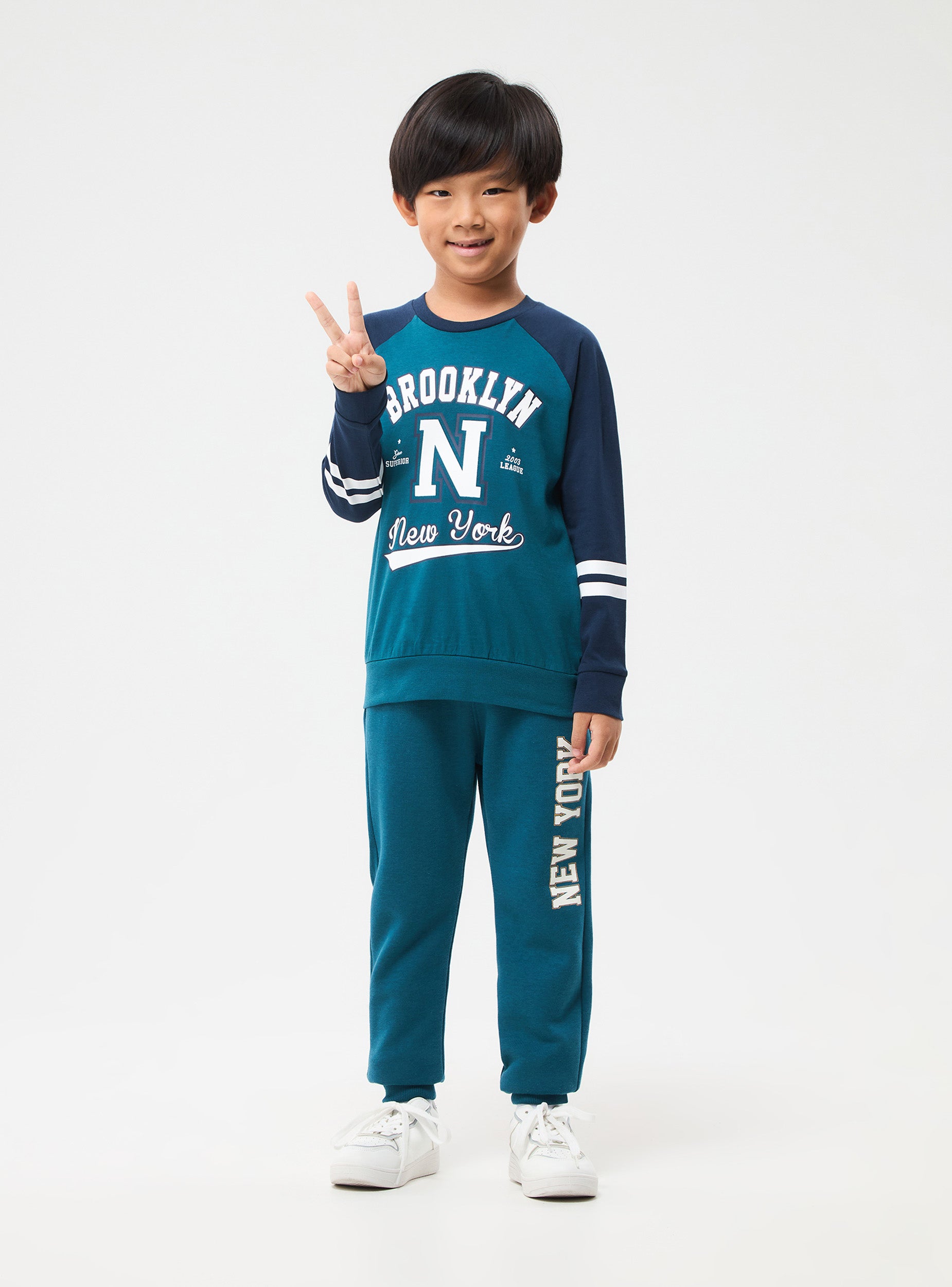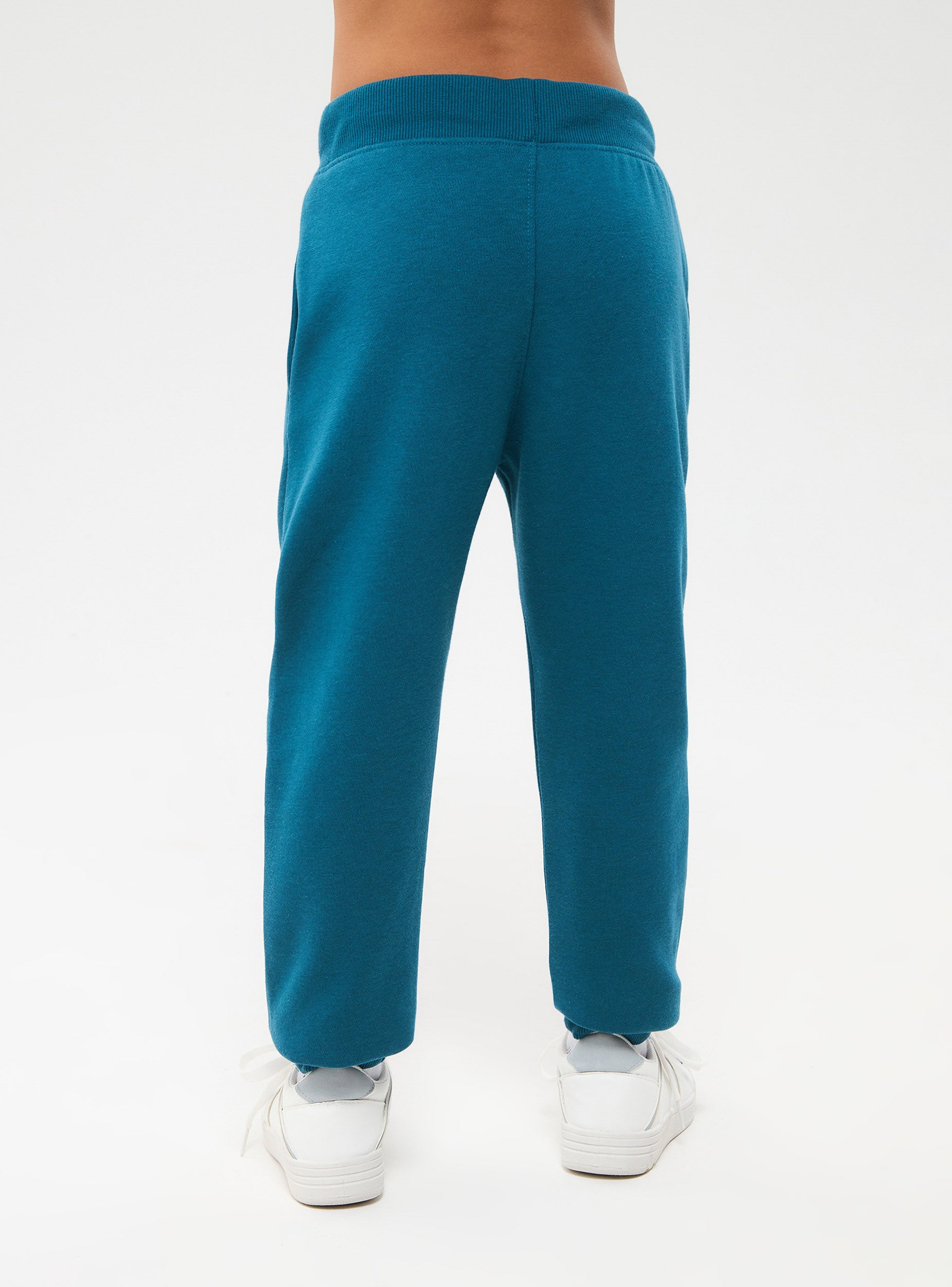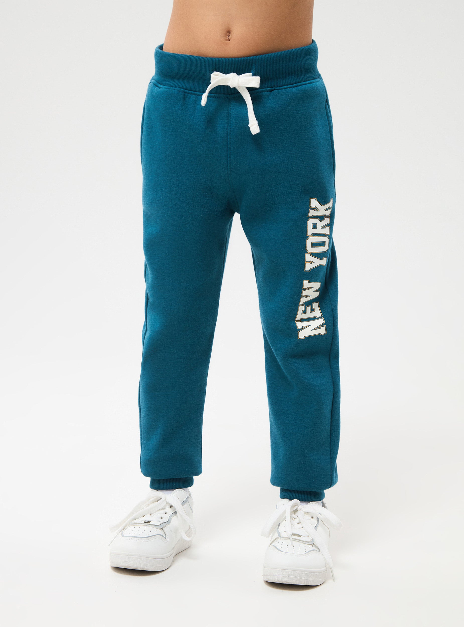 Pantaloni tuta lungo da bambino. Coulisse in vita, fondo con polsino. Tasche laterali, tessuto pesante a tinta unita con stampa.