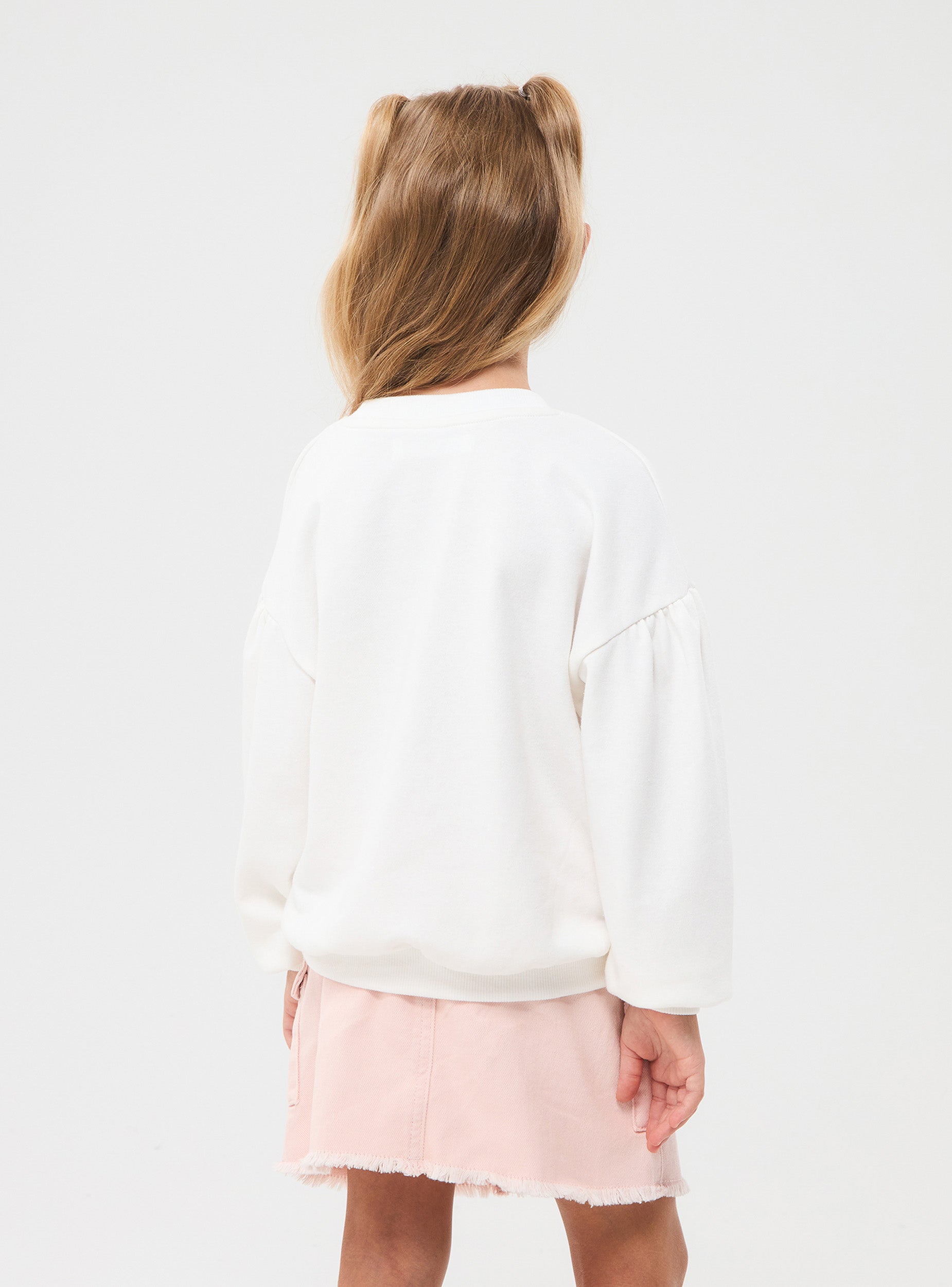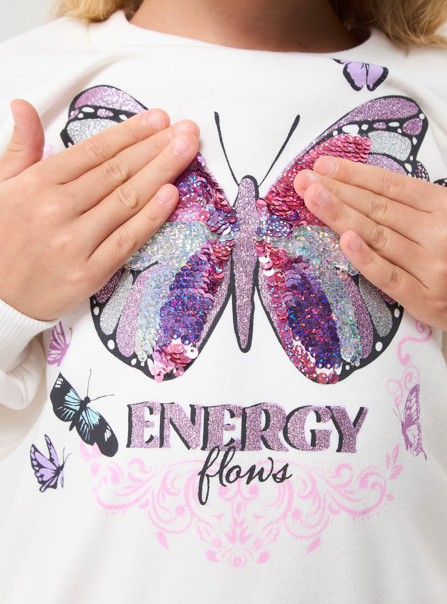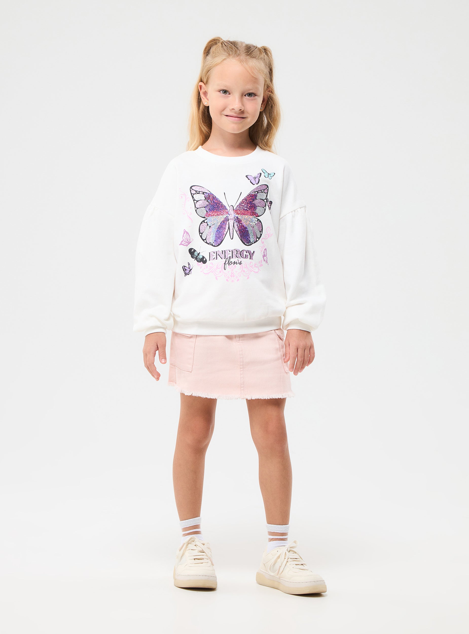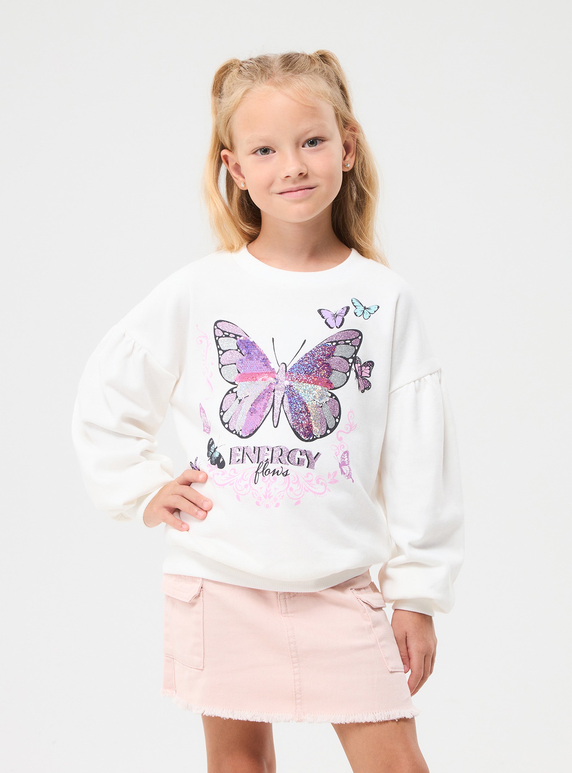 Felpa da bambina modello girocollo. Stampa farfalla frontale, tessuto leggero. Vestibilità regular.