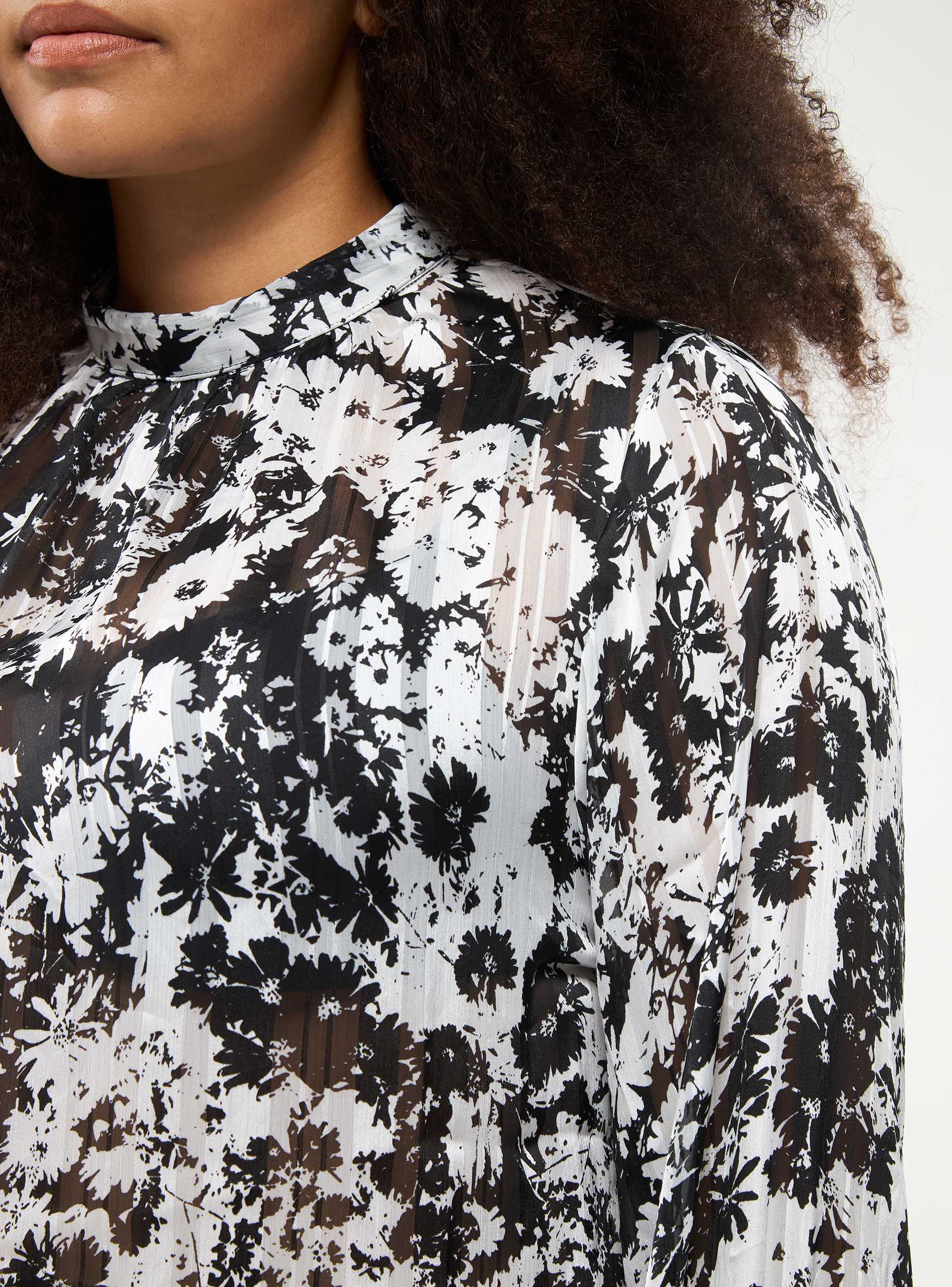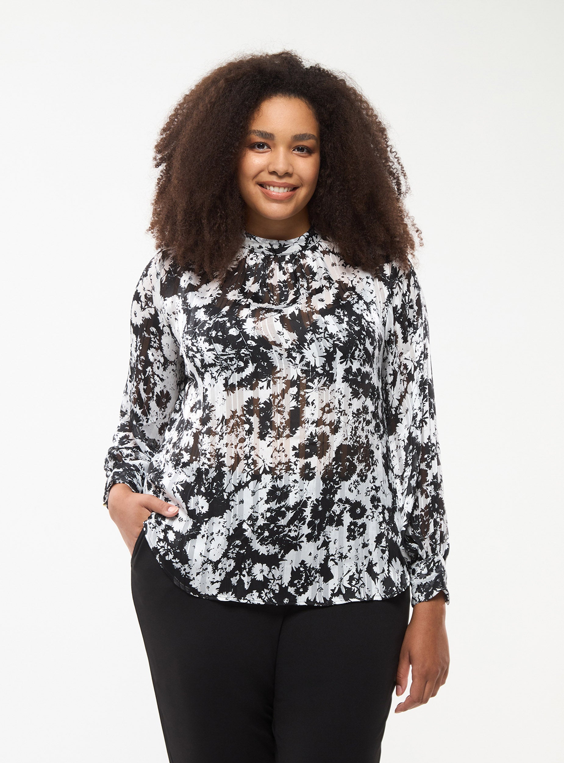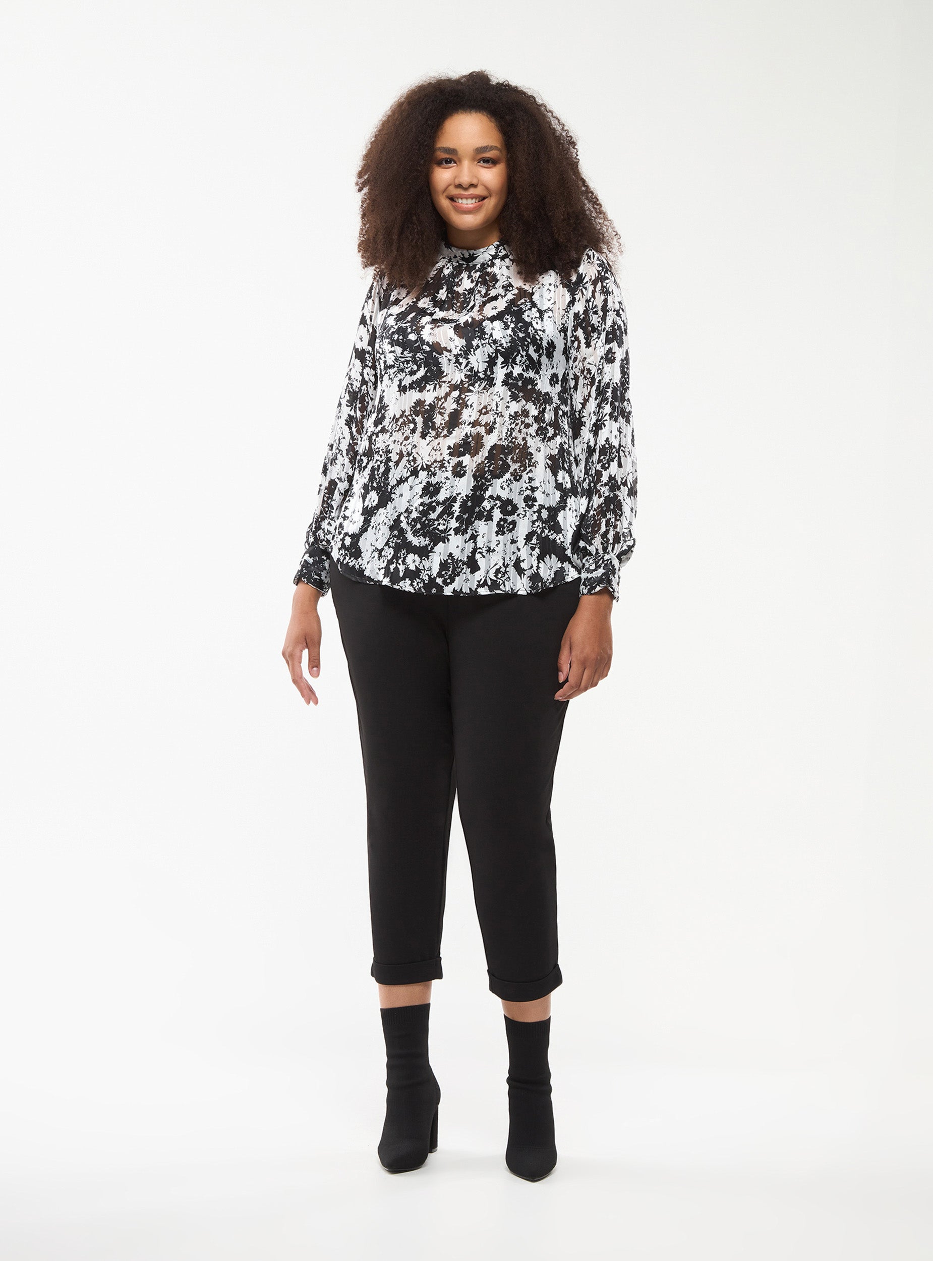 Blusa da donna con colletto arricciato. Svasata sul fondo, tessuto fantasia. Linea Curvy.La modella è alta 1,82 e indossa la taglia 2XL.