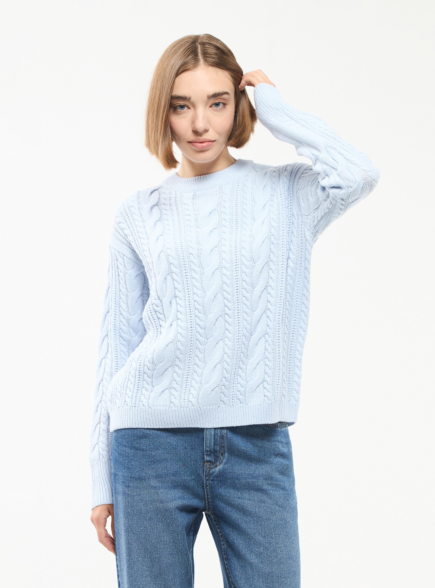 Maglia da donna modello girocollo. Filato tinta unita lavorato a trecce. Vestibilità è  regular.