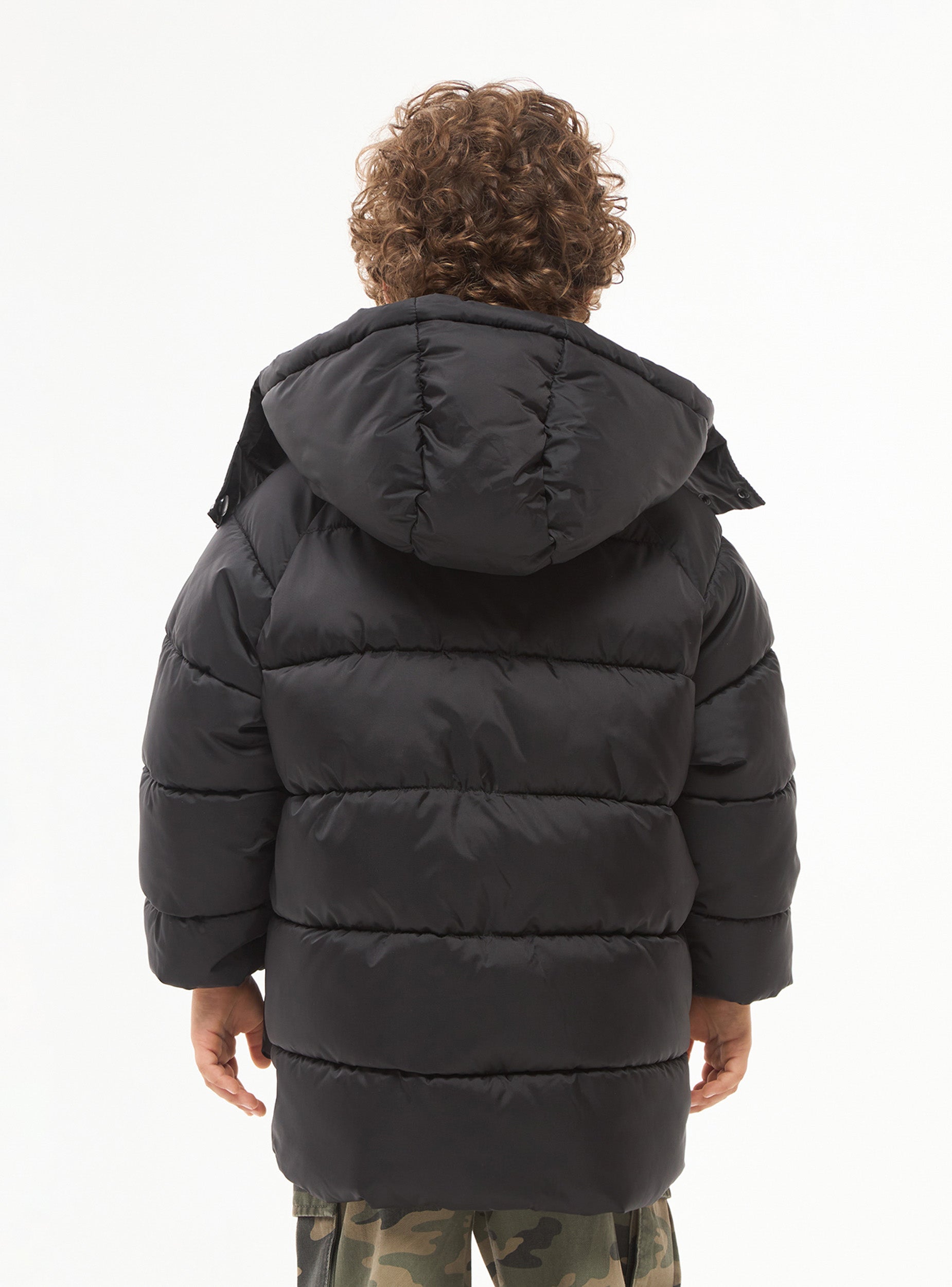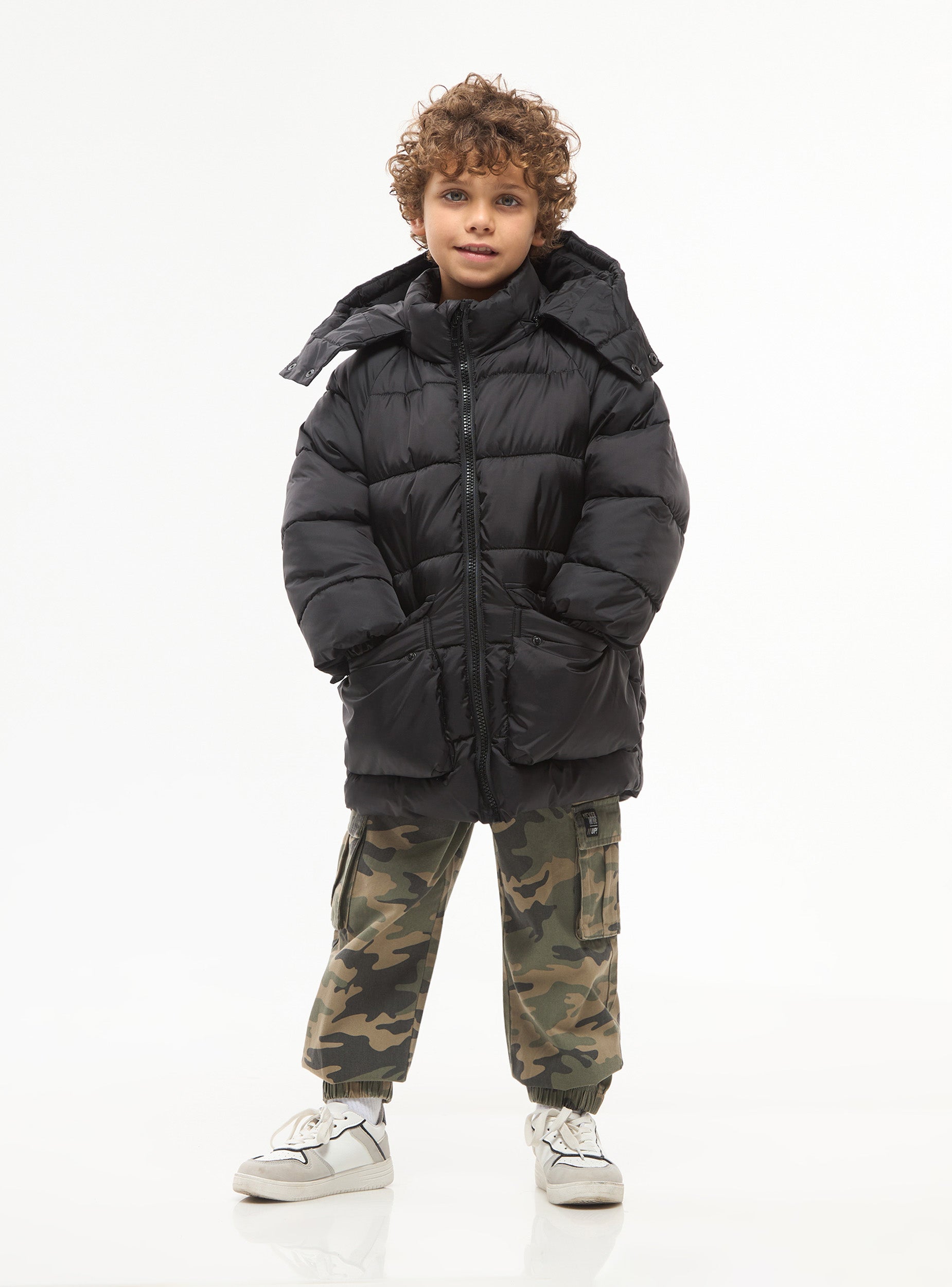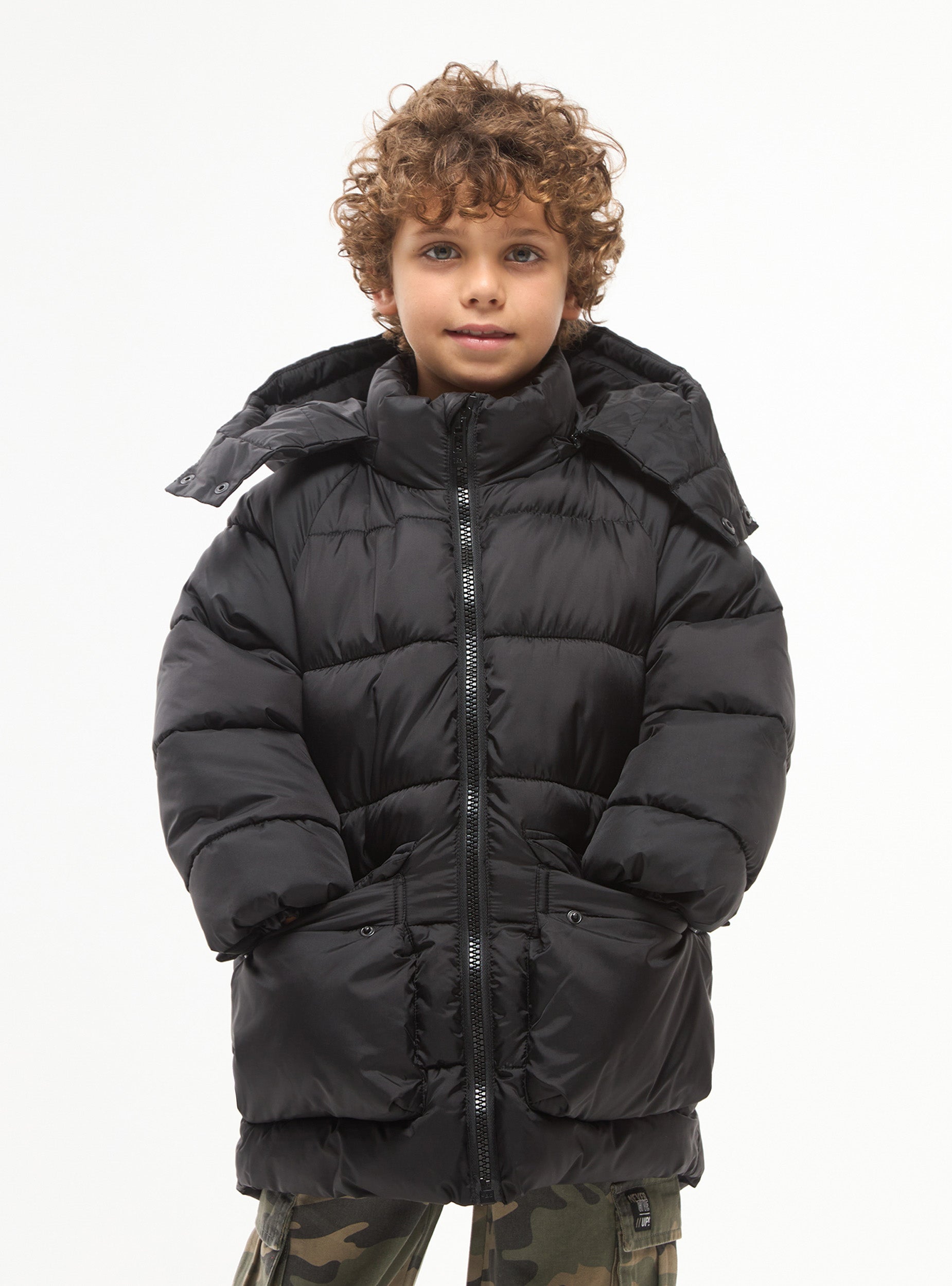 Giacca invernale imbottita lungo da bambino. Modello puff con cappuccio e chiusura con zip frontale. Manica lungo con polsino e tasche applicate. Vestibilità è ampia.