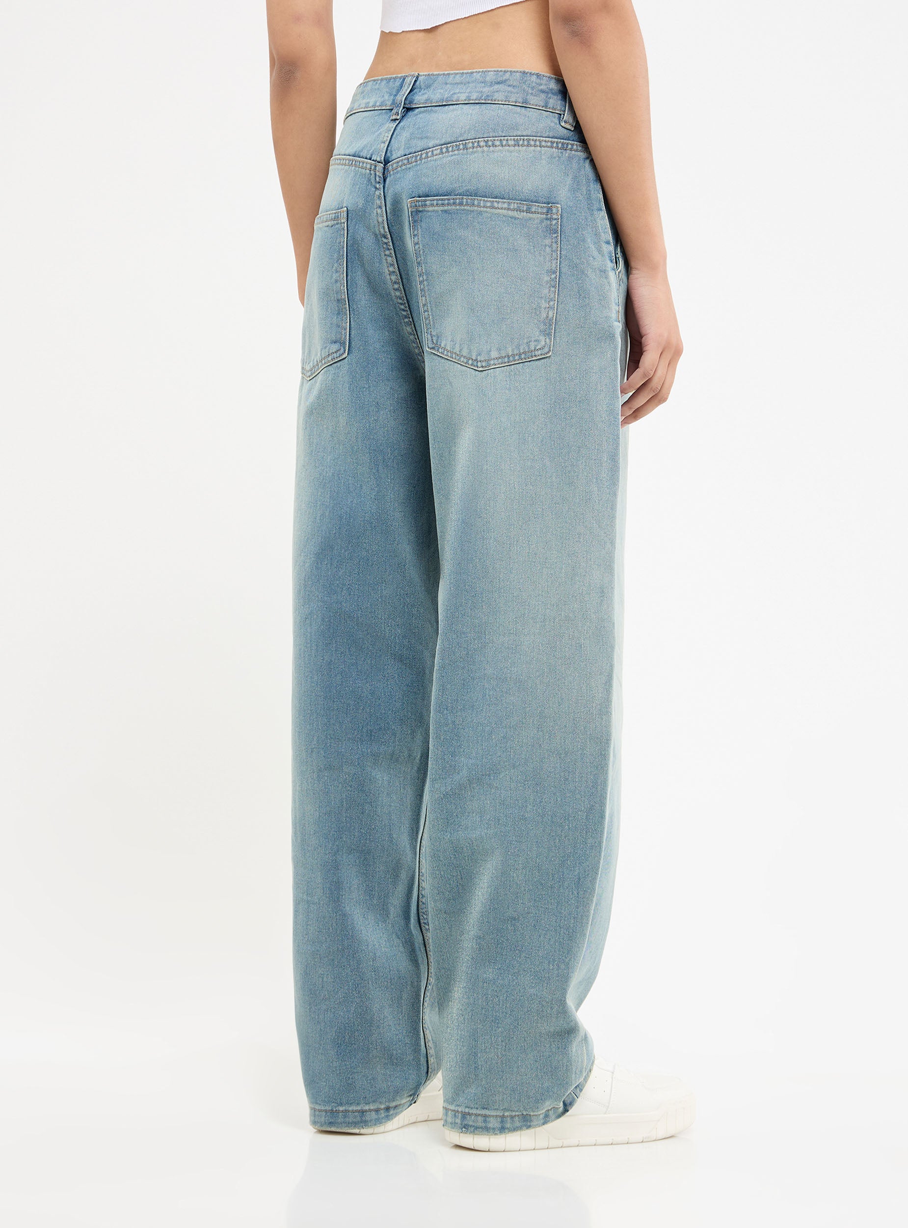 Jeans da donna a vita bassa. Lavaggio blu denim scuro effetto sabbiato. Tasche laterali, modello baggy.La modella è alta 1,75 e indossa la taglia 42.