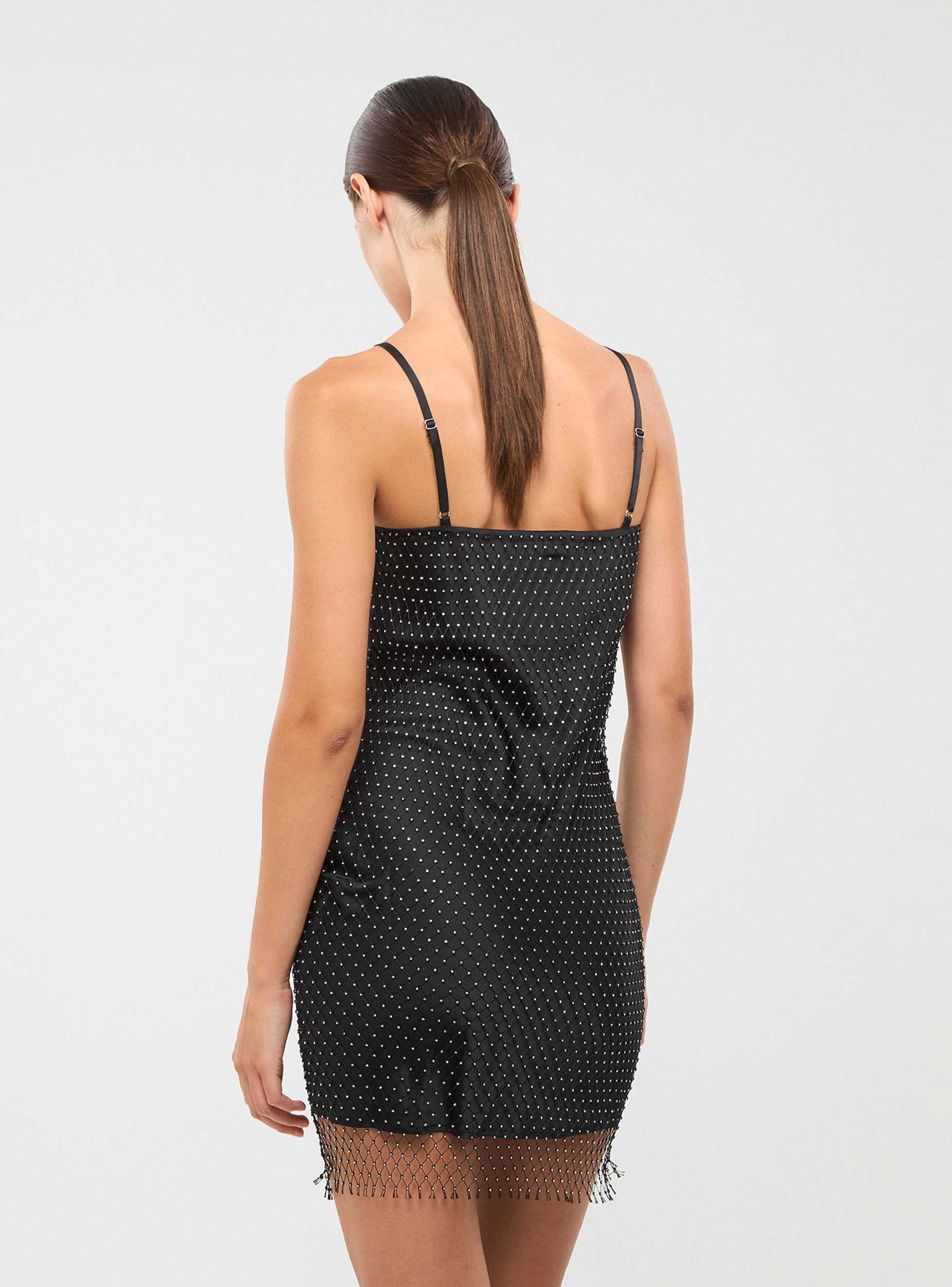 Abito a fascia da donna con rete a strass. Spalline sottili, lunghezza mini.