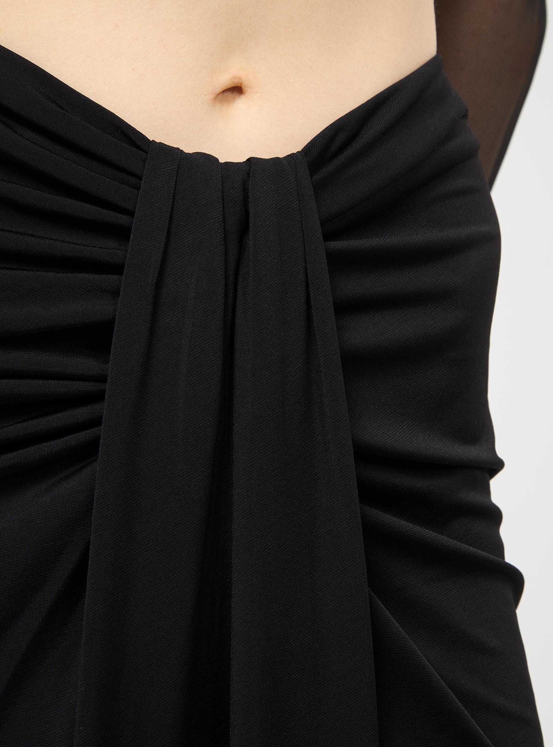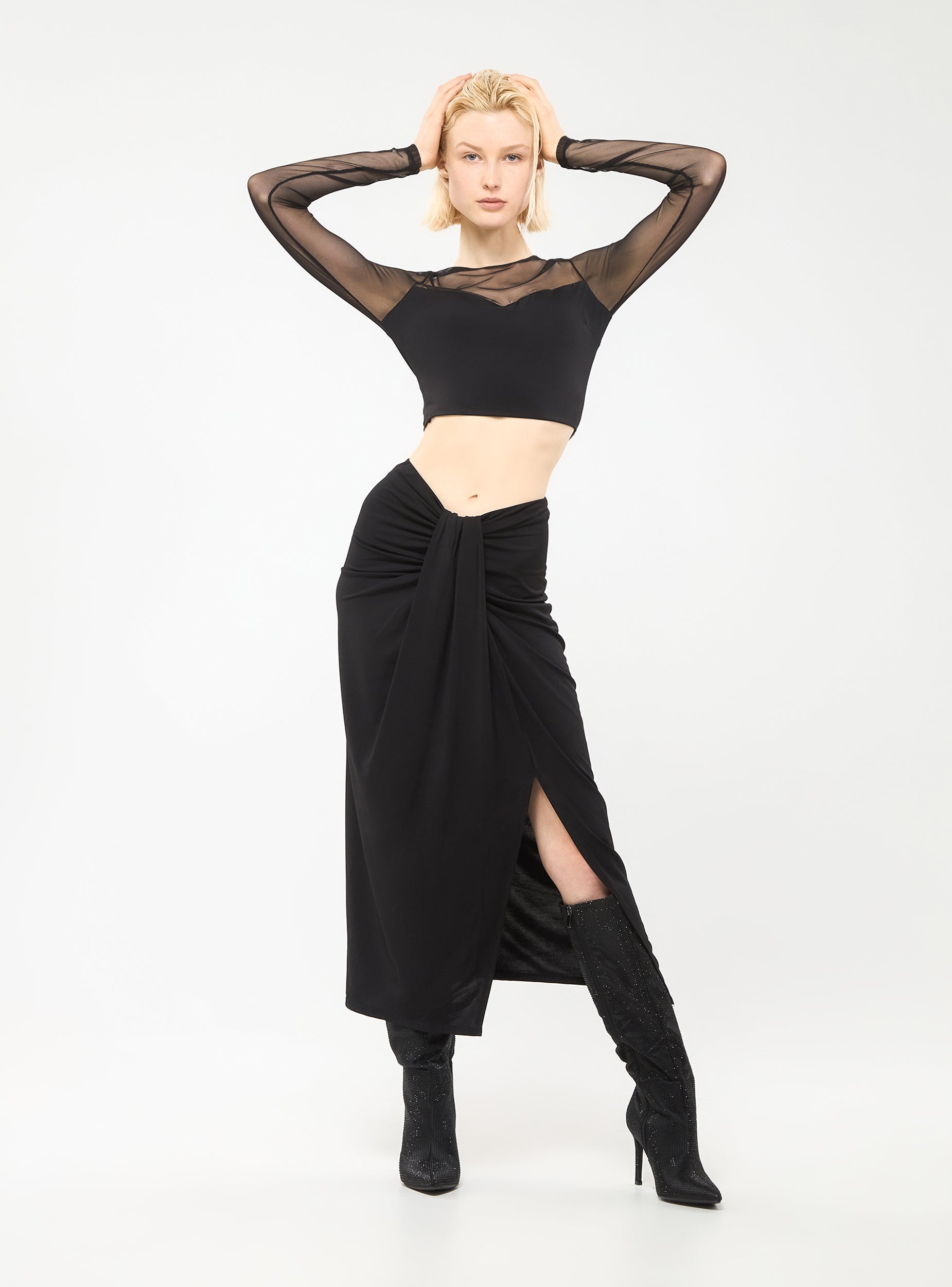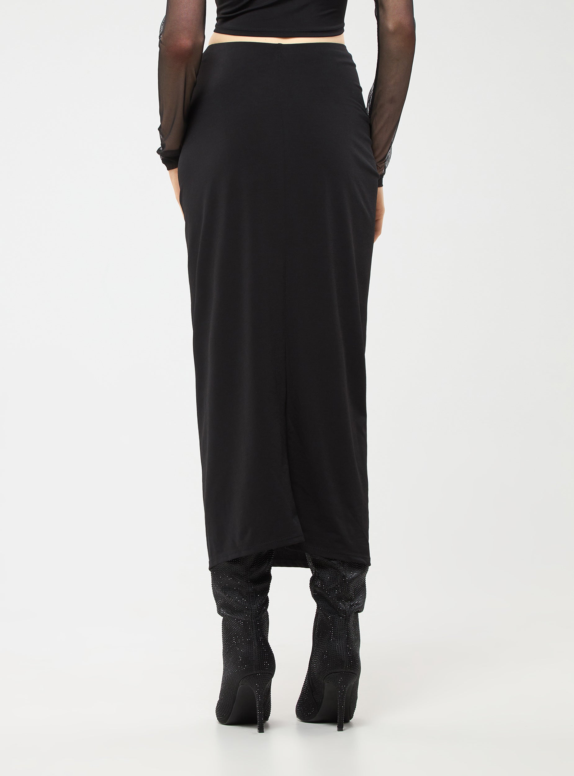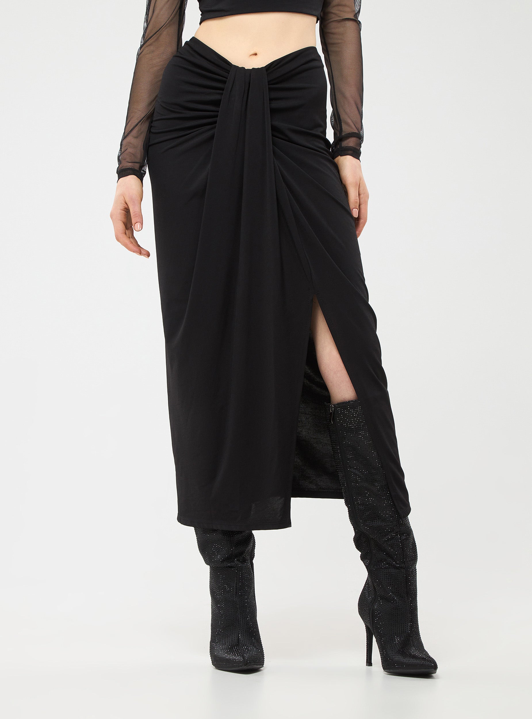 Gonna lunga da donna con drappo frontale. Tessuto a tinta unita. Lunghezza maxi. La modella è alta 1,70 e indossa la taglia S.