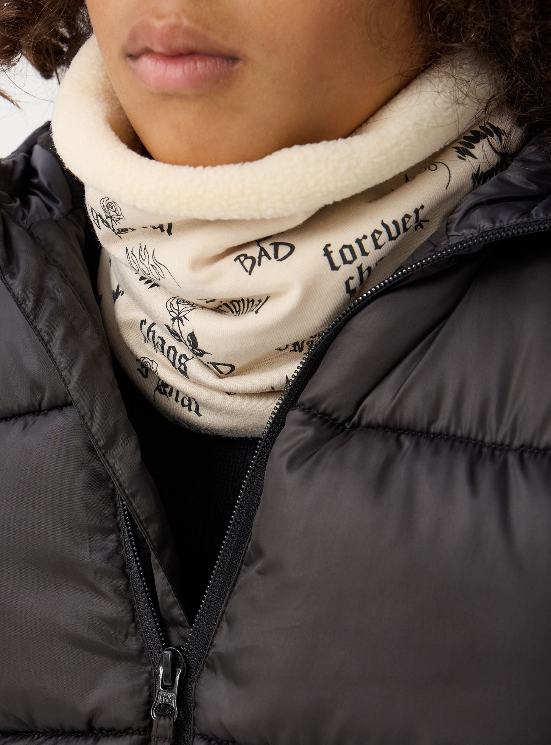 Scaldacollo da bambino double face. Da un lato è a tinta unita, mentre dall'altro presenta stampe in fantasia gotica, che include scritte audaci come "stay original", "forever chaos", "be unique", oltre a disegni di rose, fiamme e denti stilizzati. Perfetto per un look casual o streetwear.