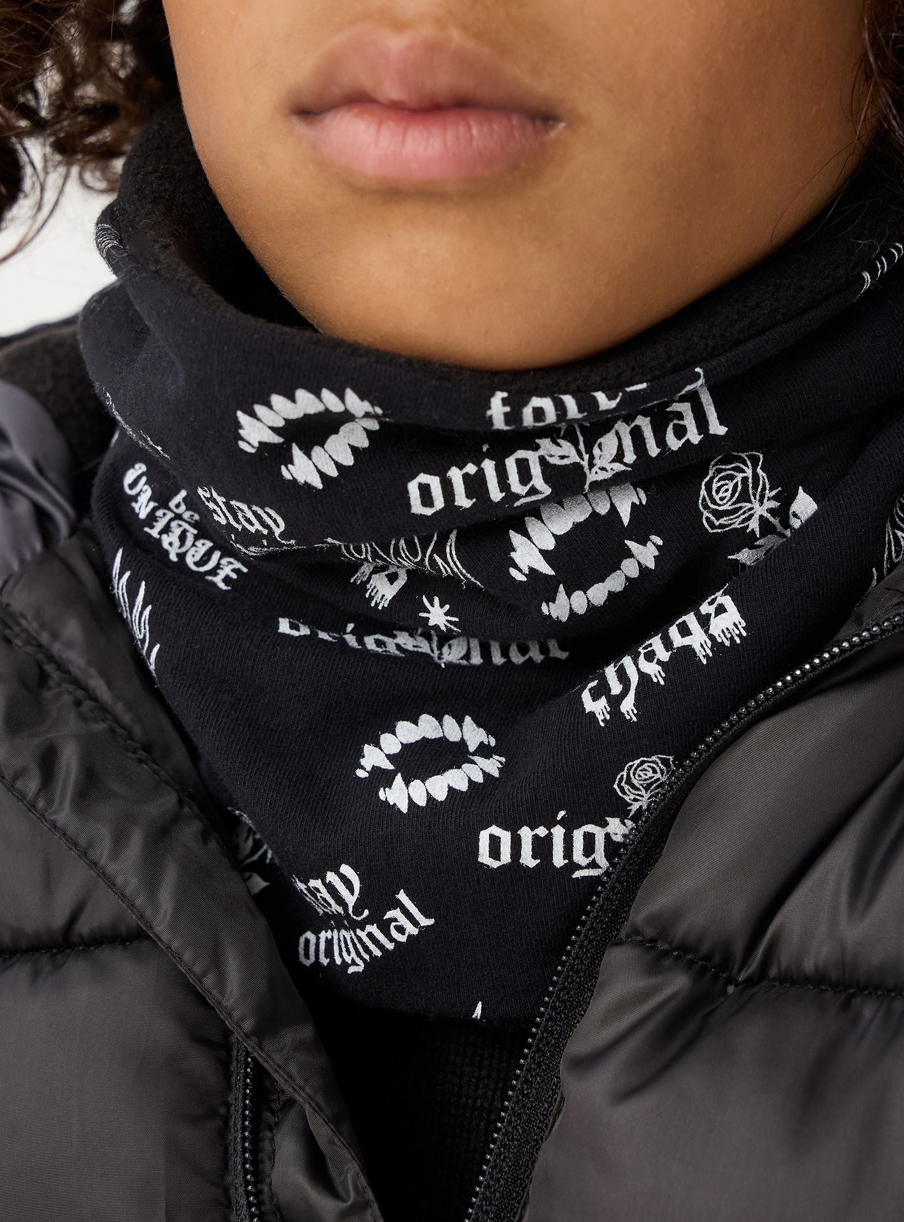 Scaldacollo da bambino double face. Da un lato è a tinta unita, mentre dall'altro presenta stampe in fantasia gotica, che include scritte audaci come "stay original", "forever chaos", "be unique", oltre a disegni di rose, fiamme e denti stilizzati. Perfetto per un look casual o streetwear.