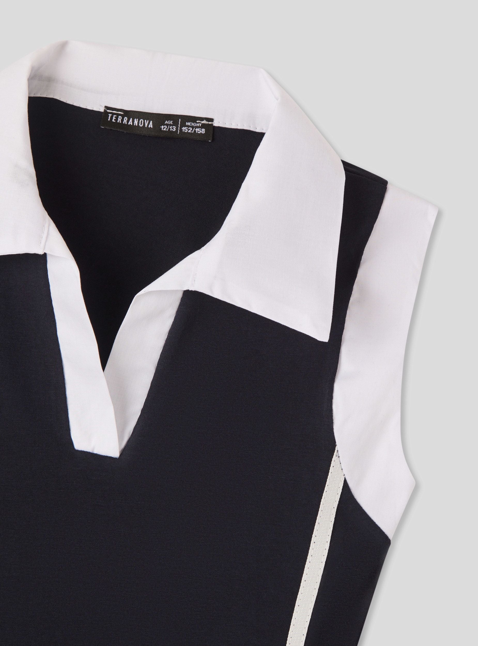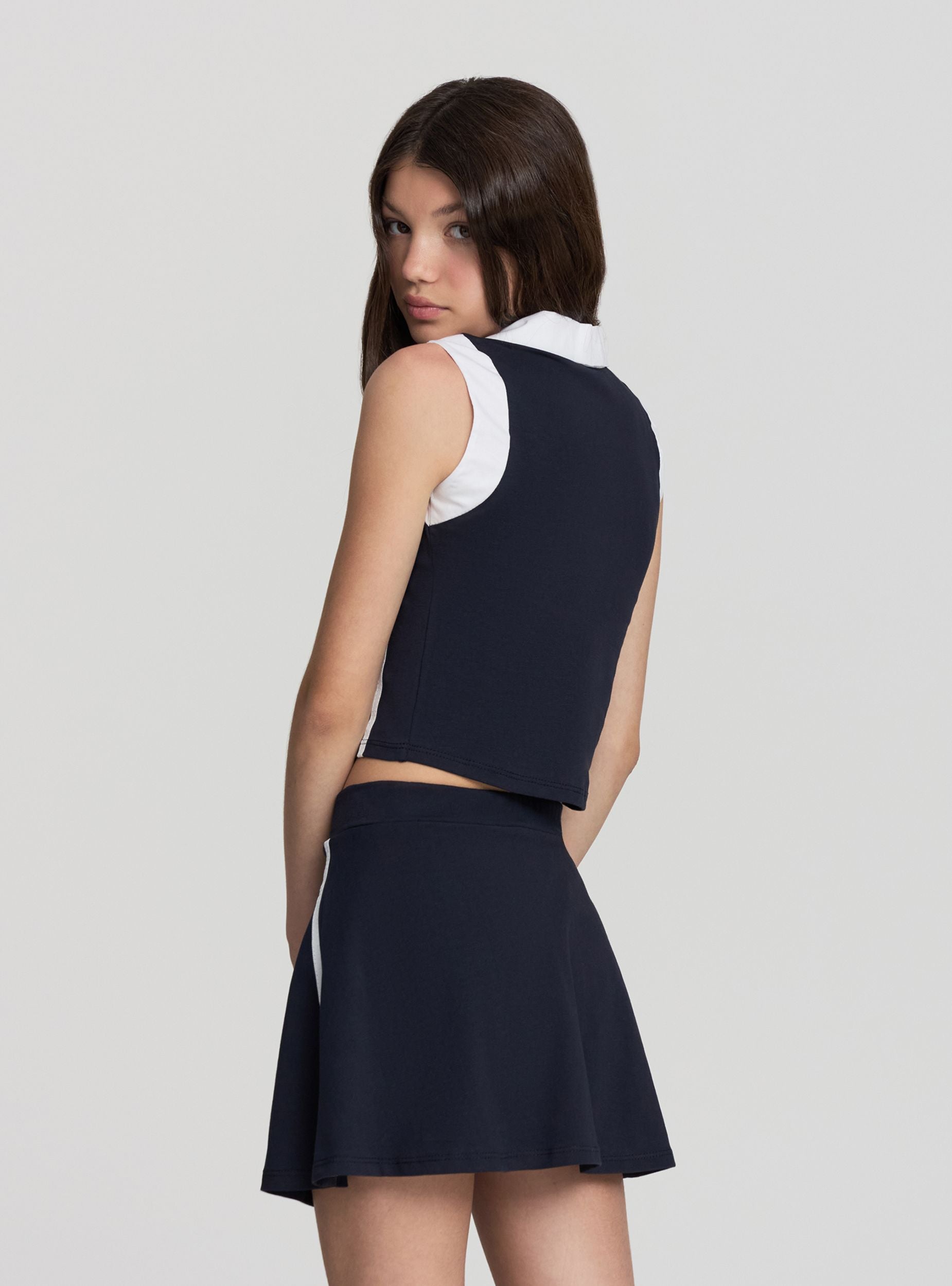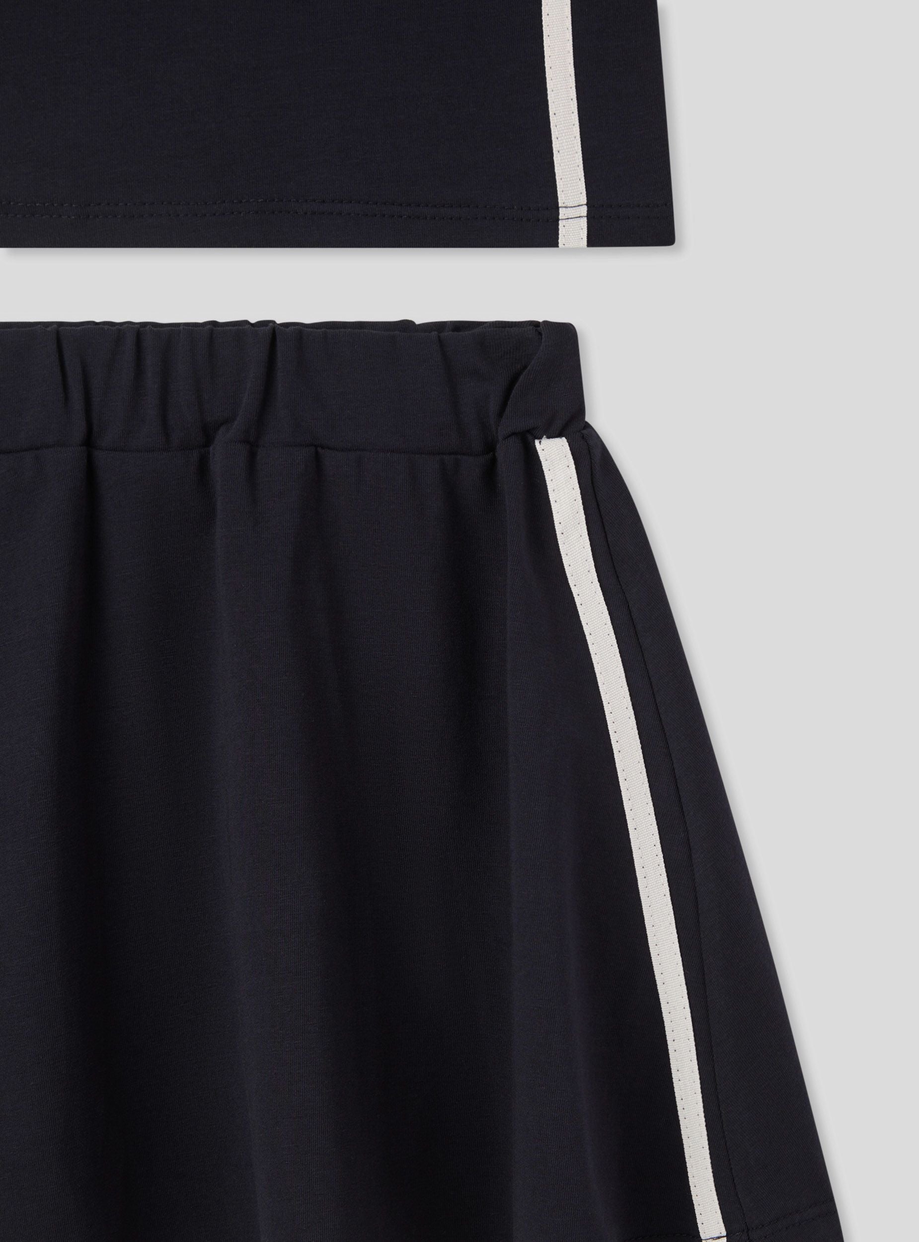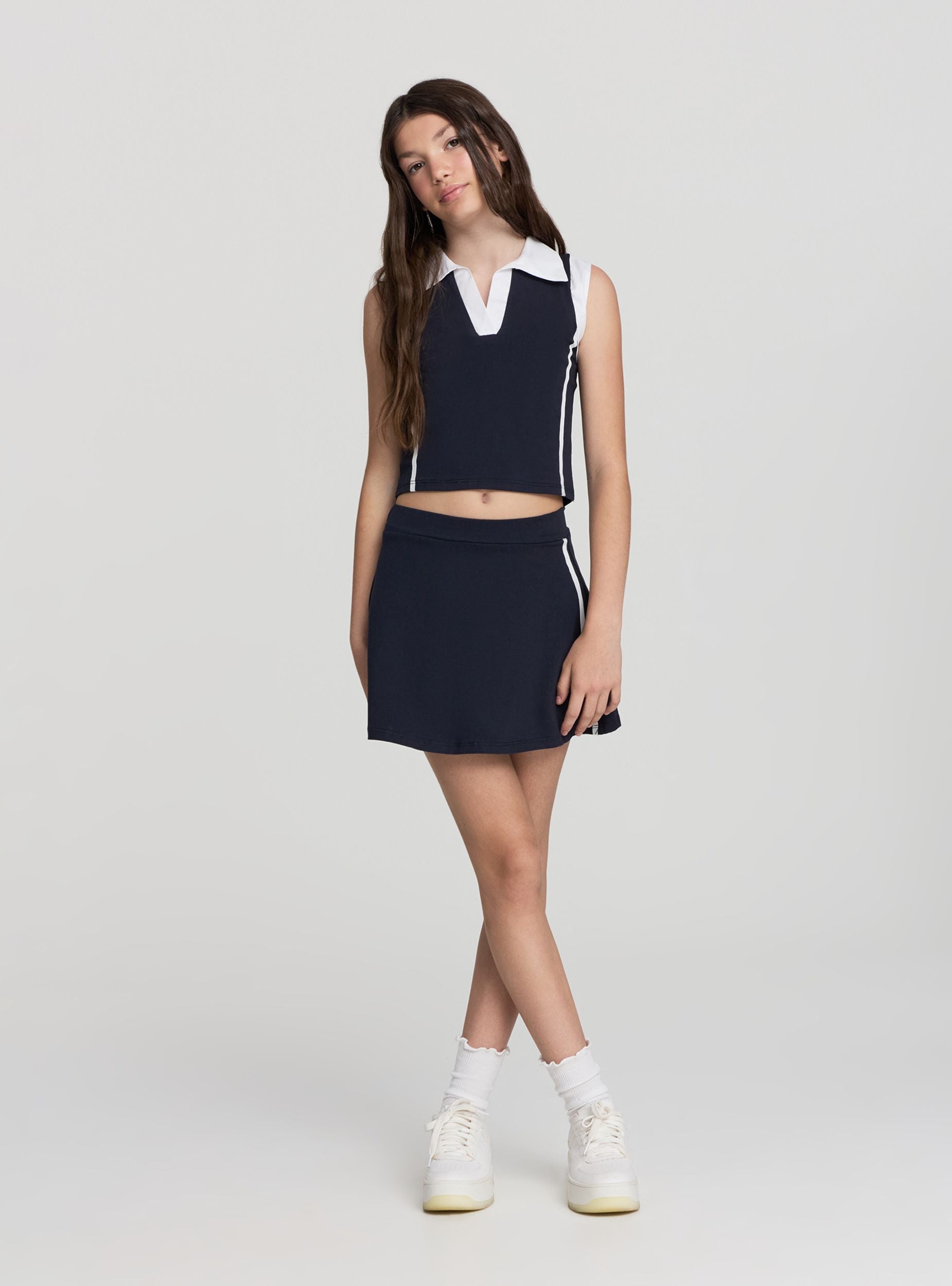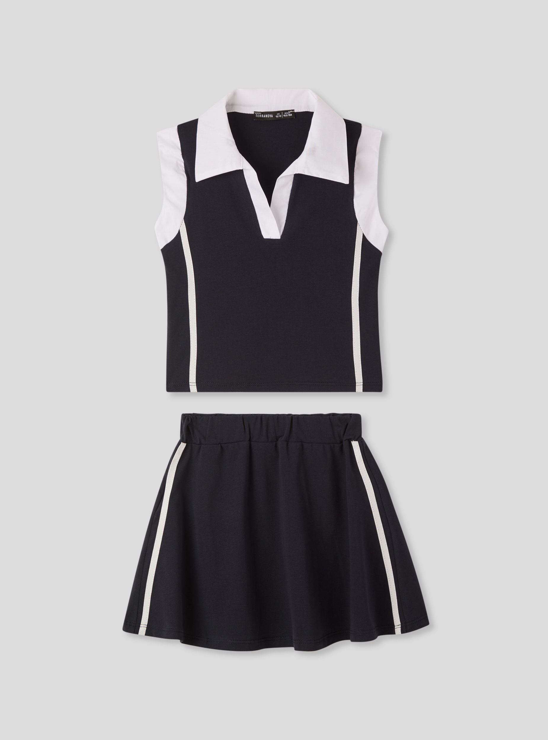 Set composto da top e gonna per bambina, ideale per look moderni e versatili. Il top presenta un colletto a camicia e scollo a V, senza maniche, con dettagli a contrasto e bande laterali che donano un tocco sportivo. La gonna, con elastico in vita, è arricchita da bande laterali coordinate. Perfetto per il tempo libero o occasioni informali, si abbina facilmente a sneakers o sandali.