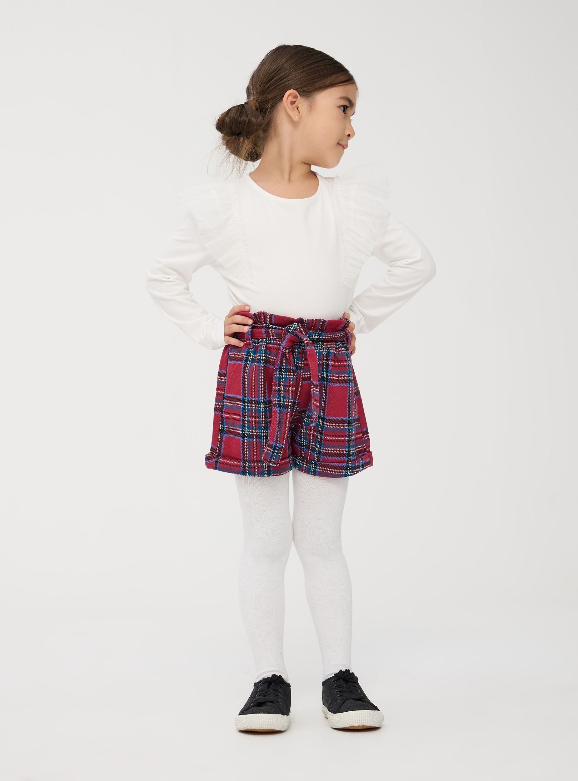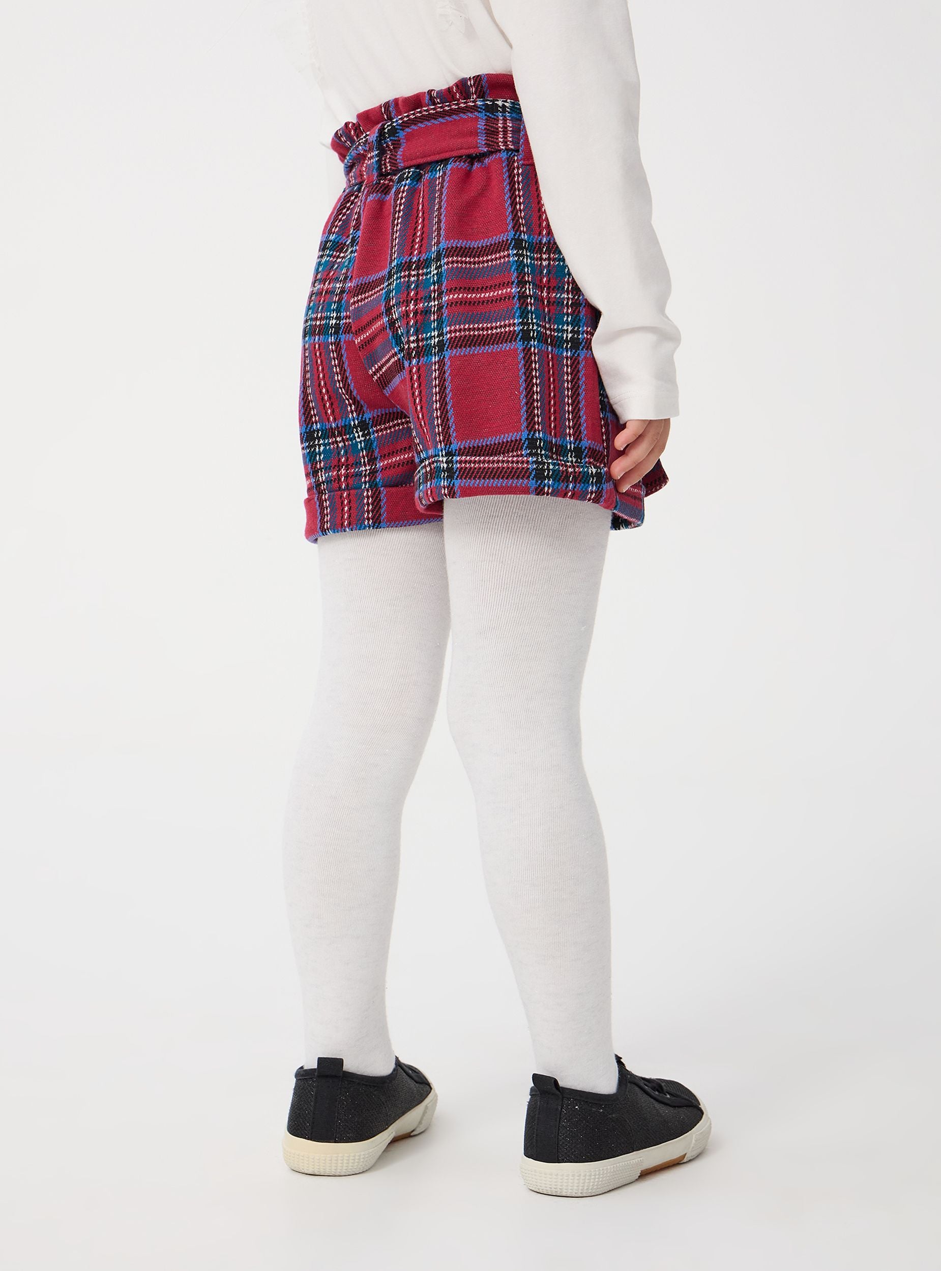 Pantaloncini da bambina con design a quadri scozzesi, caratterizzati da una fusciacca in vita che aggiunge un tocco di stile. La vita è arricciata e presenta passanti per la cintura. Il taglio è dritto con risvolti sull'orlo inferiore, conferendo un aspetto curato e alla moda. Ideali per aggiungere un elemento di eleganza al guardaroba invernale.Dettagli