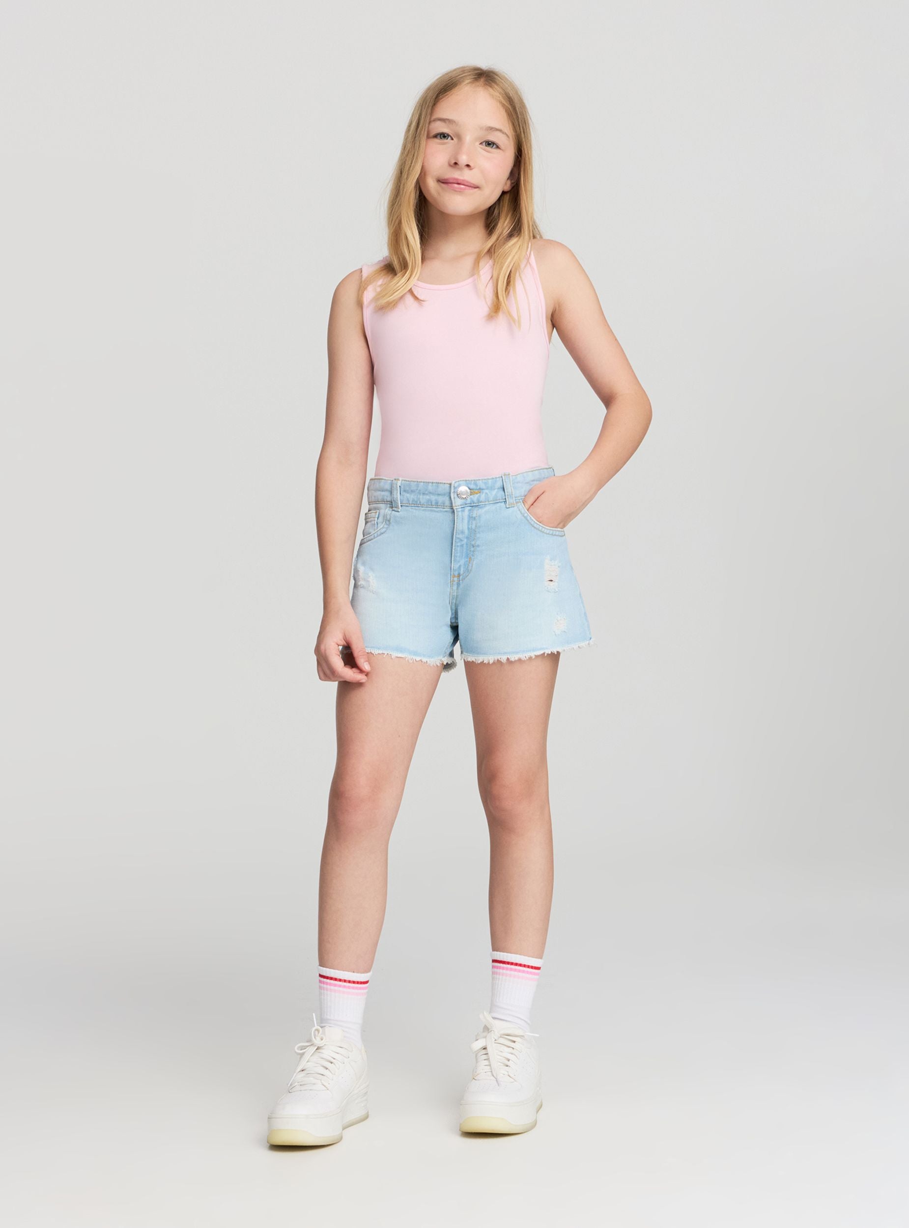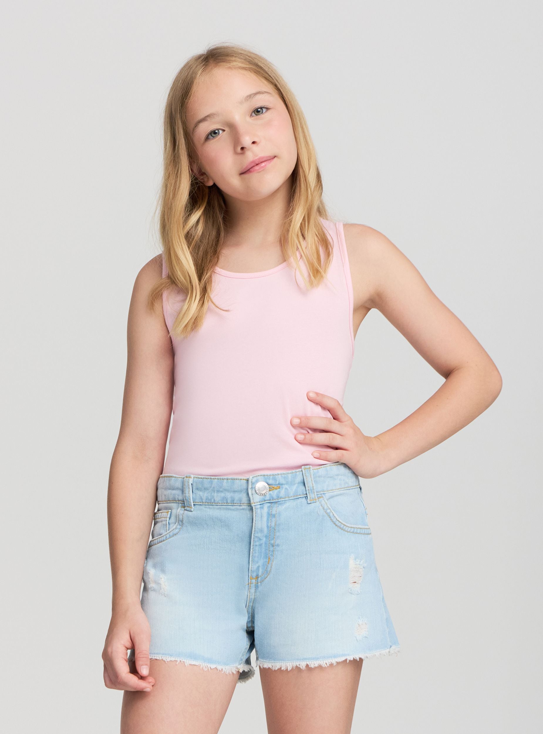 Pantaloncini da bambina pensati per le giornate estive più attive, questi shorts uniscono praticità e stile con un taglio moderno e dettagli vissuti. Le leggere rotture sul fronte e l’orlo sfrangiato aggiungono un tocco grintoso, perfetto per un look casual e di tendenza. Dotati di tasche sia davanti che sul retro, sono ideali da abbinare a t-shirt grafiche, top o felpe leggere per un outfit dinamico e alla moda, adatto al tempo libero o alle vacanze.
