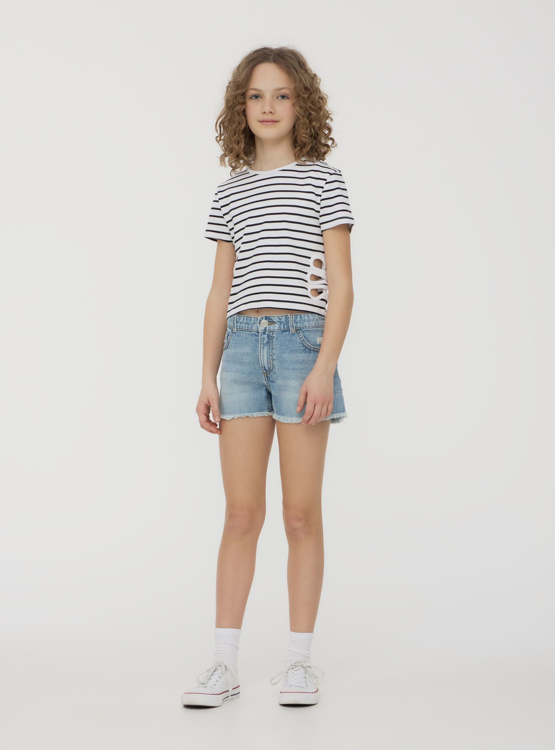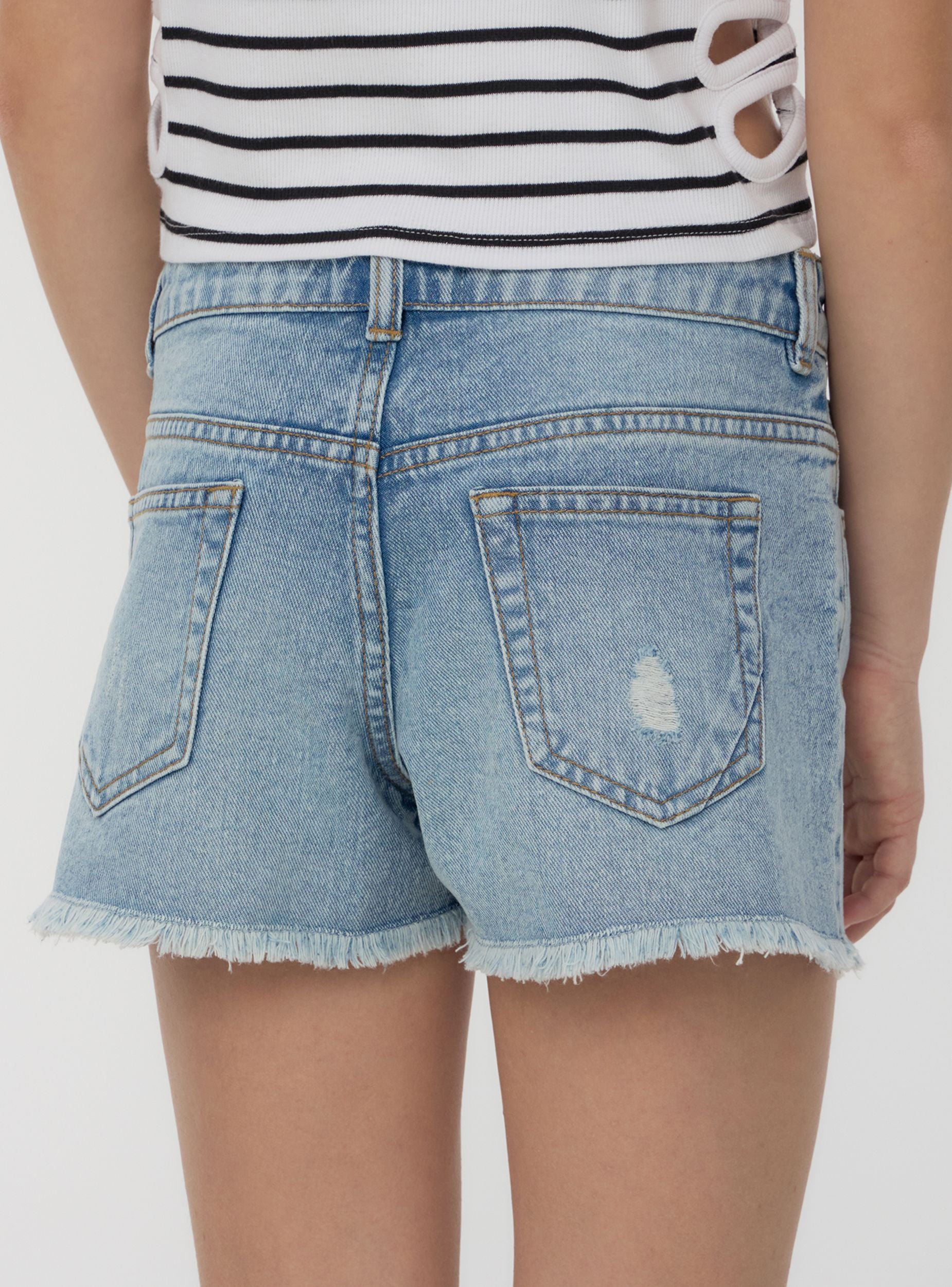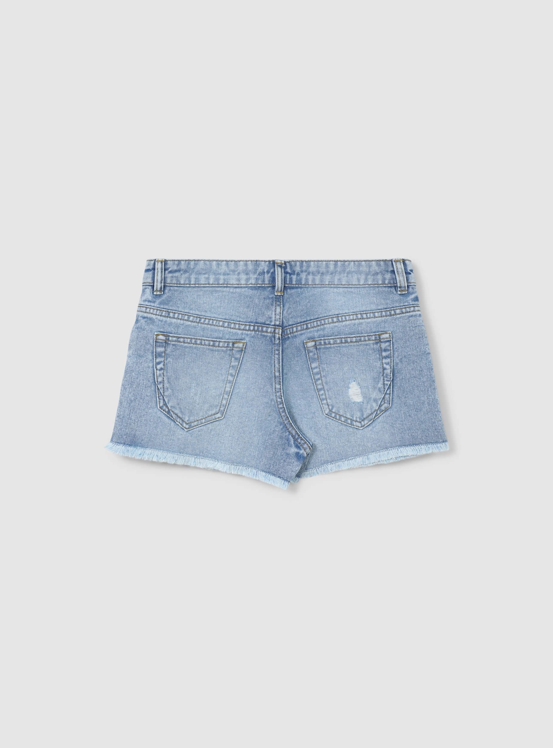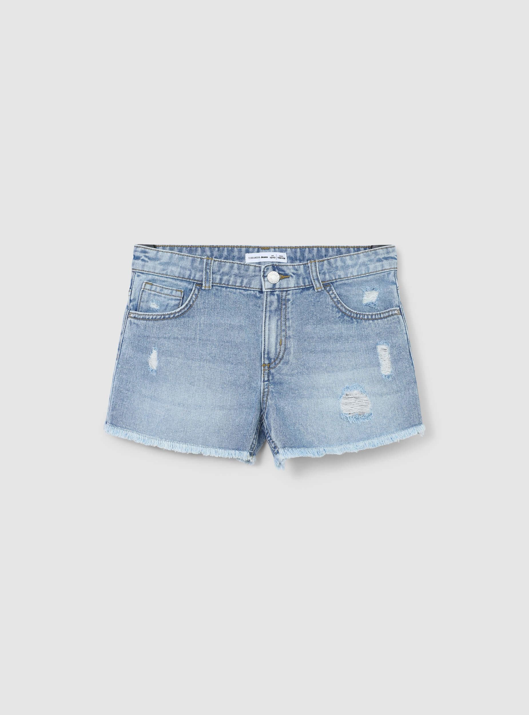 Pantaloncini in jeans da bambina perfetti per look estivi dal tocco casual e grintoso. Il lavaggio denim medio e i dettagli con piccoli strappi donano un aspetto moderno e di tendenza, mentre l'orlo sfrangiato aggiunge un tocco originale. Dotati di chiusura con bottone e zip, passanti in vita e cinque tasche, si abbinano perfettamente con t-shirt stampate e sneakers per un outfit comodo e stiloso. Ideali per il tempo libero, dal parco alla passeggiata in città.
