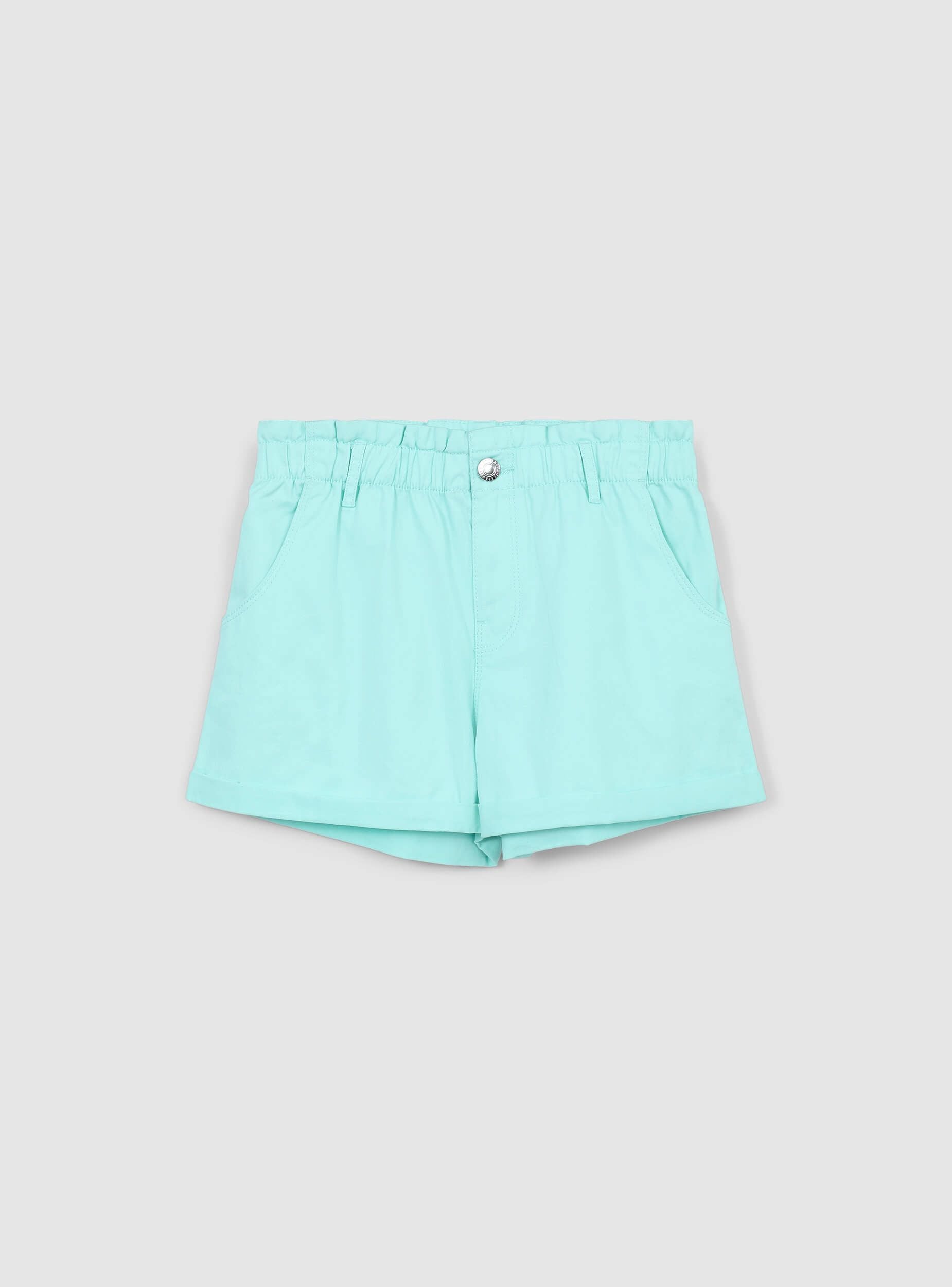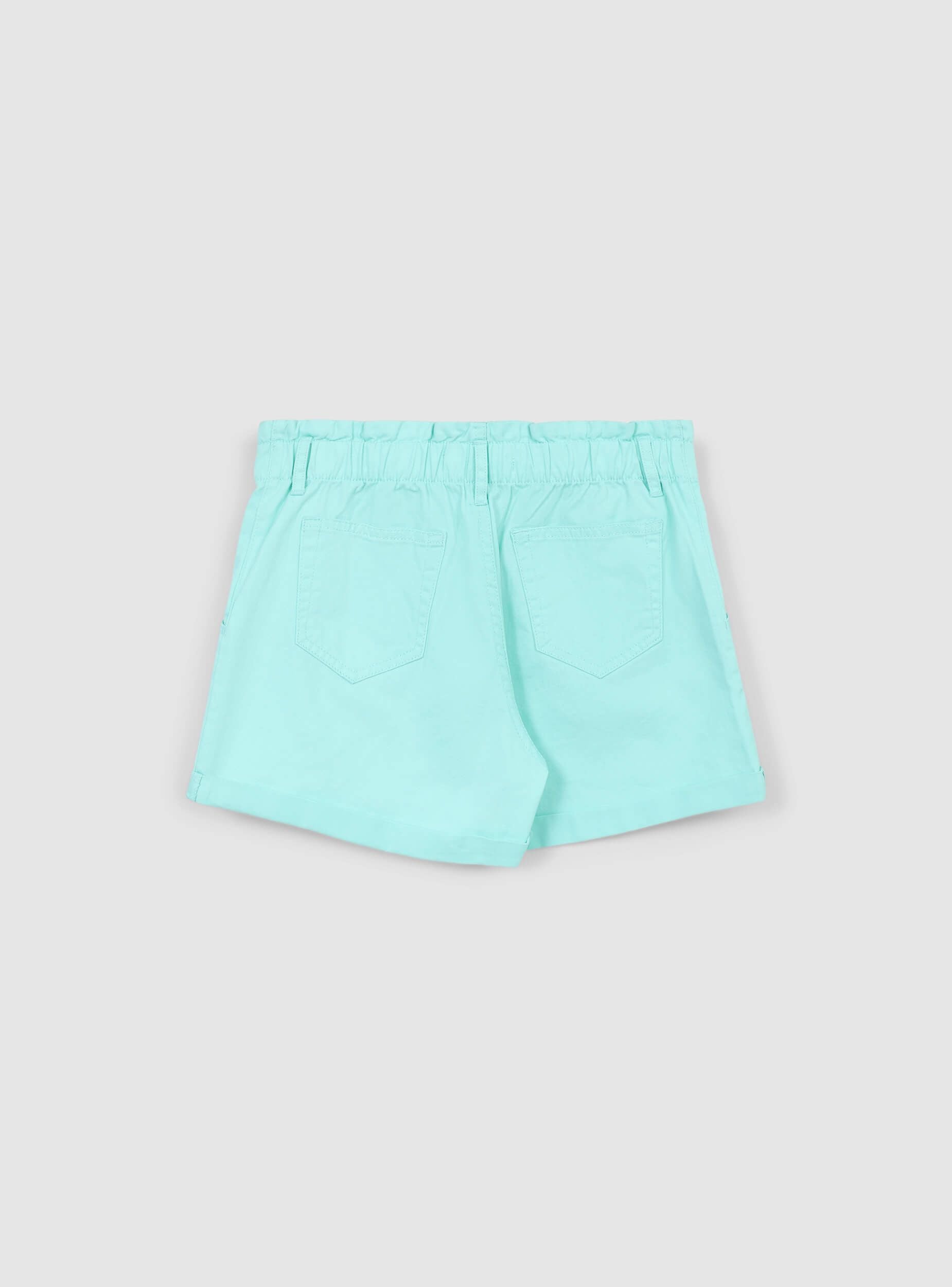Pantaloncini da bambina ideali per il tempo libero e le giornate estive. Il design paperbag dona un tocco di stile moderno, arricchito da una pratica chiusura con zip e bottone. Le tasche frontali e posteriori aggiungono funzionalità, mentre la tinta unita li rende versatili per ogni abbinamento.