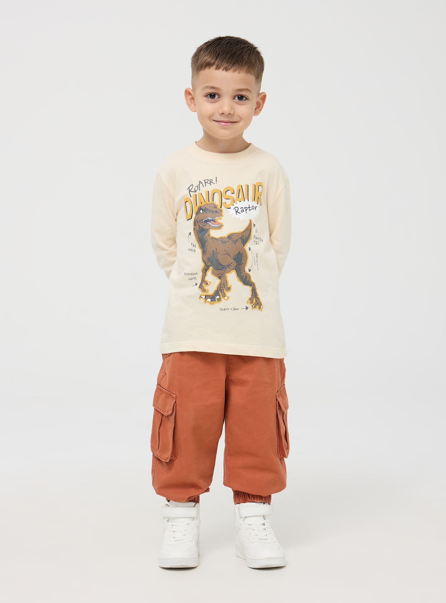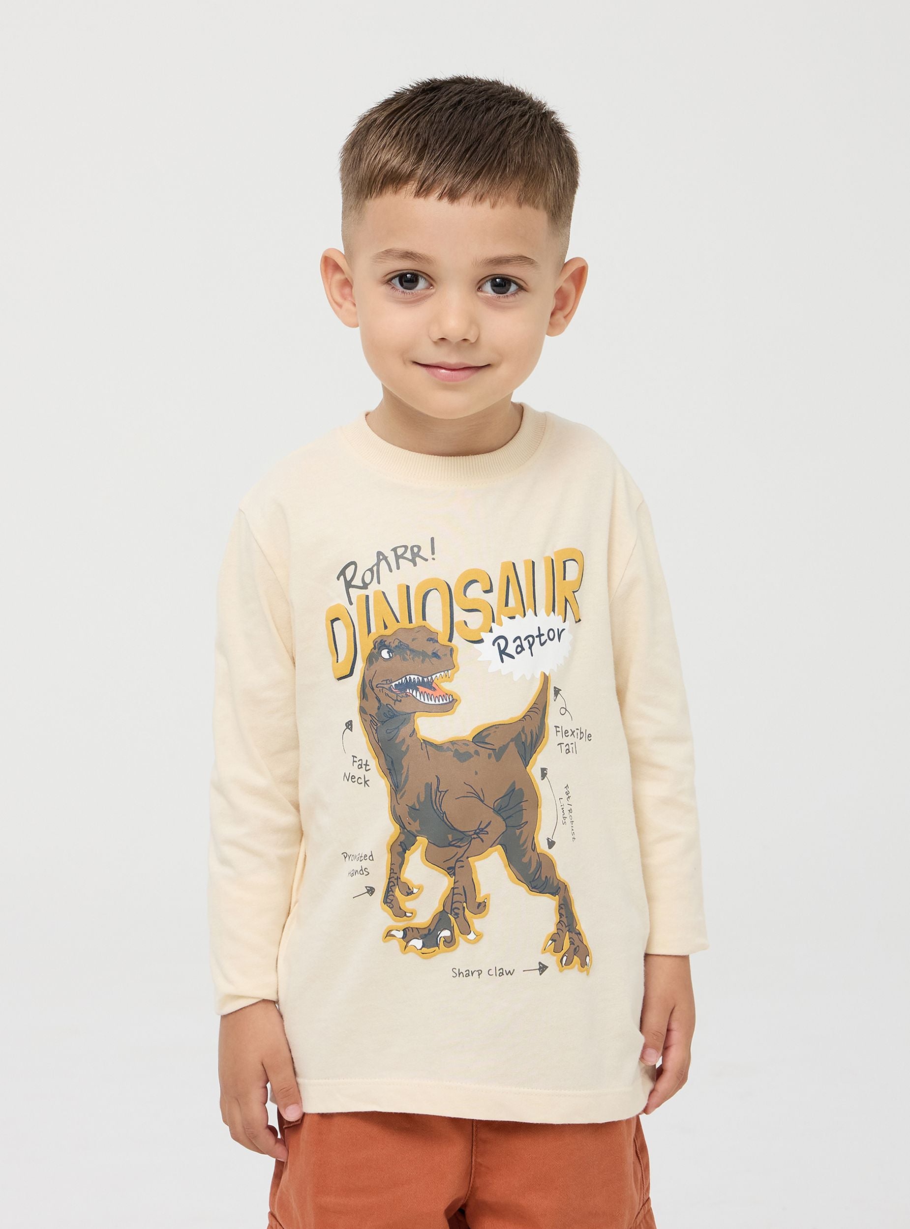 Maglia da bimbo con stampa dinosauro, la specie rappresentata è il velociraptor con alcune sue particolarità, per insegnare ai più piccoli in modo divertente. Modello girocollo con maniche lunghe. Perfetta per i look di tutti i giorni. Vestibilità regular.