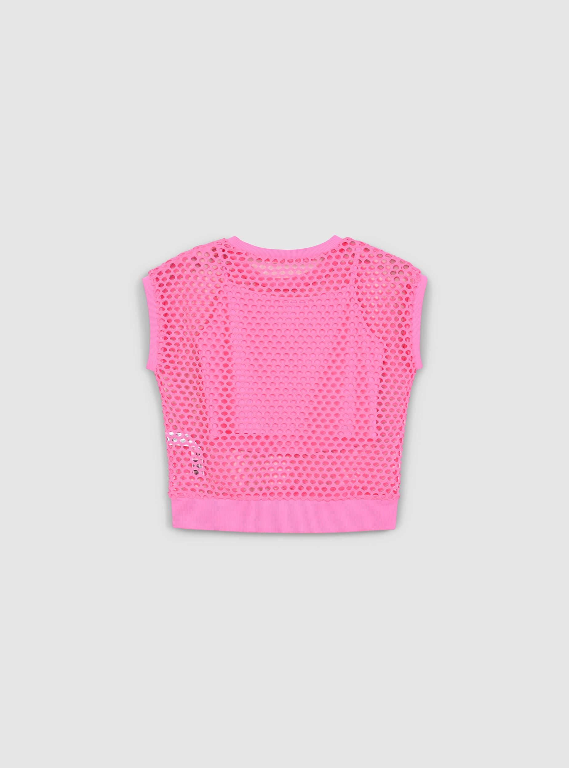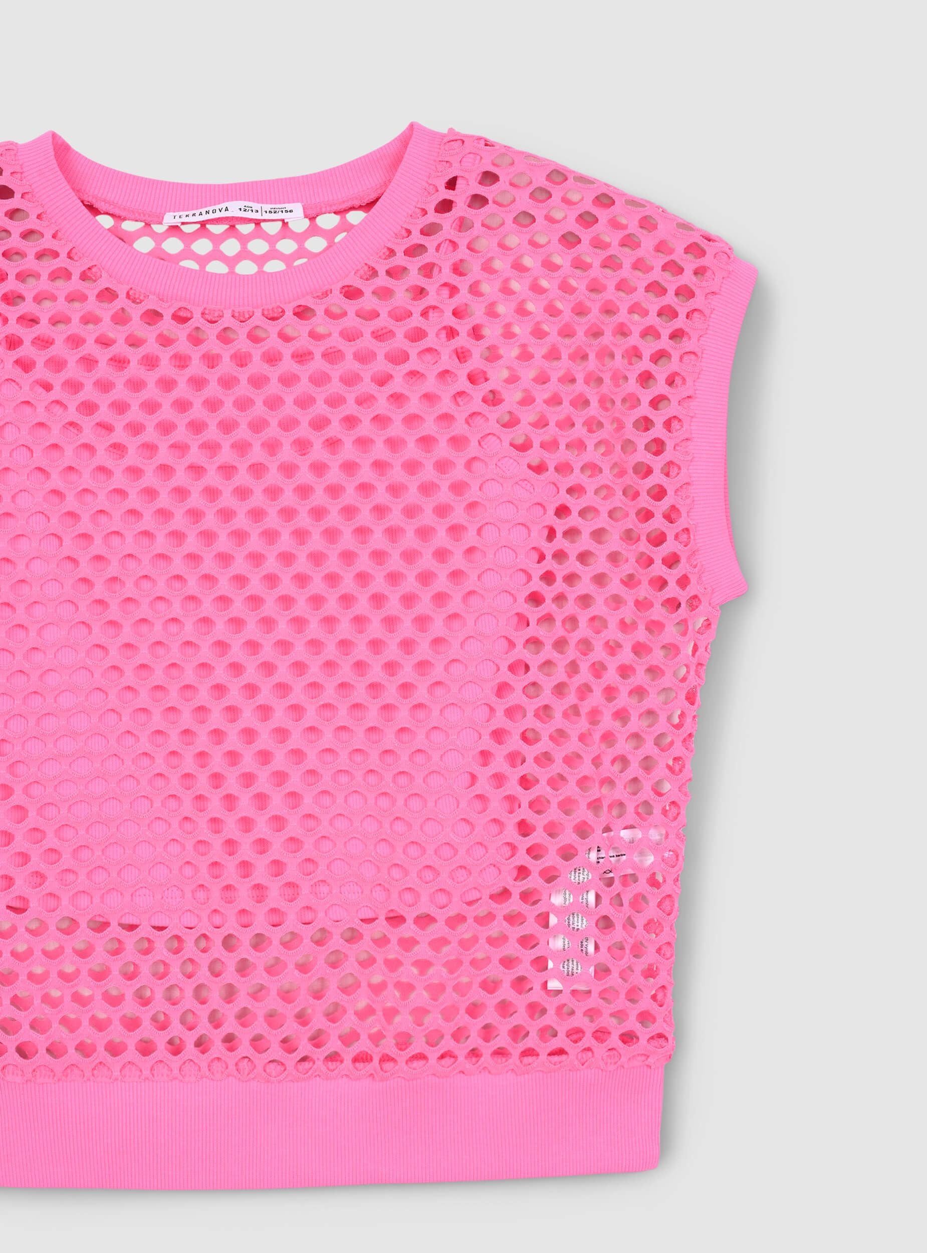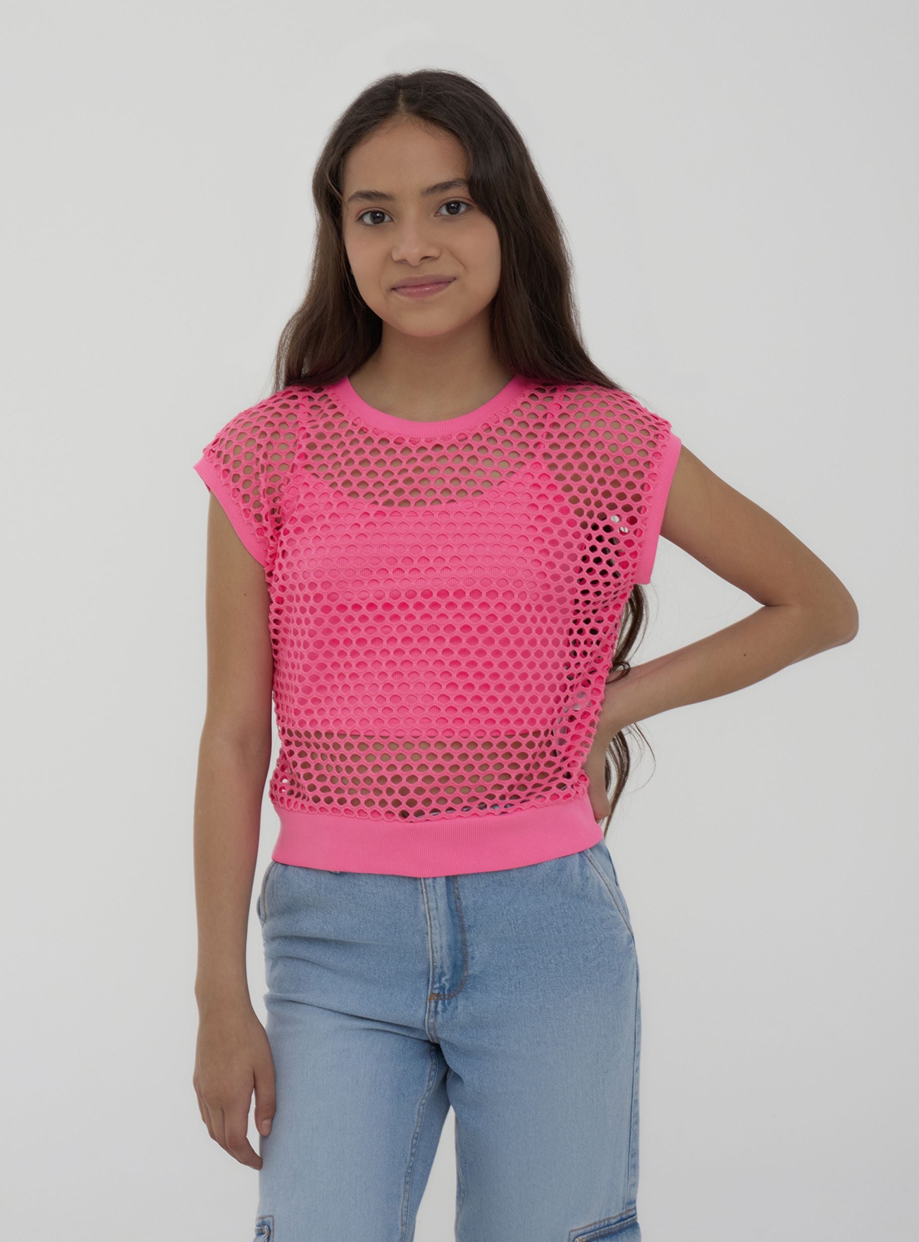 Maglietta da bambina dal design moderno e sportivo, perfetta per look freschi e dinamici. Il modello presenta maniche corte e girocollo, con un originale effetto doppio strato dato dalla struttura a rete con canotta integrata. Questa combinazione garantisce comfort e traspirabilità, rendendola ideale per il tempo libero e le giornate più calde. Perfetta da abbinare a shorts, jeans o leggings per un outfit trendy e versatile, adatto a ogni occasione casual.Dettagli