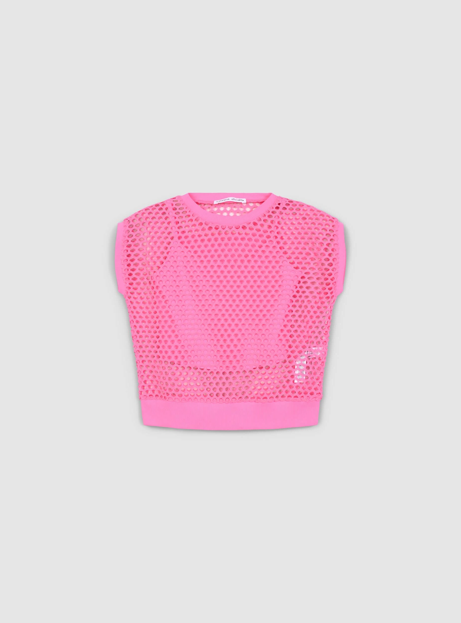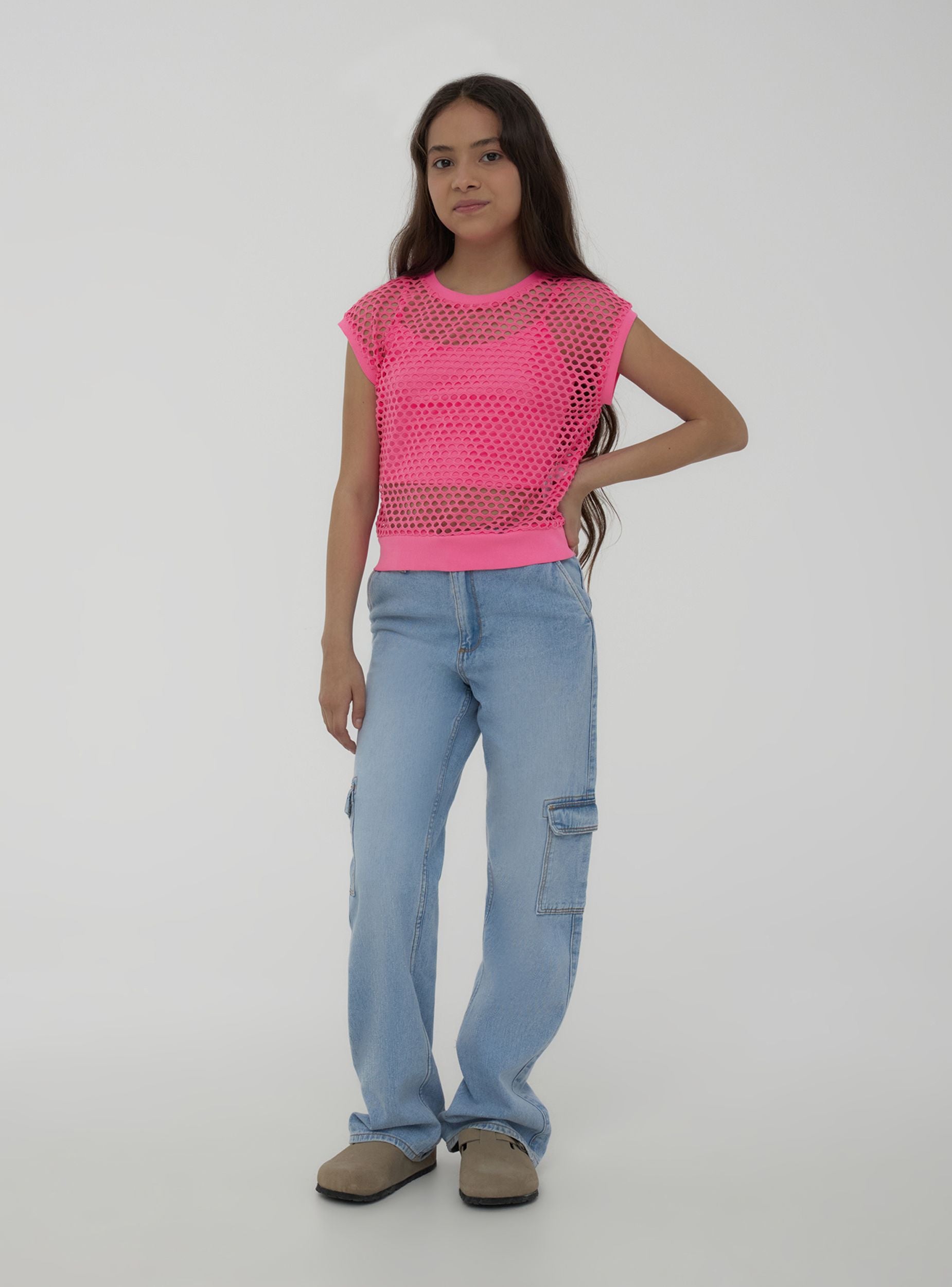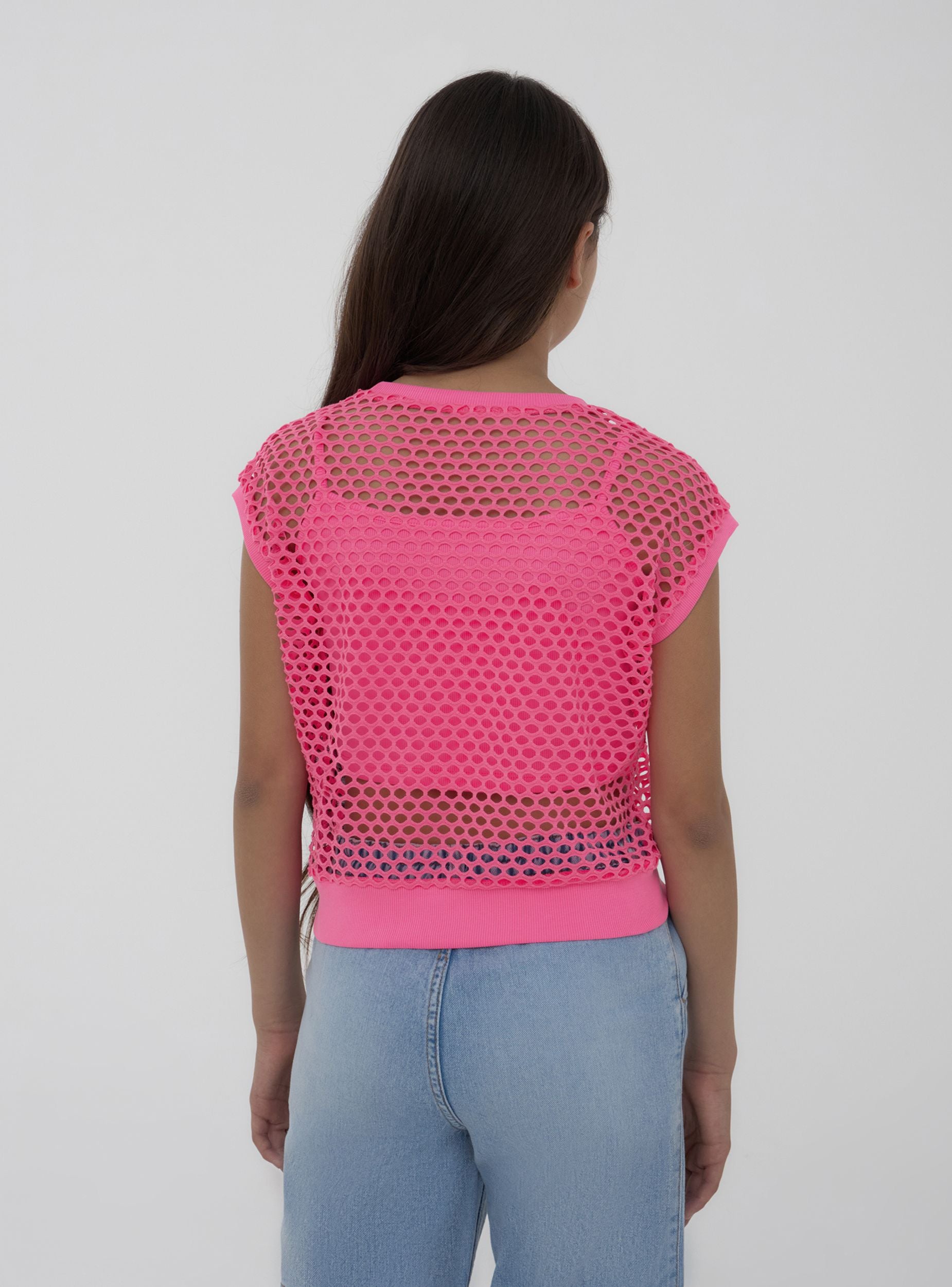Maglietta da bambina dal design moderno e sportivo, perfetta per look freschi e dinamici. Il modello presenta maniche corte e girocollo, con un originale effetto doppio strato dato dalla struttura a rete con canotta integrata. Questa combinazione garantisce comfort e traspirabilità, rendendola ideale per il tempo libero e le giornate più calde. Perfetta da abbinare a shorts, jeans o leggings per un outfit trendy e versatile, adatto a ogni occasione casual.Dettagli