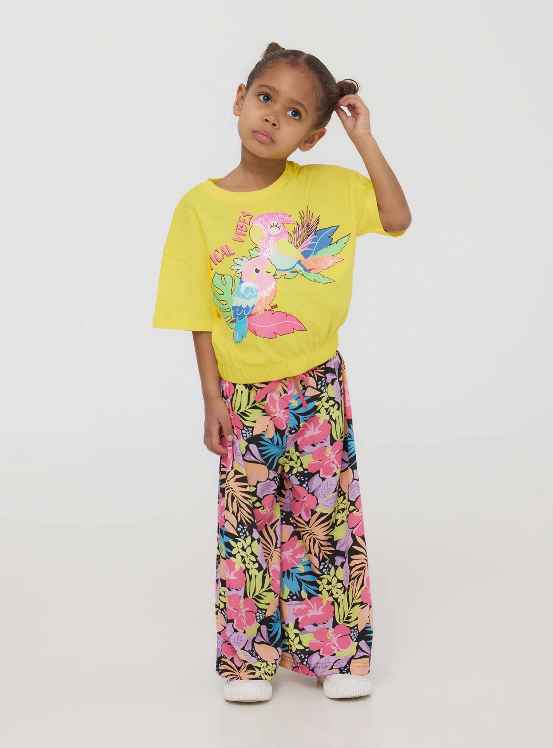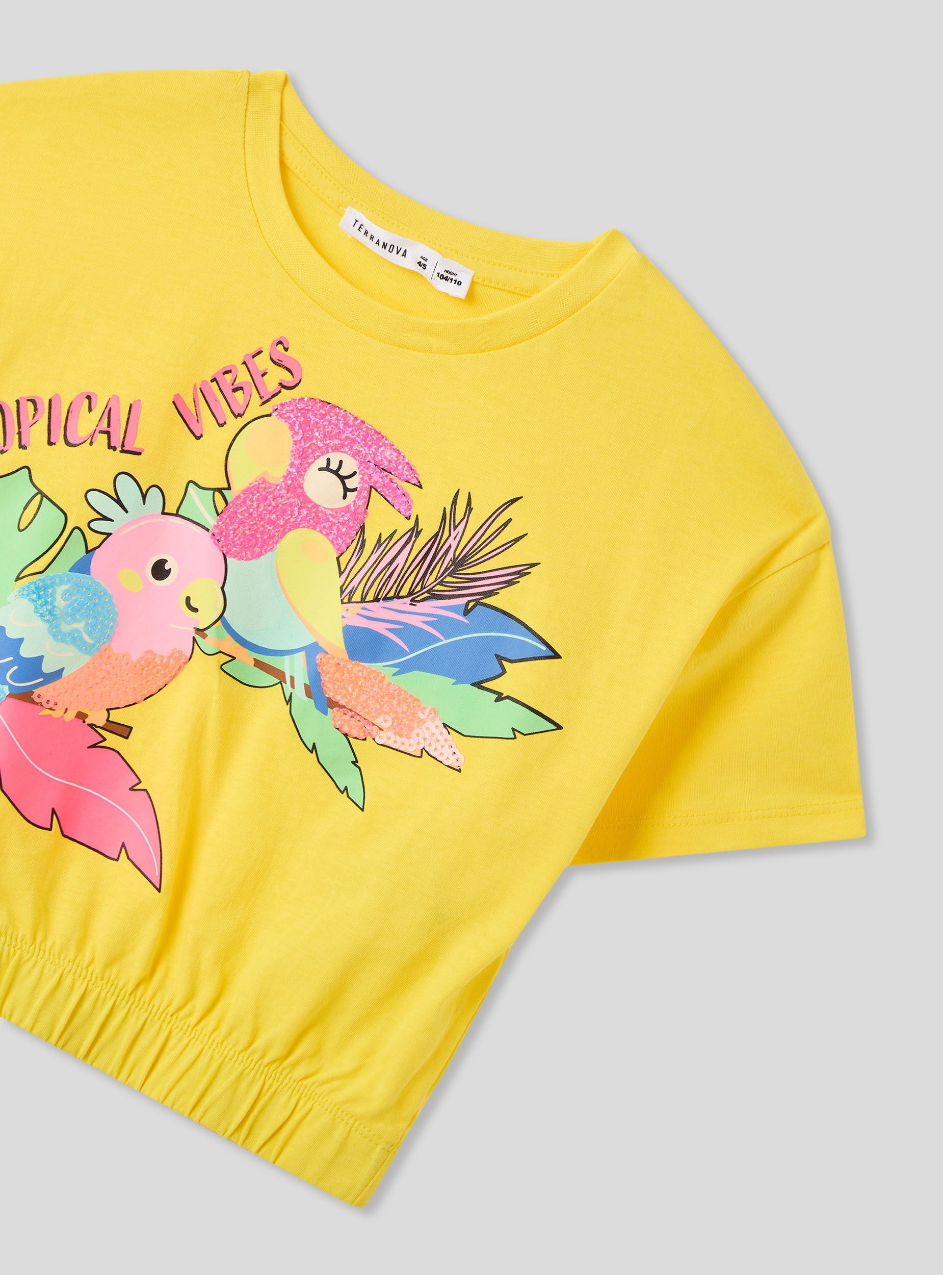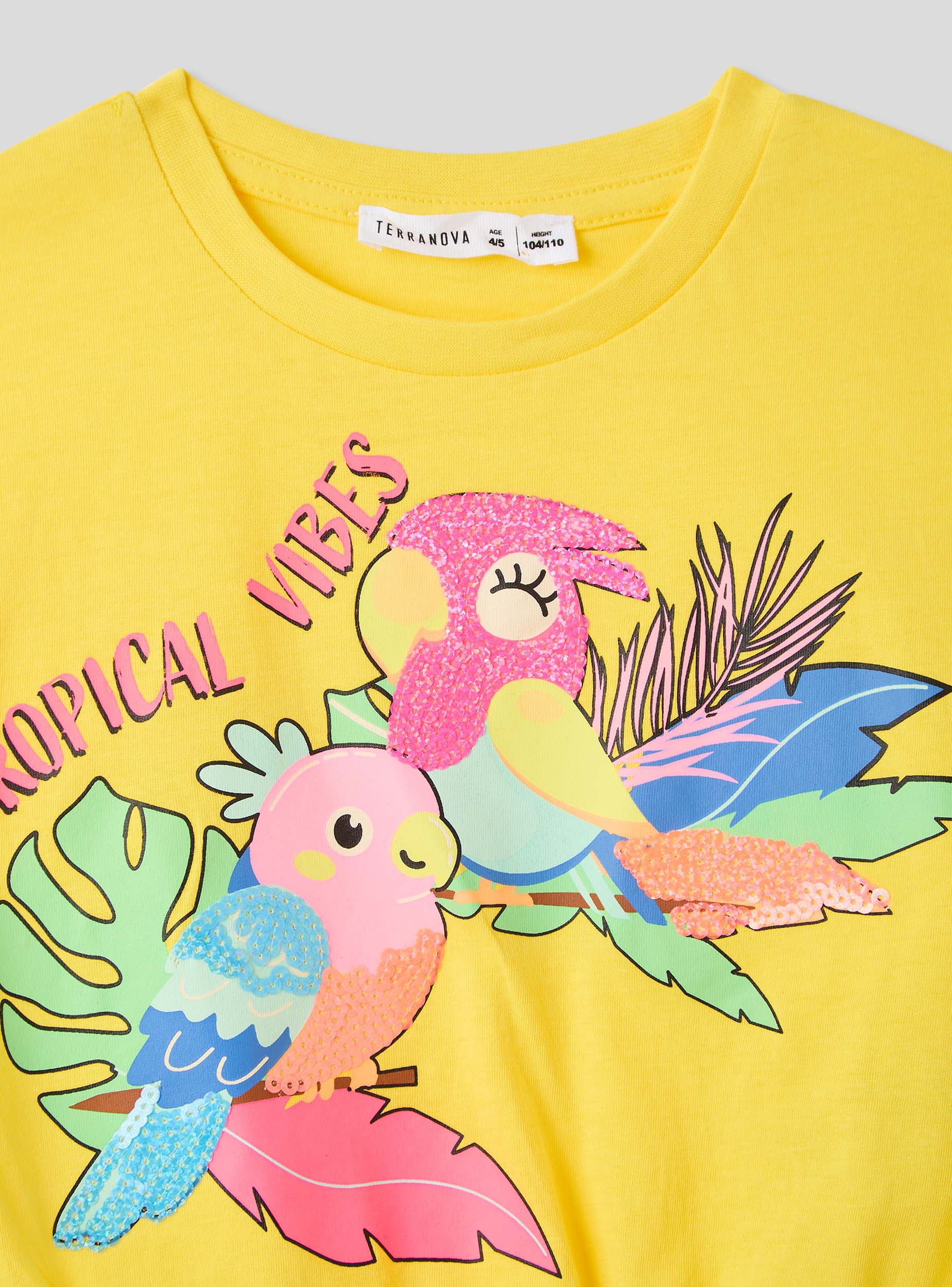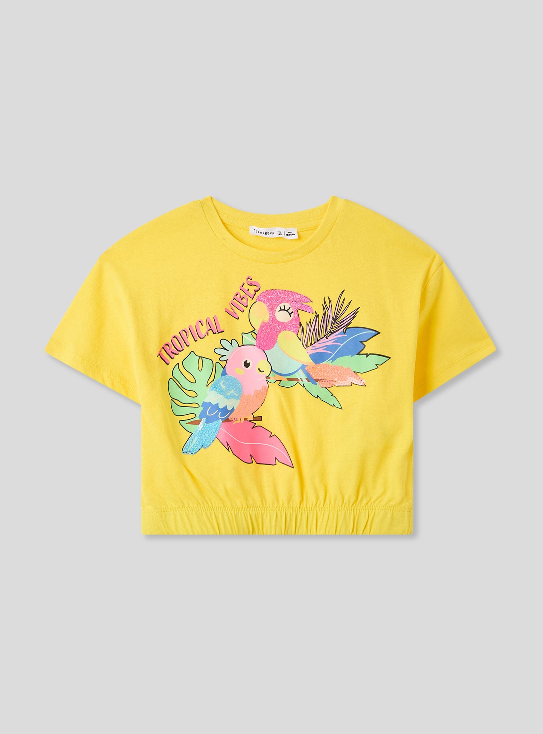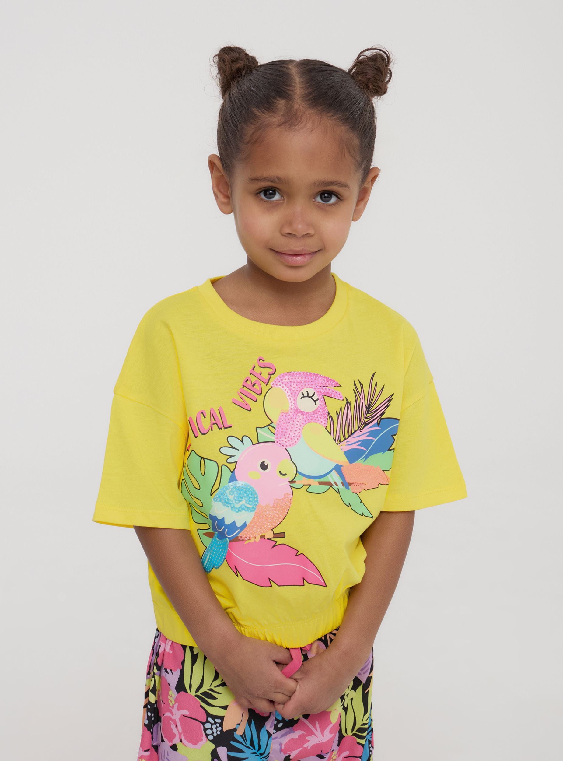 Maglietta da bimba dal design allegro e vivace, perfetta per aggiungere un tocco tropicale al guardaroba estivo. Le maniche corte e il girocollo assicurano comfort e libertà di movimento, mentre l'elastico sul fondo regala una vestibilità moderna e dinamica. La stampa con pappagalli colorati e dettagli in paillettes dona un effetto scintillante, ideale per look spensierati e giocosi. Da indossare con shorts in denim e sandali per un outfit fresco e alla moda, perfetto per il tempo libero e le giornate all'aria aperta.
