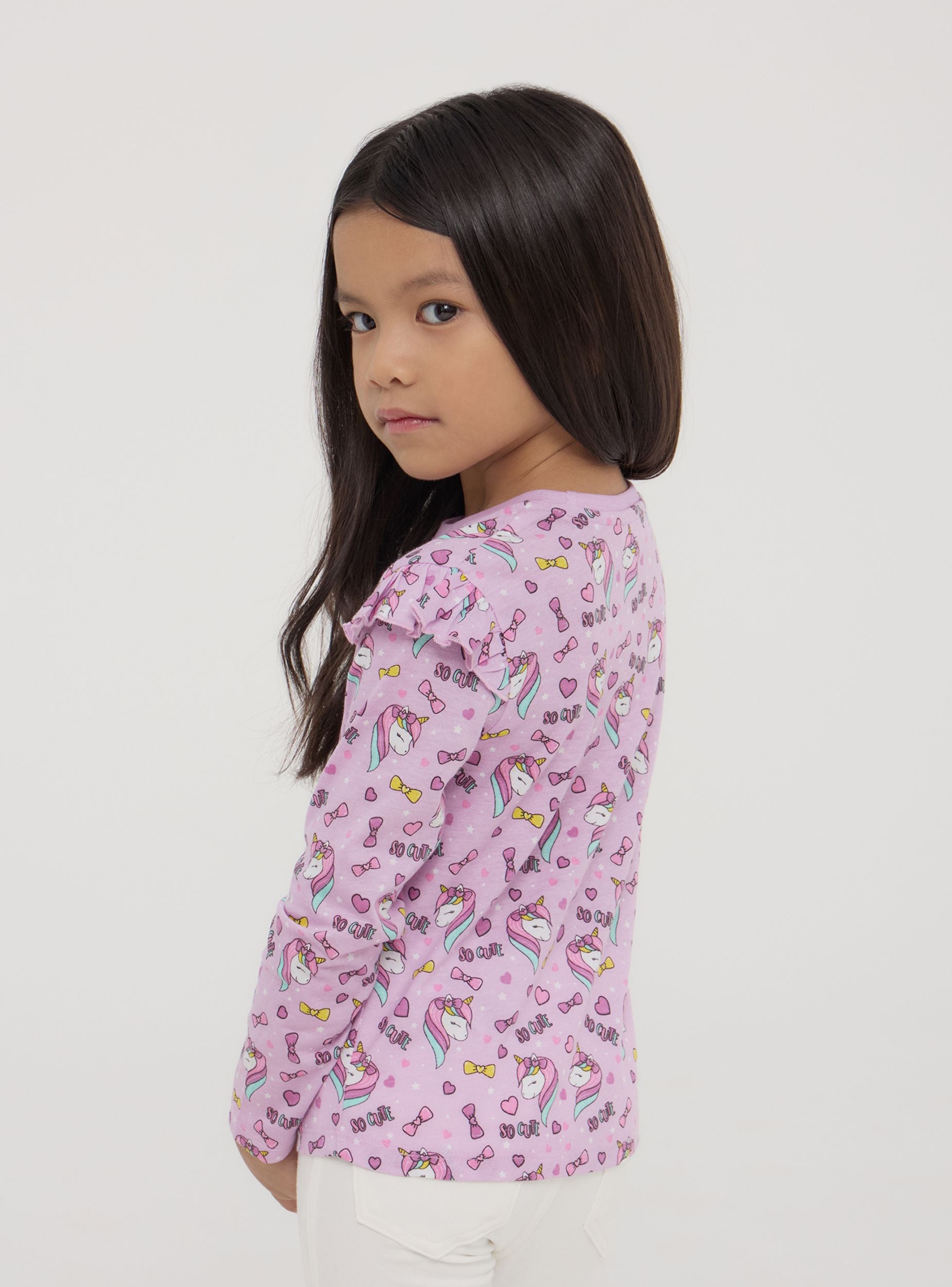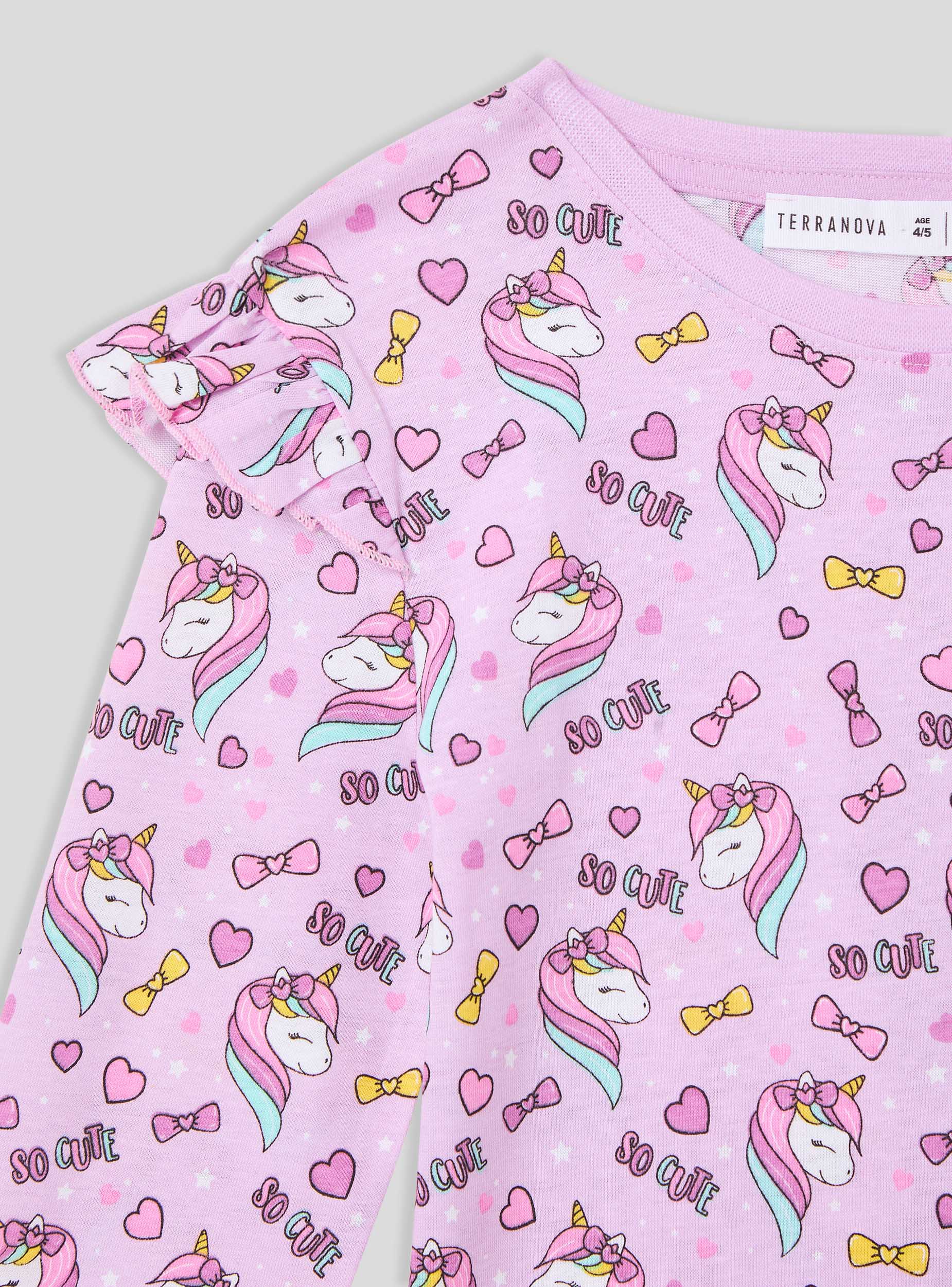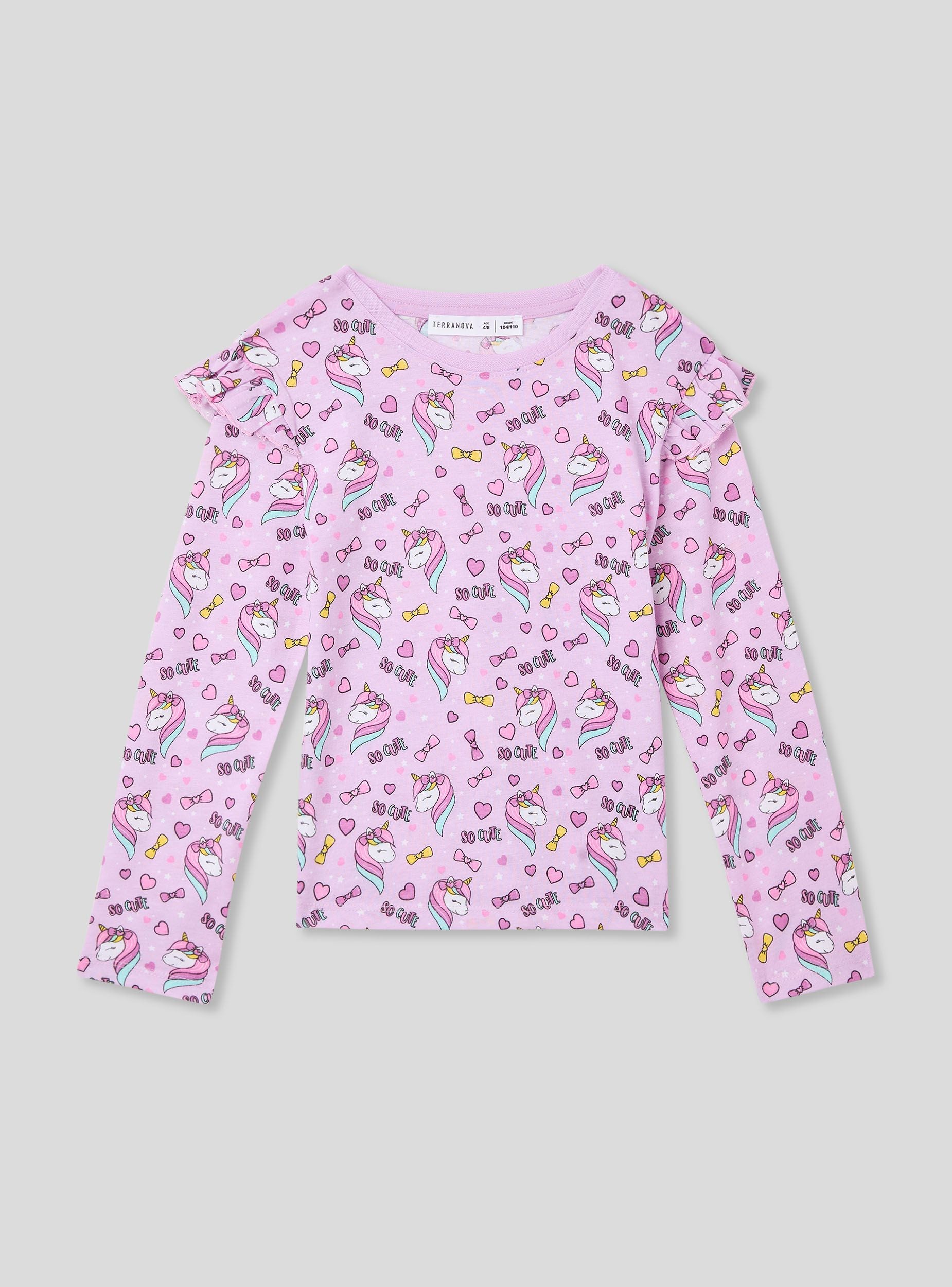 Maglia da bimba con un'adorabile fantasia di piccoli unicorni colorati, fiocchi, cuori e la scritta "So Cute" sparsi su tutta la superficie del capo. Il modello presenta un girocollo e comode maniche lunghe, perfette per le stagioni più fresche. Un dettaglio femminile è dato dai volant sulle spalle, che aggiungono un tocco giocoso e sbarazzino. Ideale per le piccole che amano i disegni allegri e vivaci, questa maglia è perfetta per il tempo libero o per momenti di gioco.