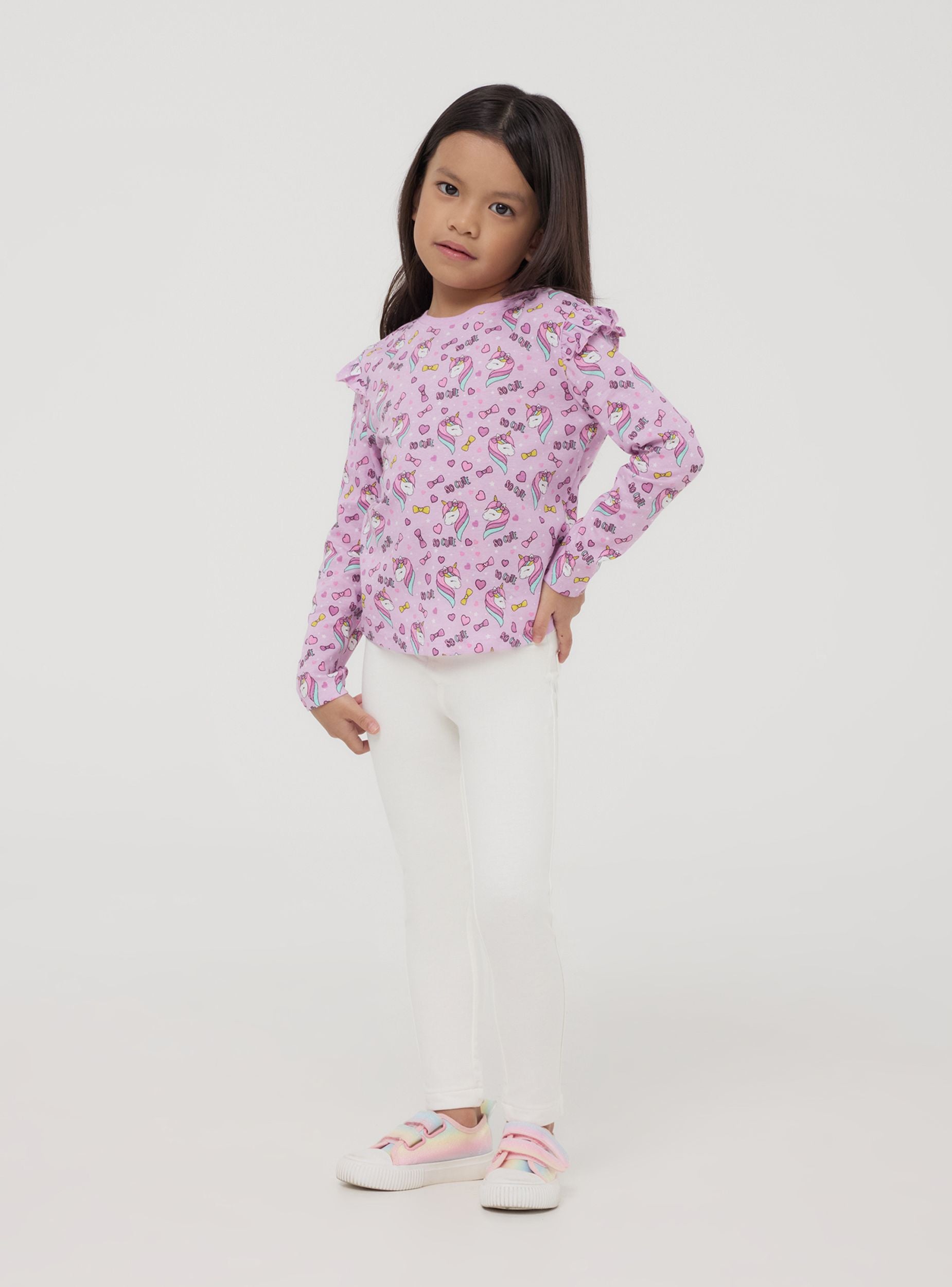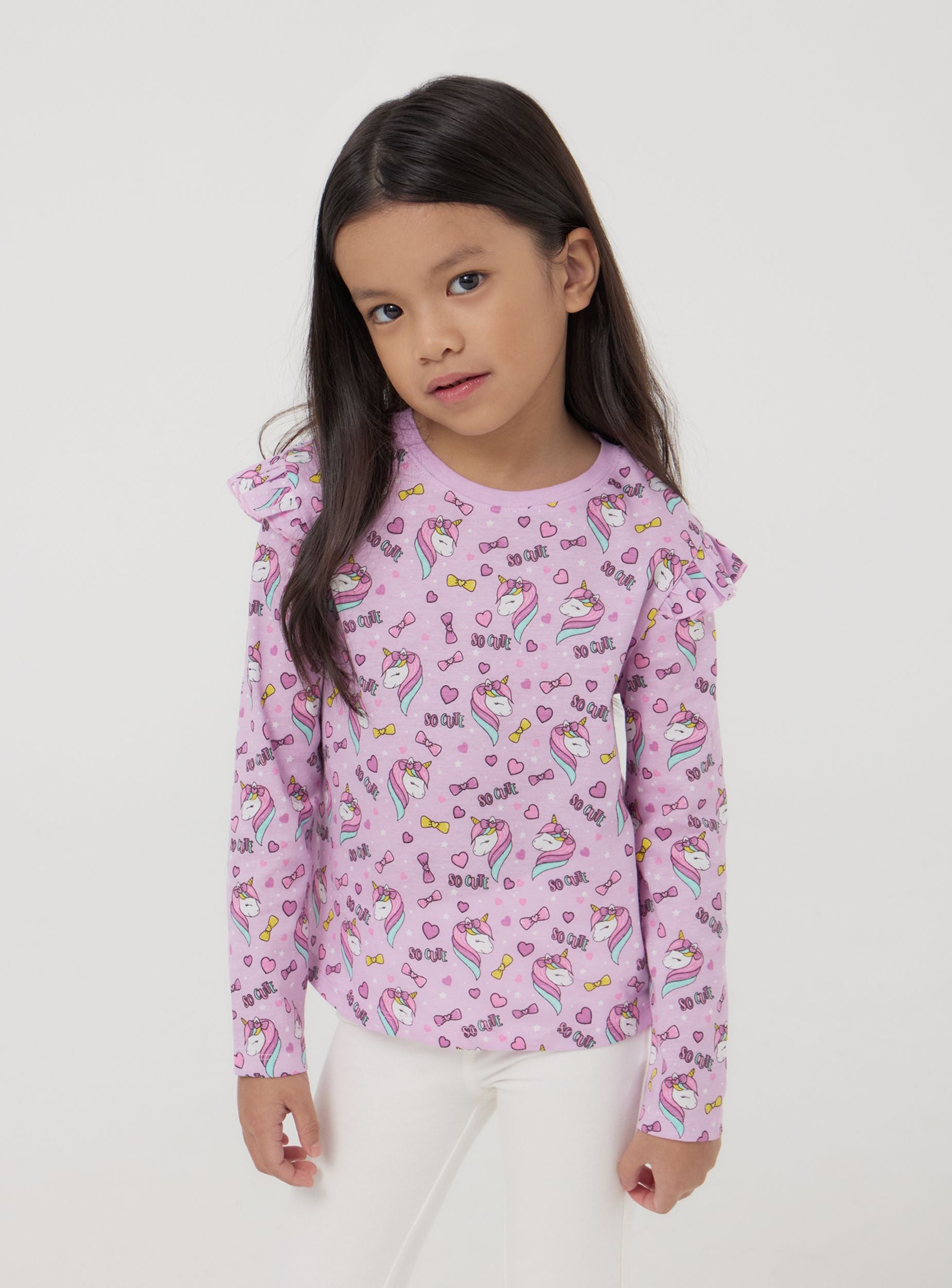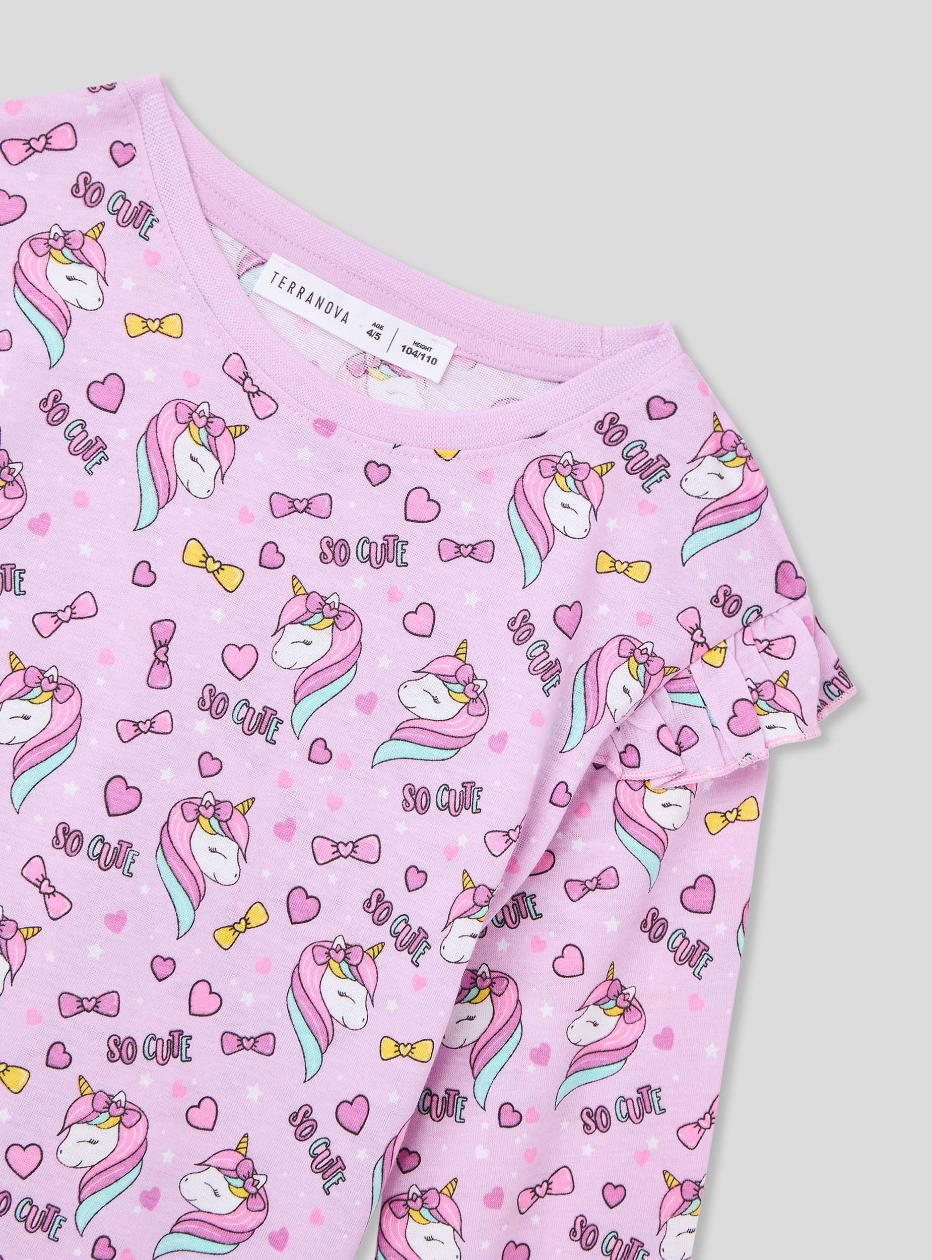 Maglia da bimba con un'adorabile fantasia di piccoli unicorni colorati, fiocchi, cuori e la scritta "So Cute" sparsi su tutta la superficie del capo. Il modello presenta un girocollo e comode maniche lunghe, perfette per le stagioni più fresche. Un dettaglio femminile è dato dai volant sulle spalle, che aggiungono un tocco giocoso e sbarazzino. Ideale per le piccole che amano i disegni allegri e vivaci, questa maglia è perfetta per il tempo libero o per momenti di gioco.