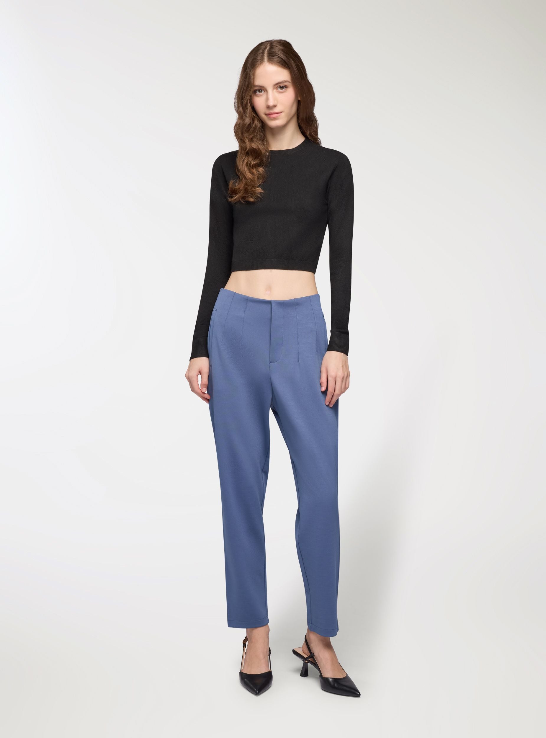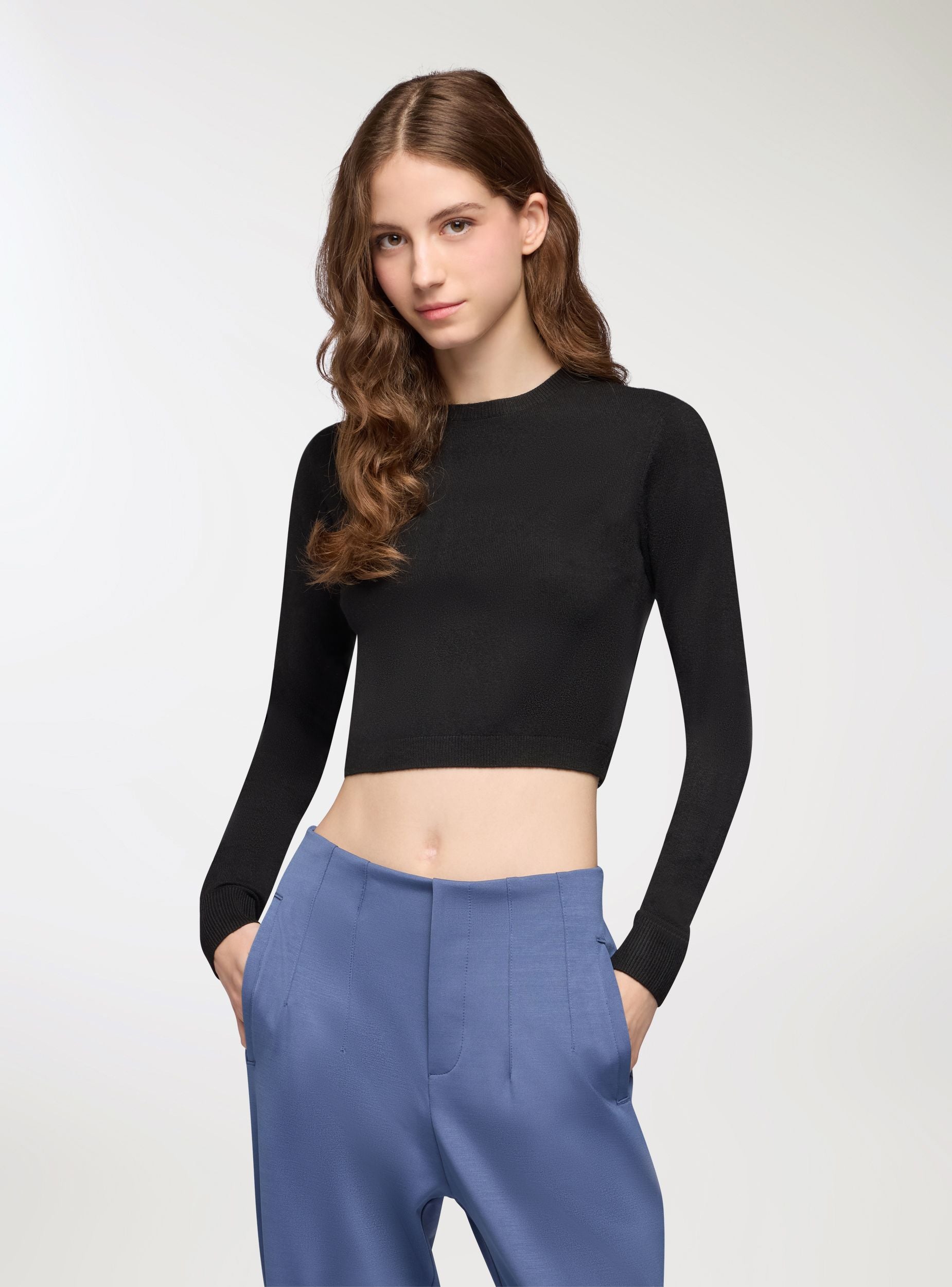 Maglia da donna con maniche lunghe e vestibilità crop. Perfetta per un look casual e moderno, si abbina facilmente a jeans o pantaloni a vita alta. Il design tinta unita la rende versatile per diverse occasioni, dal tempo libero alle uscite informali. Il girocollo aggiunge un tocco di semplicità ed eleganza, mentre il taglio crop valorizza la silhouette.