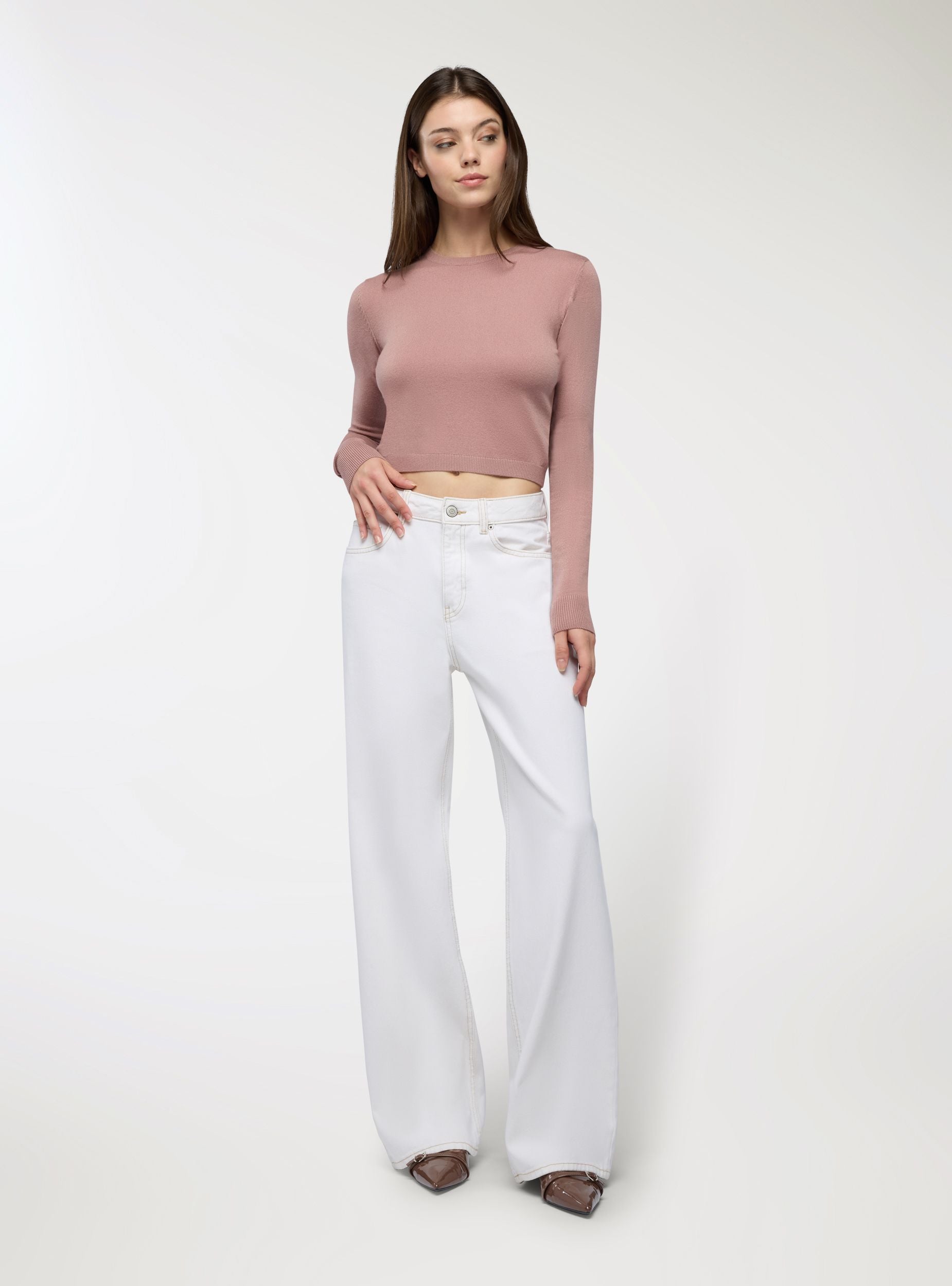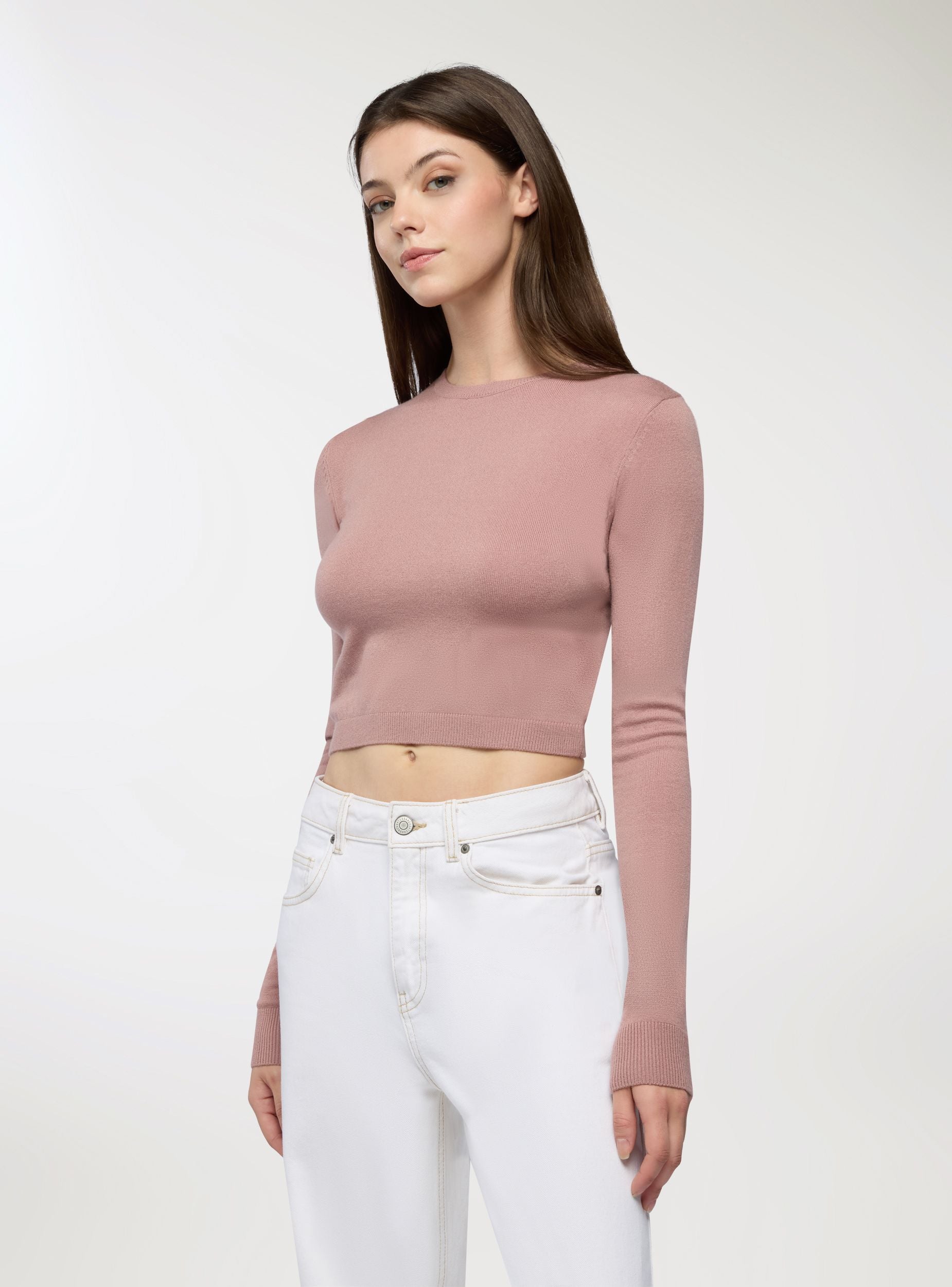 Maglia da donna con maniche lunghe e vestibilità crop. Perfetta per un look casual e moderno, si abbina facilmente a jeans o pantaloni a vita alta. Il design tinta unita la rende versatile per diverse occasioni, dal tempo libero alle uscite informali. Il girocollo aggiunge un tocco di semplicità ed eleganza, mentre il taglio crop valorizza la silhouette.
