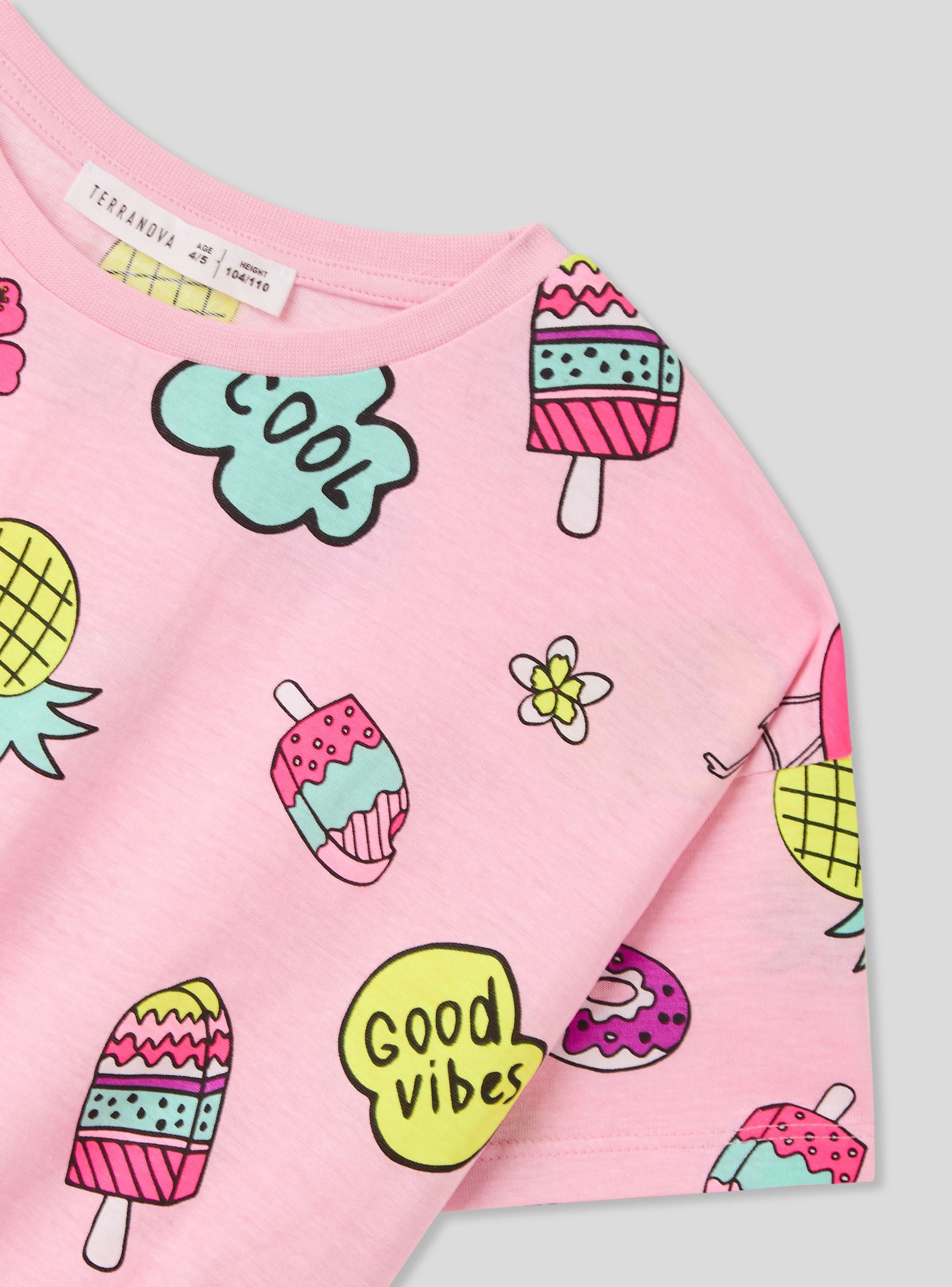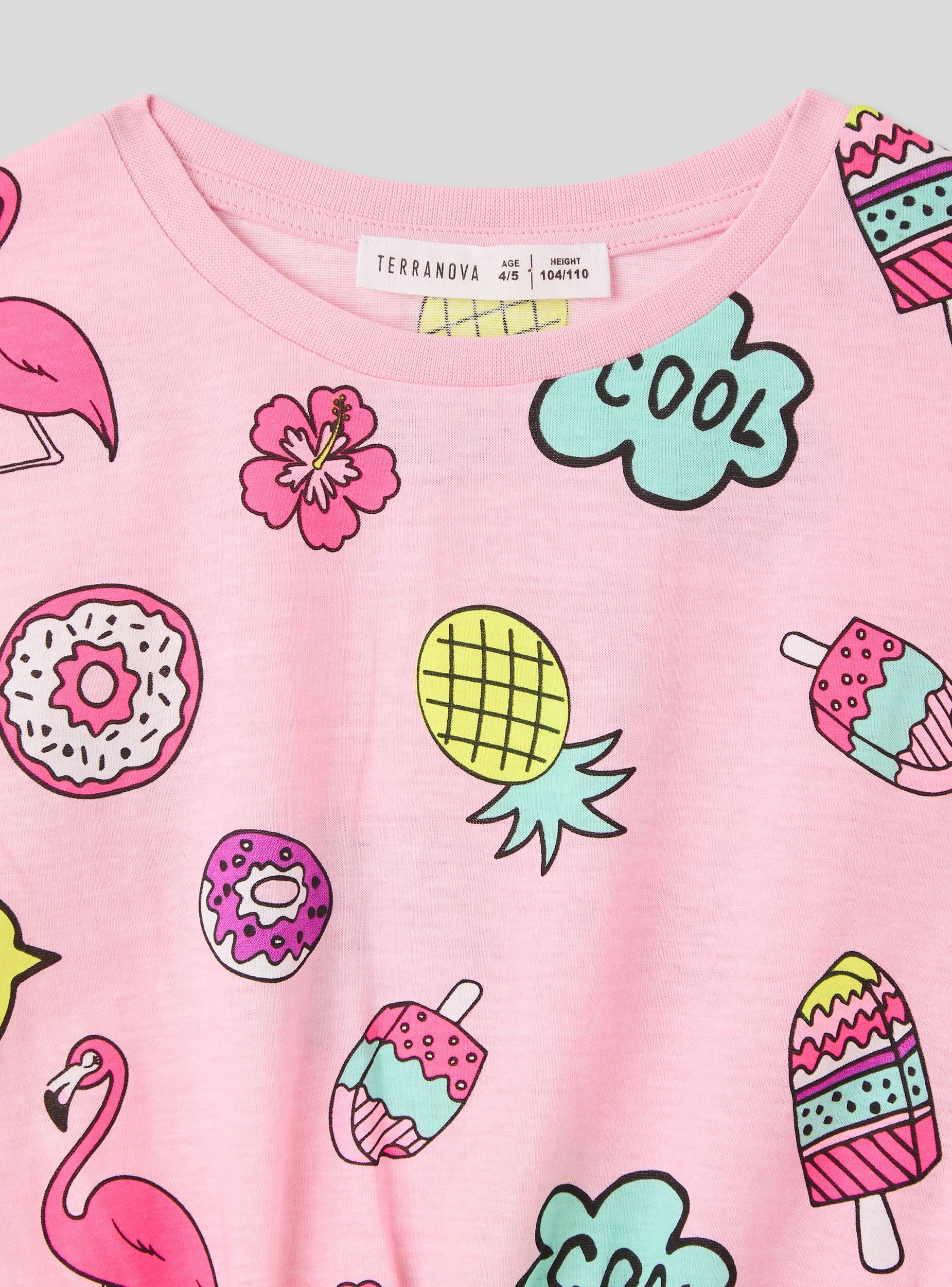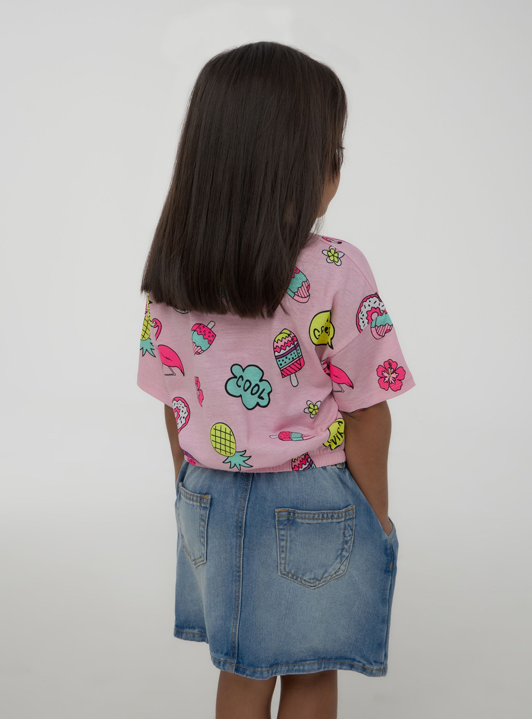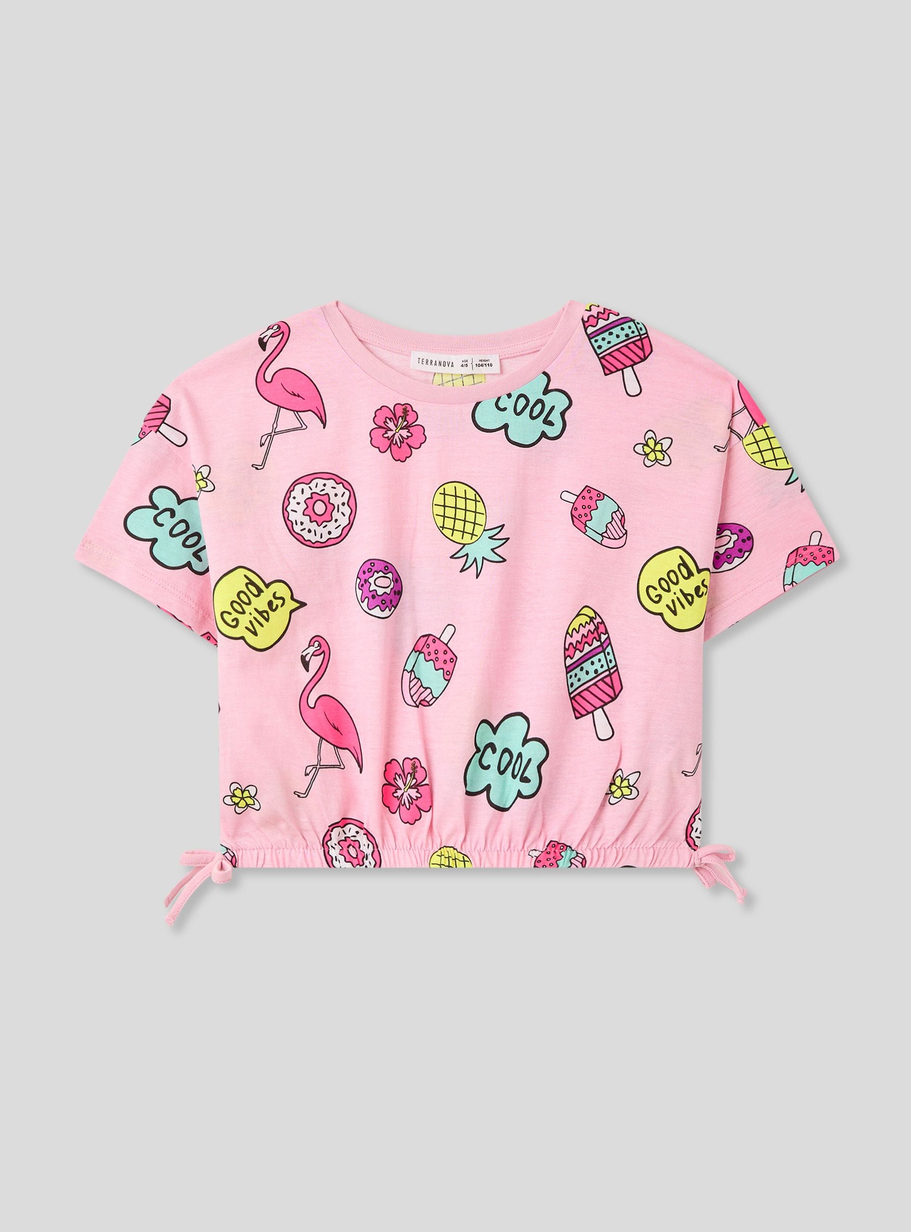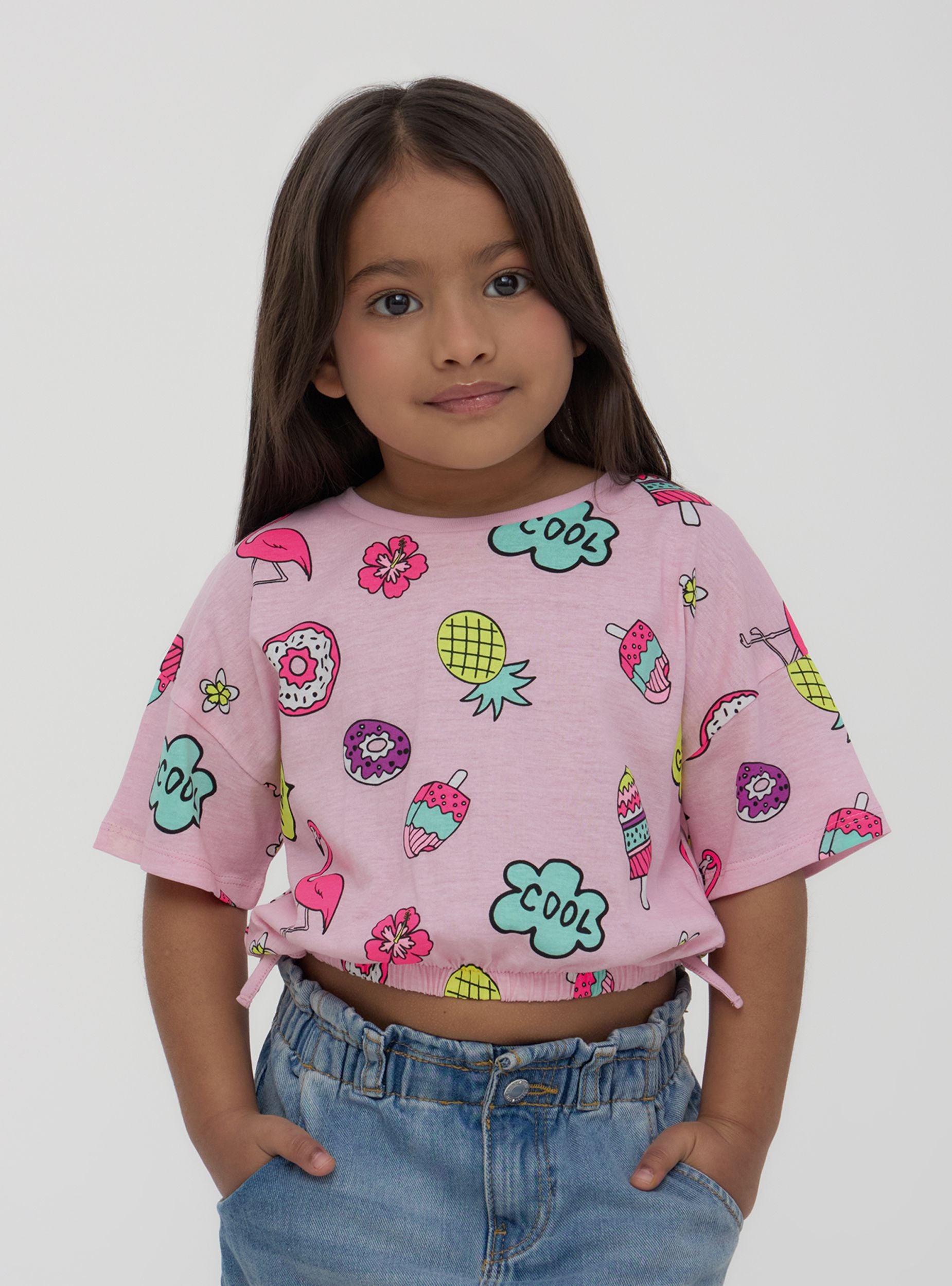 Maglietta da bimba dallo stile vivace e giocoso, con maniche corte e girocollo per un comfort ideale. Il design crop con cordini regolabili sul fondo aggiunge un tocco trendy. La fantasia colorata è arricchita da fenicotteri, donuts, gelati, ananas, fiori e scritte che trasmettono allegria. Perfetta per creare outfit estivi con shorts, jeans o gonne, ideale per il tempo libero e le giornate all’aria aperta.Dettagli