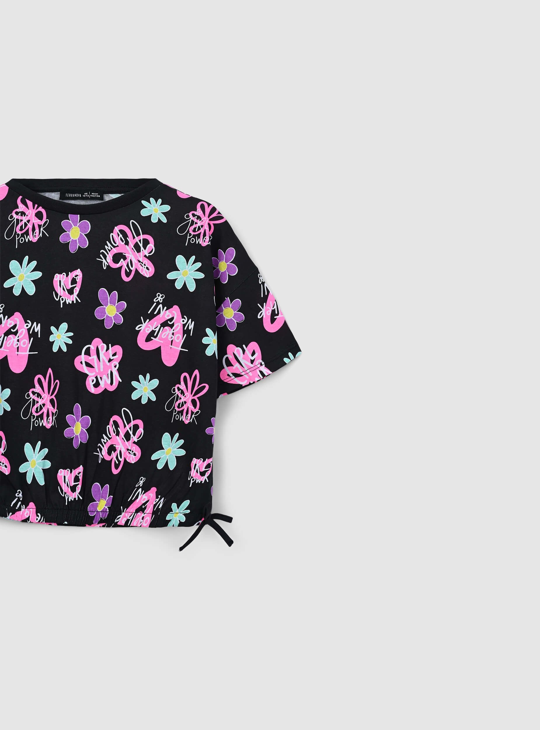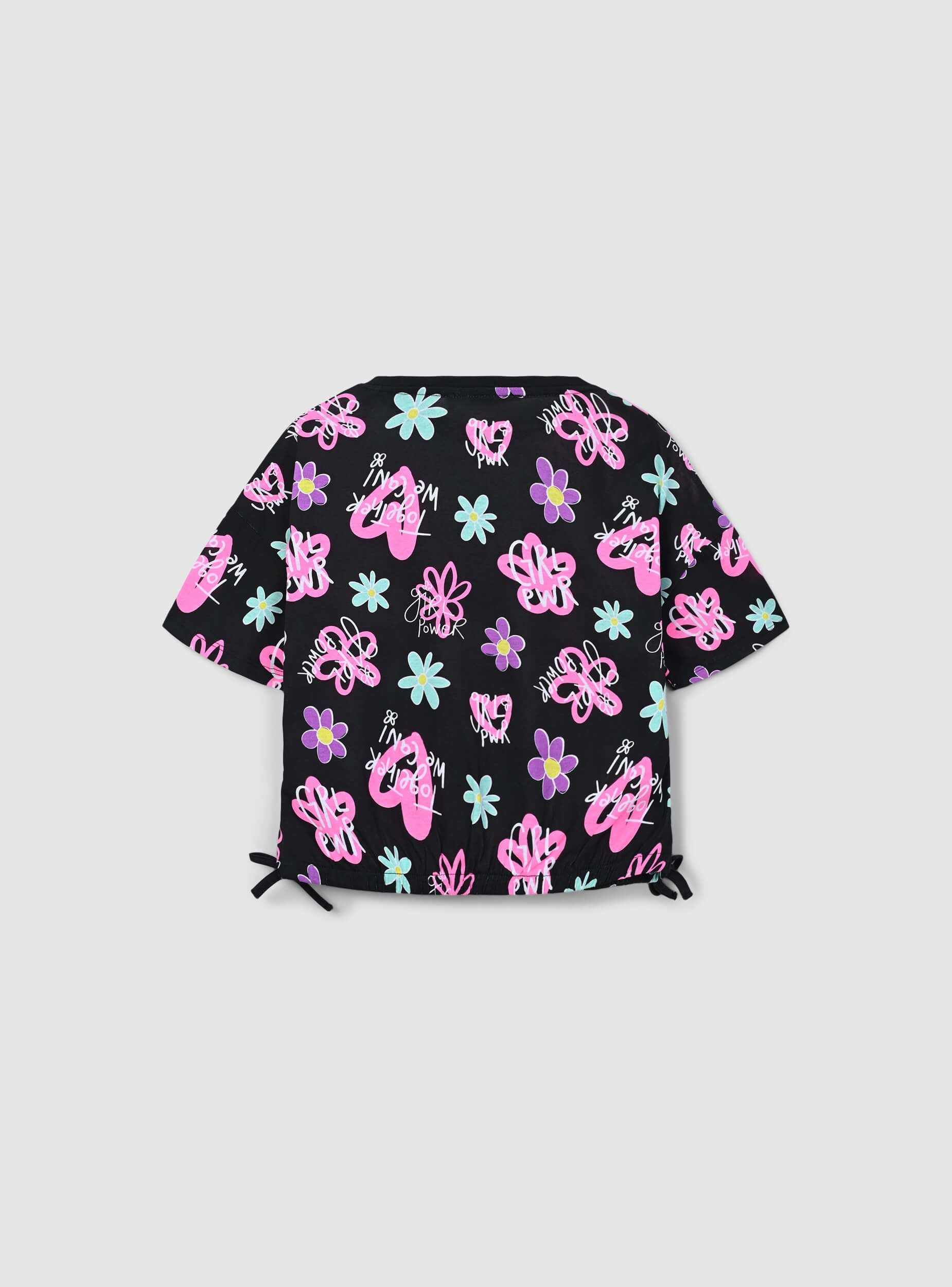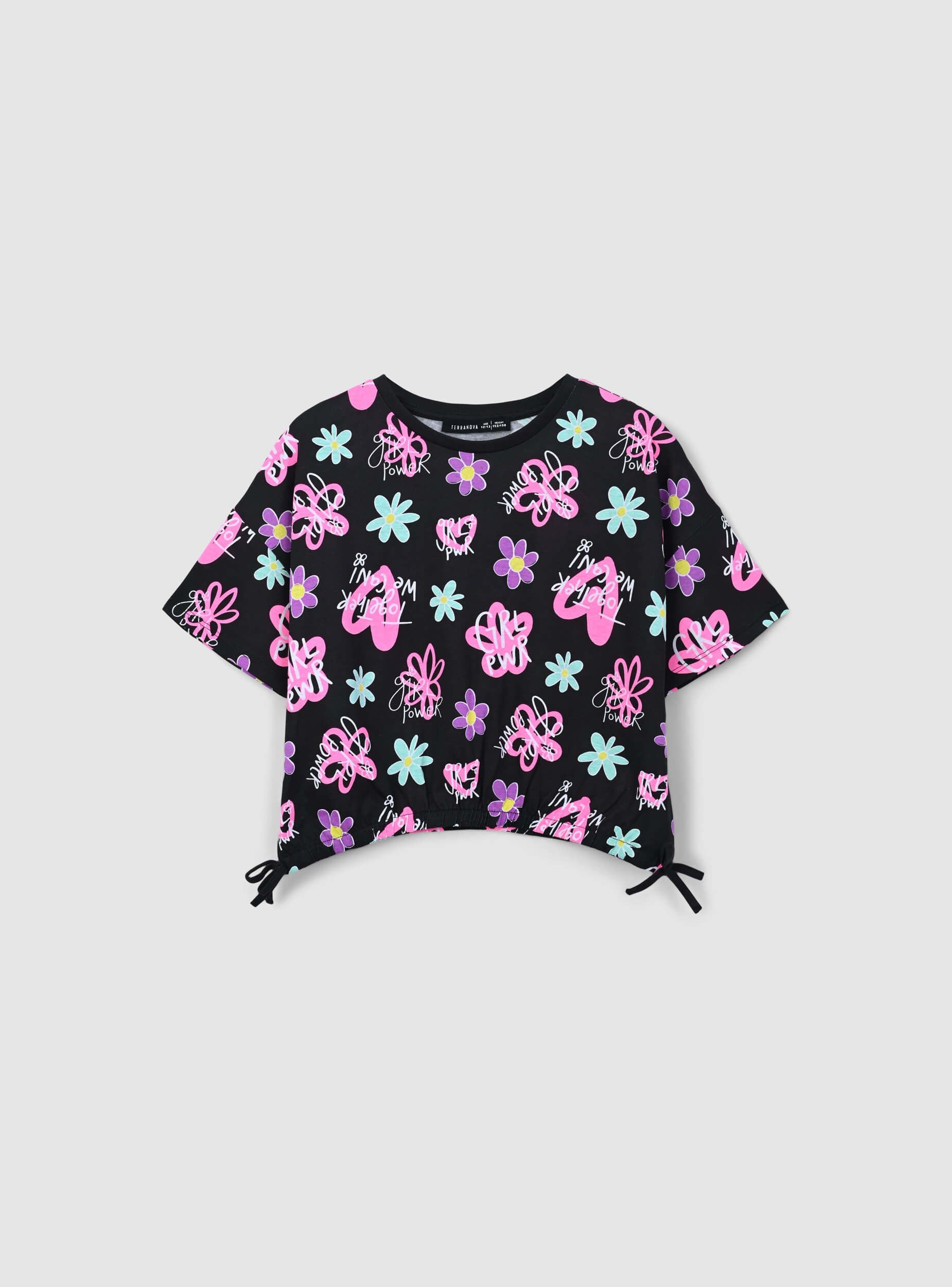 Maglietta da bambina dallo stile vivace e alla moda, con maniche corte e girocollo per un comfort ottimale. Il design crop è arricchito da una fantasia colorata con fiori e scritte che aggiungono un tocco giocoso. I cordini regolabili sul fondo permettono di personalizzare la vestibilità. Perfetta per abbinamenti con jeans, leggings o gonne, ideale per il tempo libero e le uscite con le amiche.