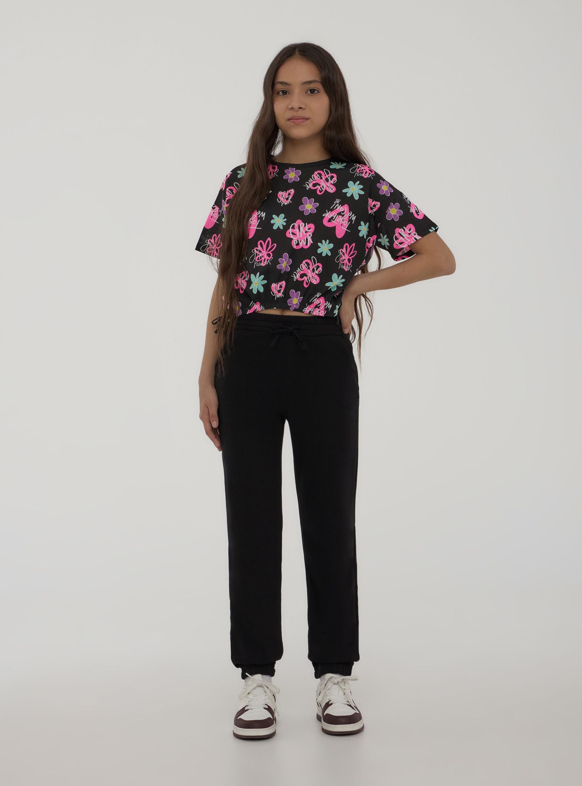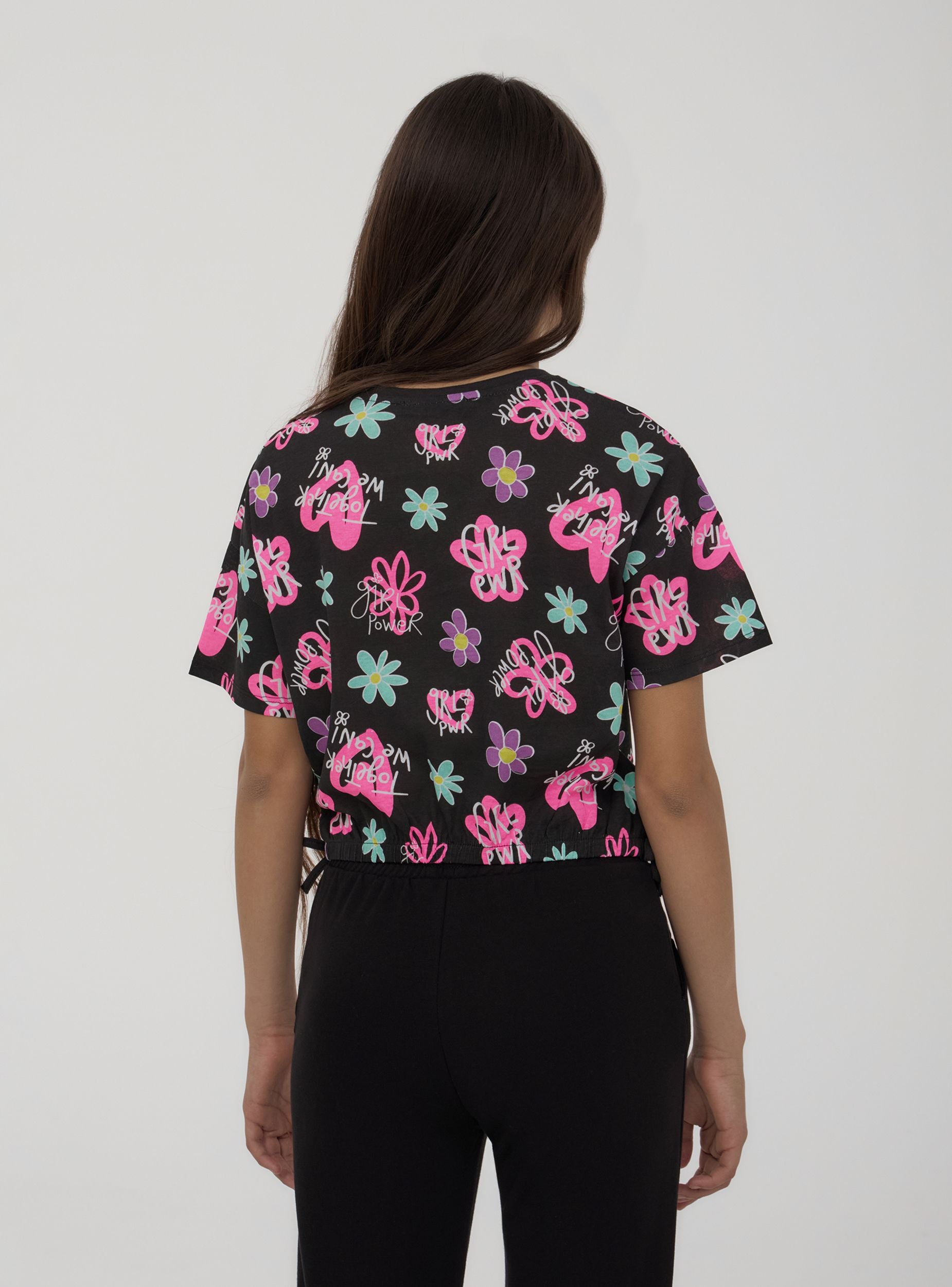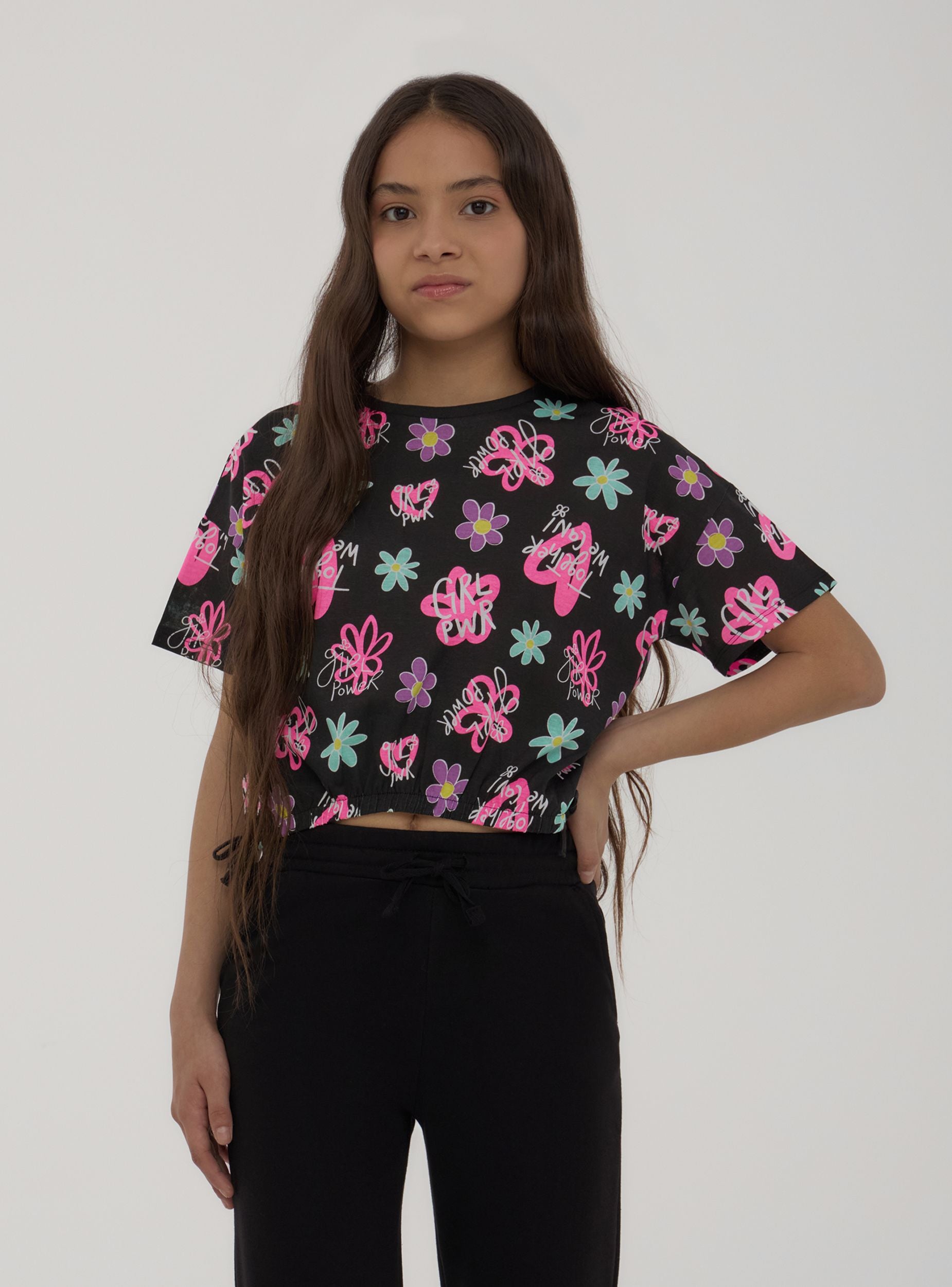 Maglietta da bambina dallo stile vivace e alla moda, con maniche corte e girocollo per un comfort ottimale. Il design crop è arricchito da una fantasia colorata con fiori e scritte che aggiungono un tocco giocoso. I cordini regolabili sul fondo permettono di personalizzare la vestibilità. Perfetta per abbinamenti con jeans, leggings o gonne, ideale per il tempo libero e le uscite con le amiche.
