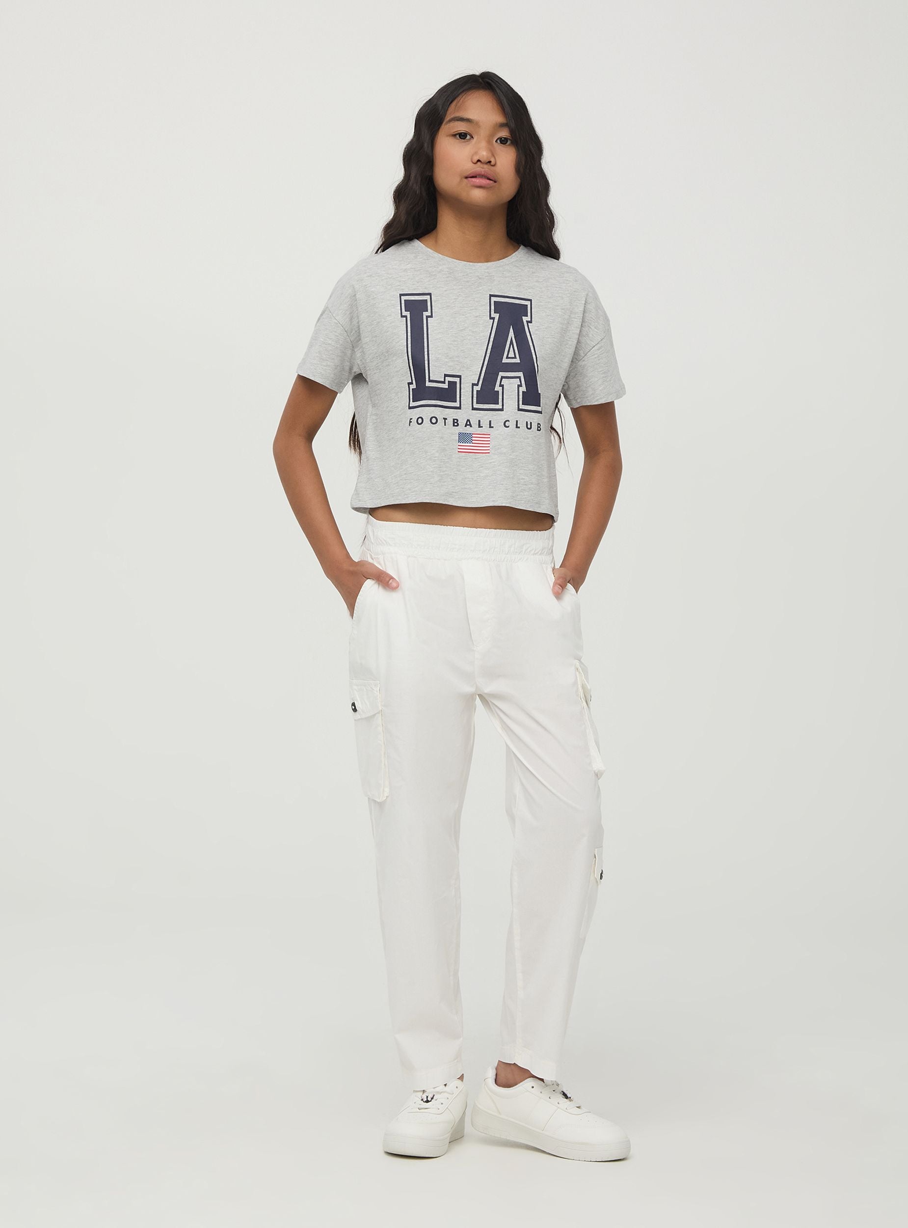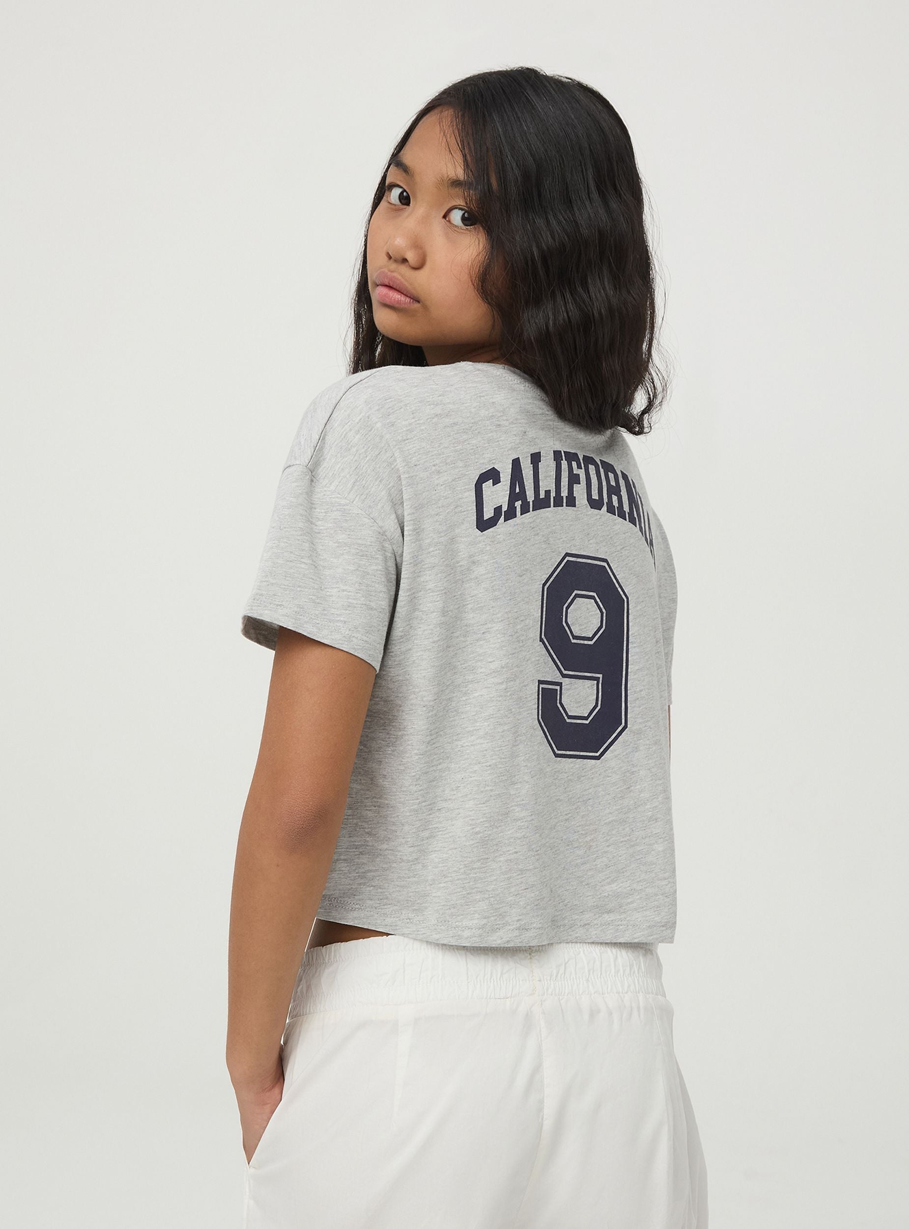 Maglietta da bambina a maniche corte con girocollo. Tessuto con stampa stile sport. Vestibilità crop.