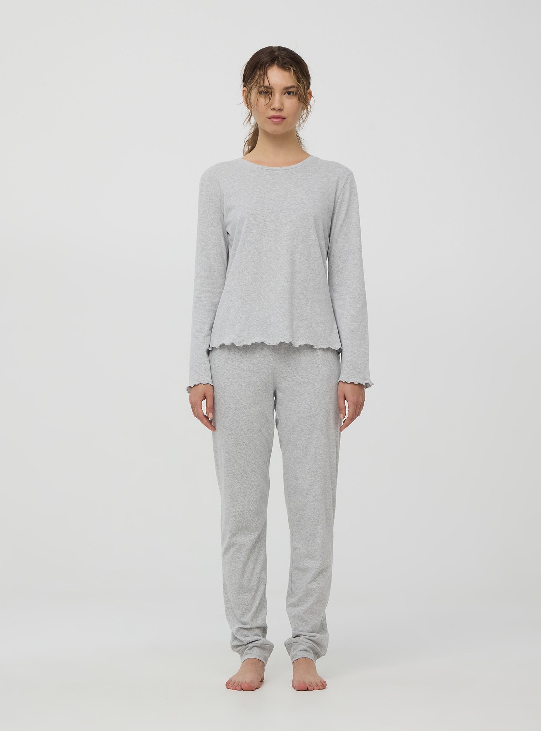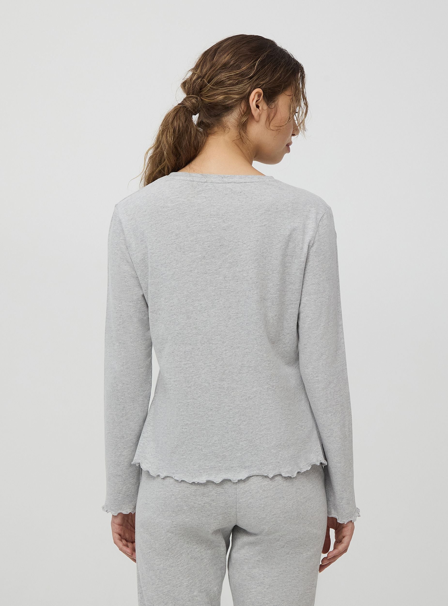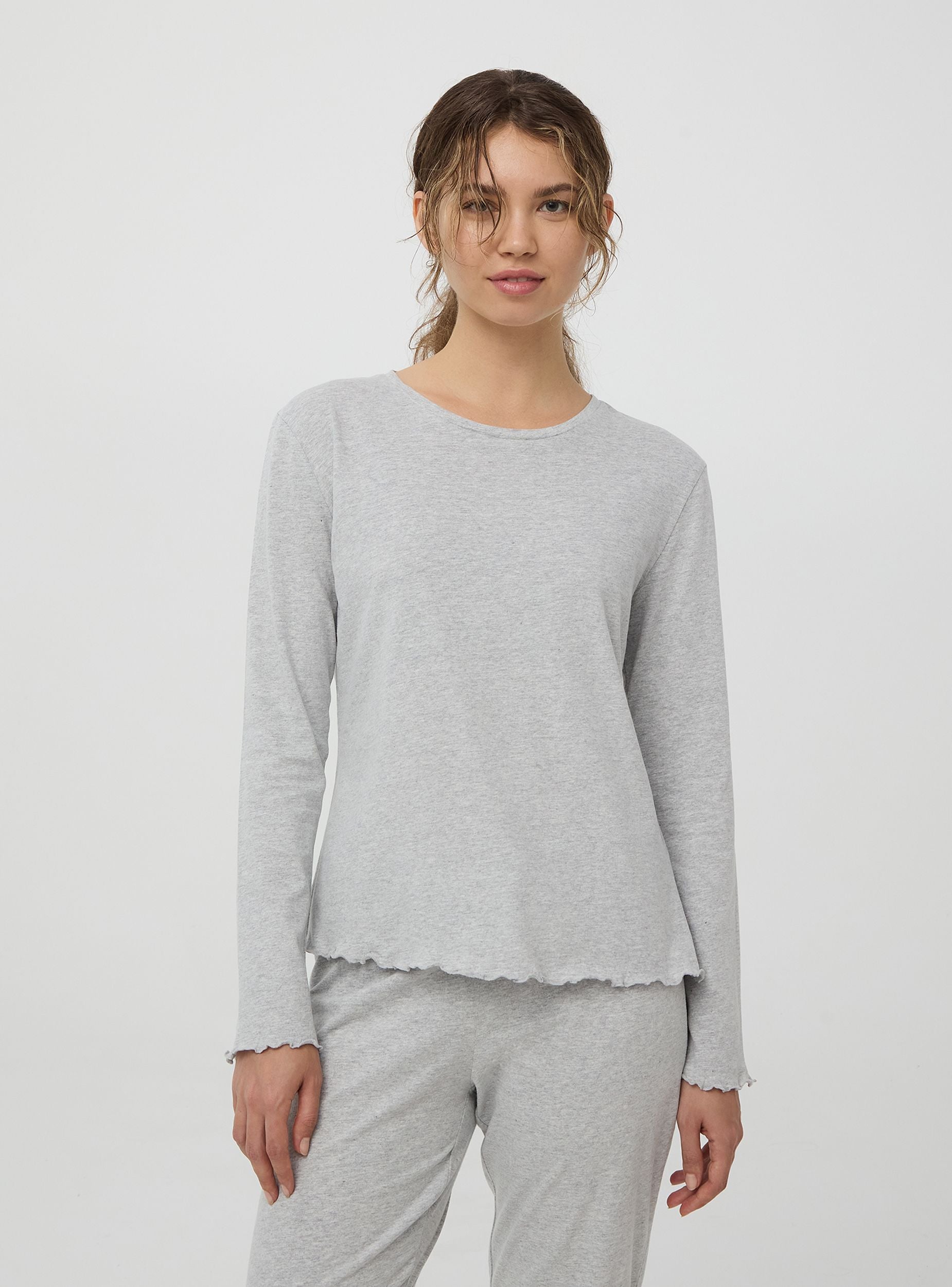 Maglia pigiama da donna a maniche lunghe in tessuto di cotone e viscosa a tinta unita. Questa maglia offre una vestibilità rilassata e confortevole, perfetta per la notte e per le giornate trascorse in casa . Il design semplice con scollo rotondo e orlo leggermente ondulato aggiunge un tocco di femminilità al tuo look.