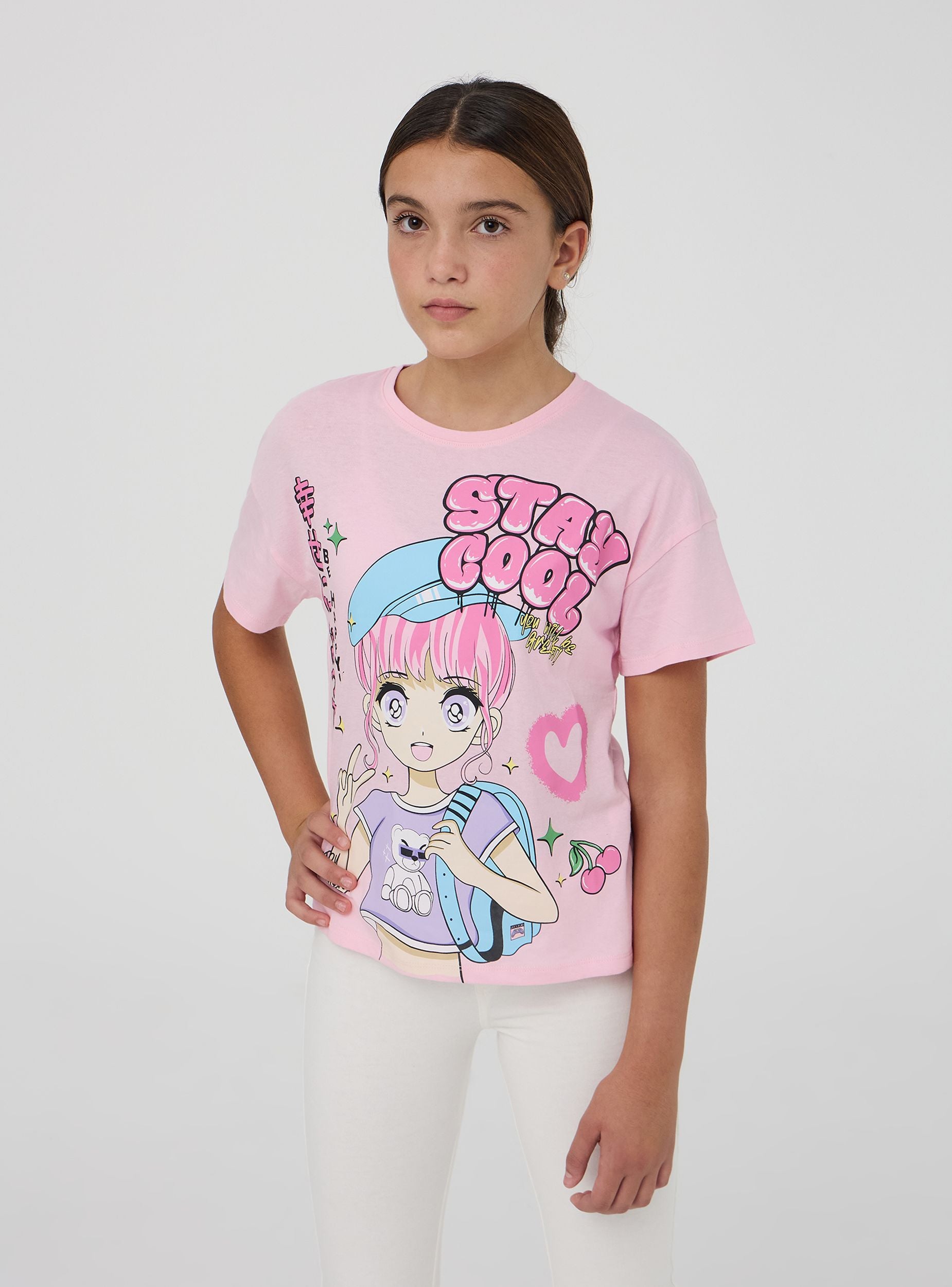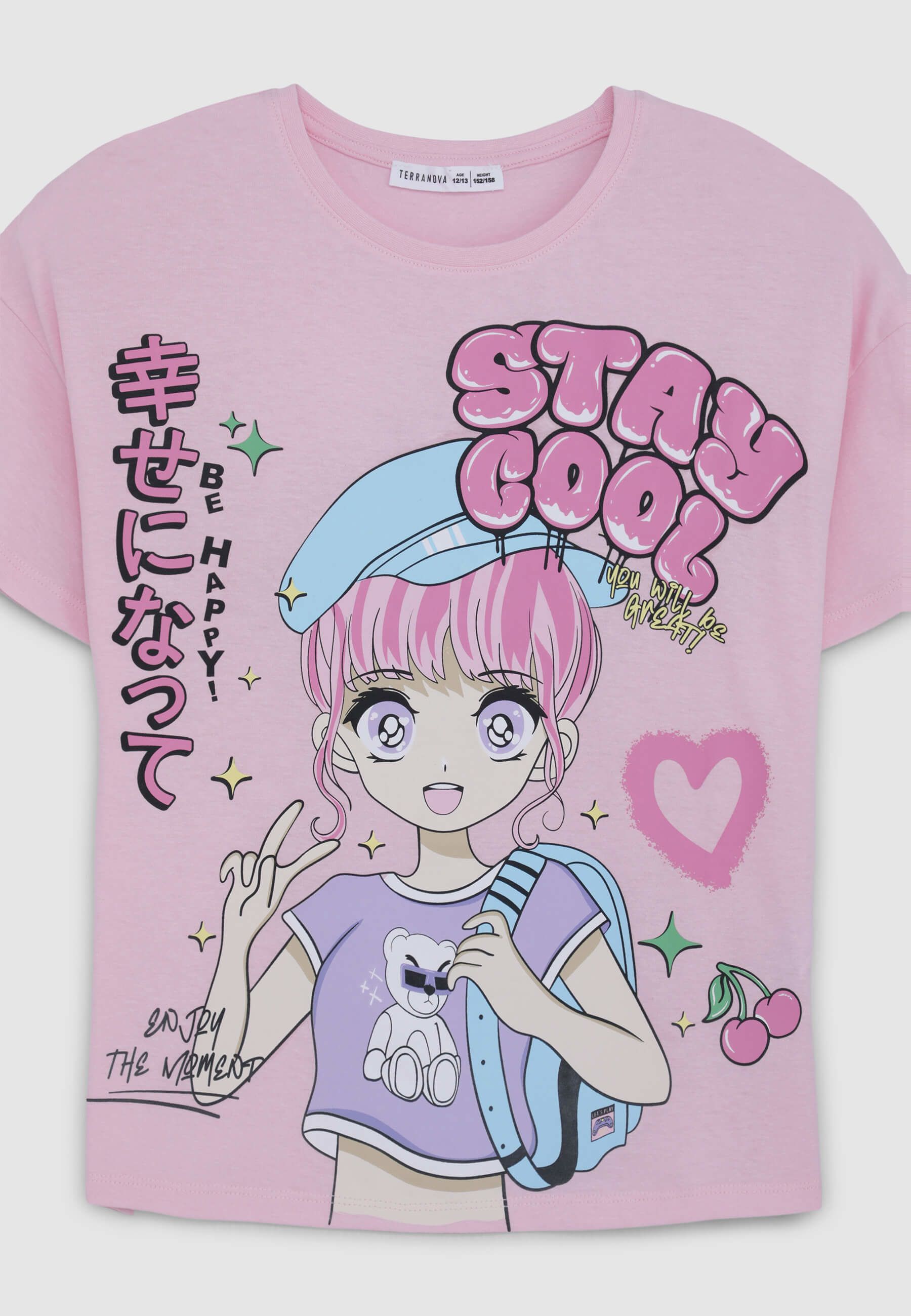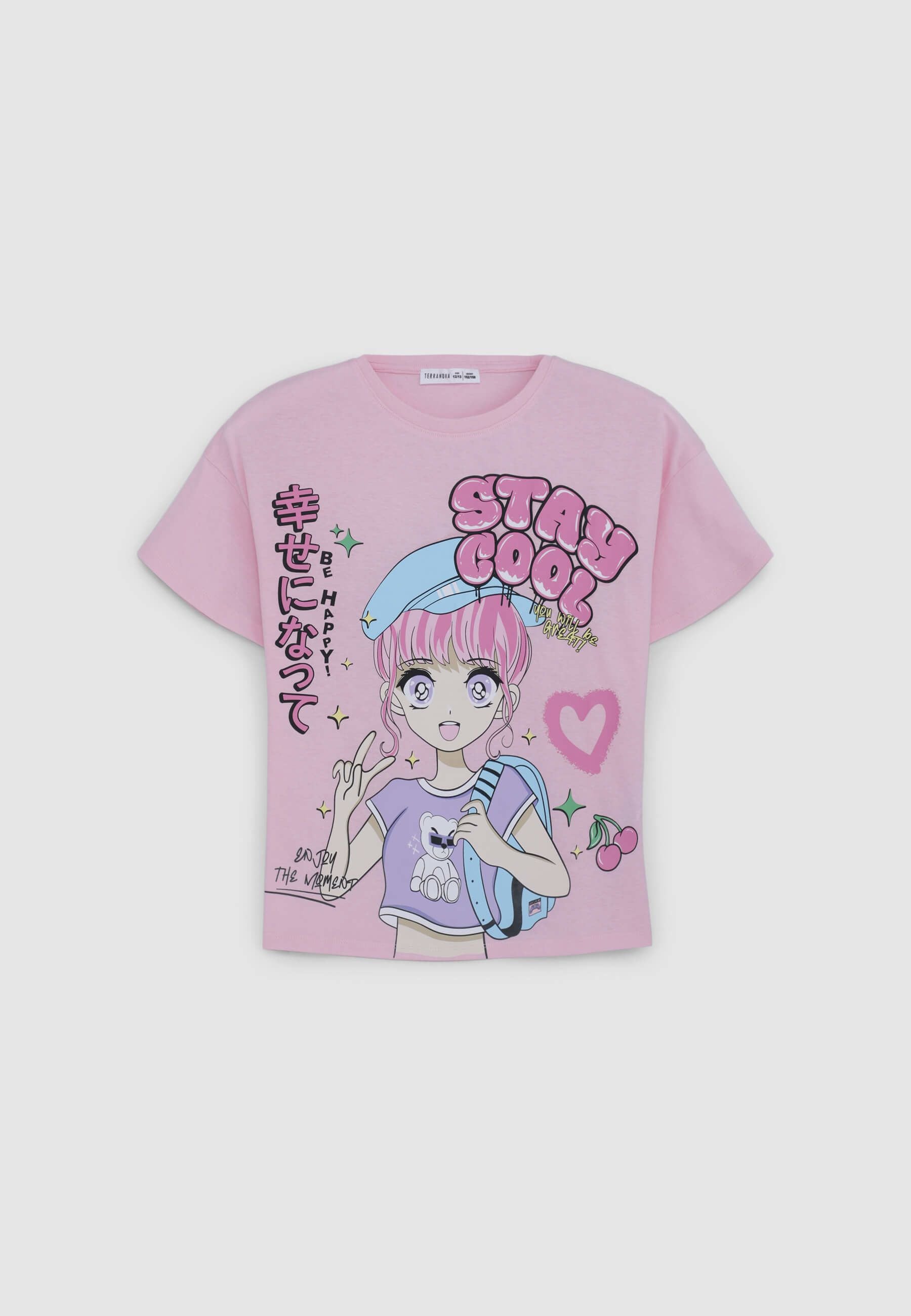 Maglietta da bambina con una grafica accattivante in stile manga sul davanti. Il disegno mostra una ragazza con un cappellino e uno zaino, che fa il segno di vittoria con le dita. Accanto a lei ci sono simboli decorativi come una ciliegia e un cuore. In alto, c'è la scritta grande "Stay Cool", accompagnata da altri piccoli dettagli grafici, tra cui una frase in caratteri giapponesi e la scritta "Be Happy". La maglietta ha maniche corte e il girocollo. Presenta uno stile vivace, perfetto per un look casual e giocoso.