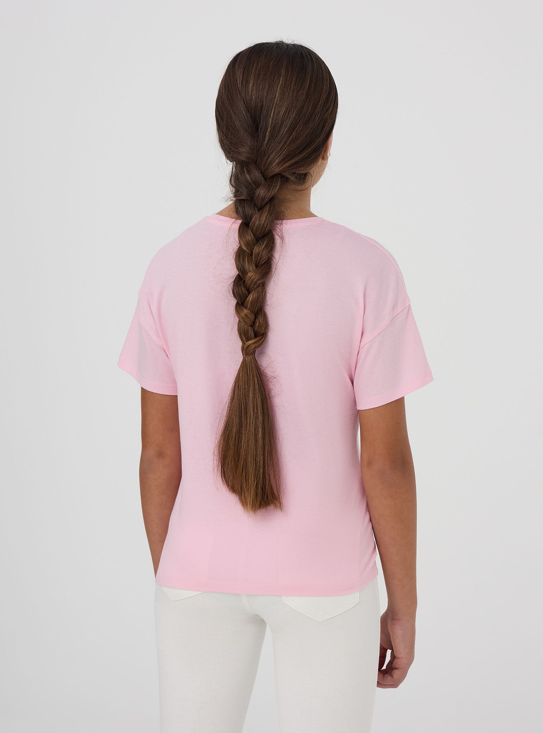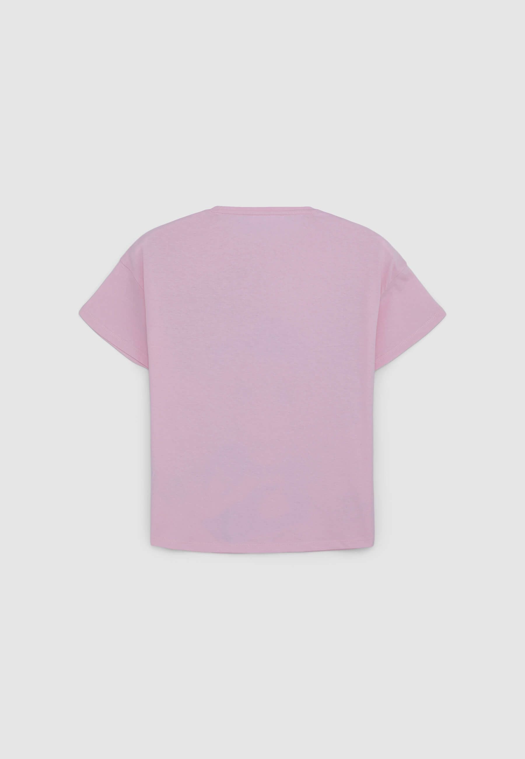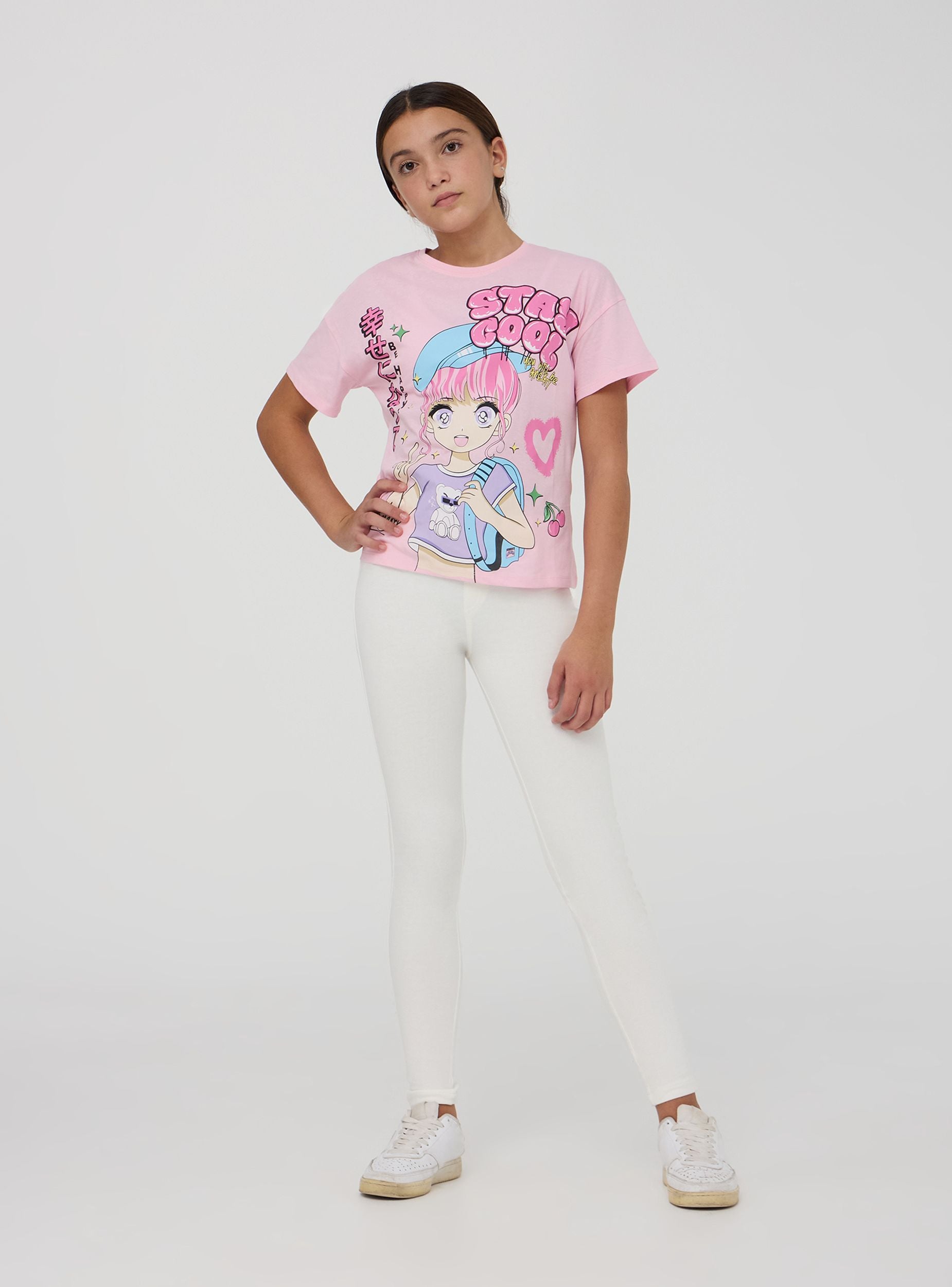 Maglietta da bambina con una grafica accattivante in stile manga sul davanti. Il disegno mostra una ragazza con un cappellino e uno zaino, che fa il segno di vittoria con le dita. Accanto a lei ci sono simboli decorativi come una ciliegia e un cuore. In alto, c'è la scritta grande "Stay Cool", accompagnata da altri piccoli dettagli grafici, tra cui una frase in caratteri giapponesi e la scritta "Be Happy". La maglietta ha maniche corte e il girocollo. Presenta uno stile vivace, perfetto per un look casual e giocoso.