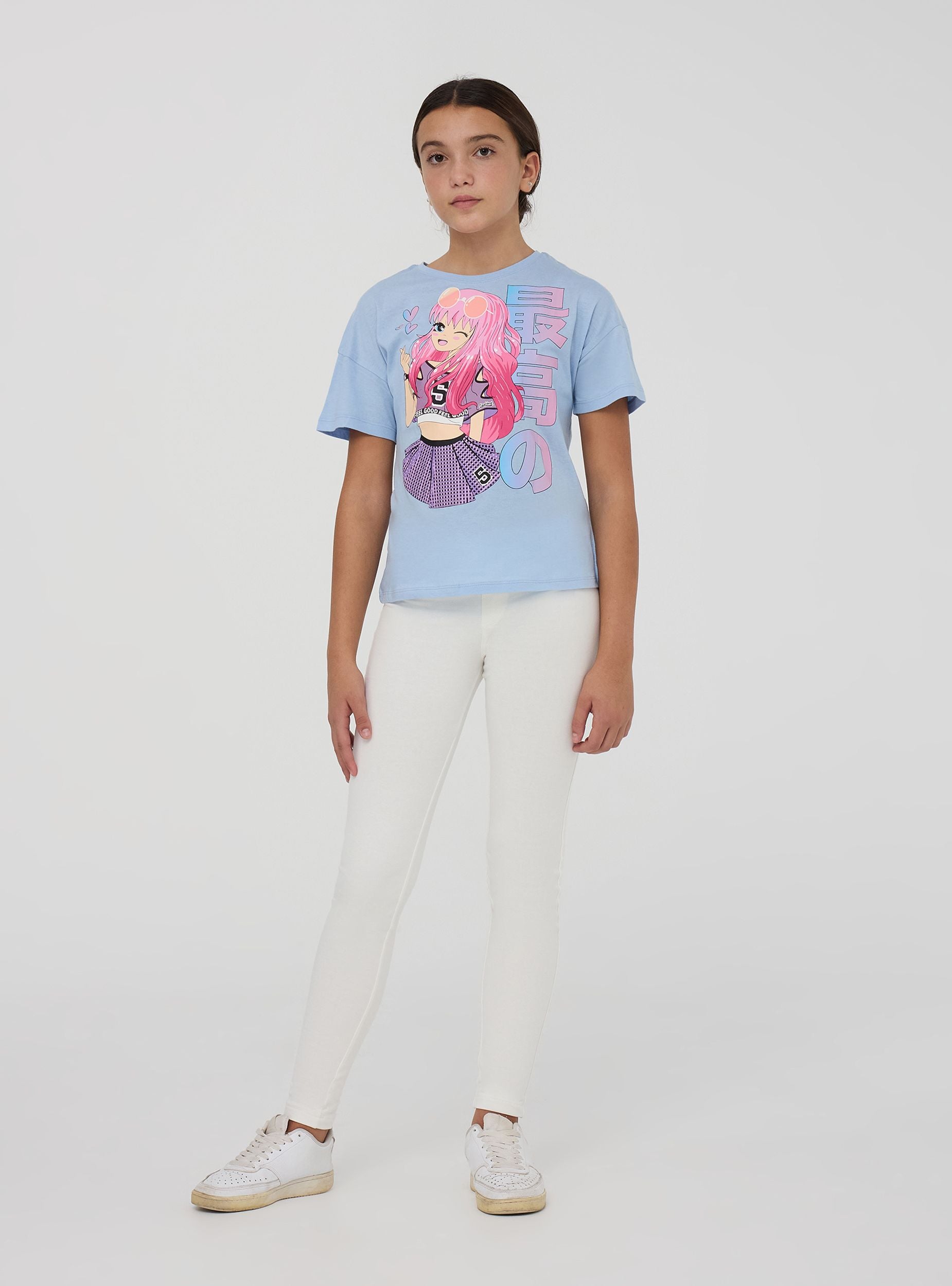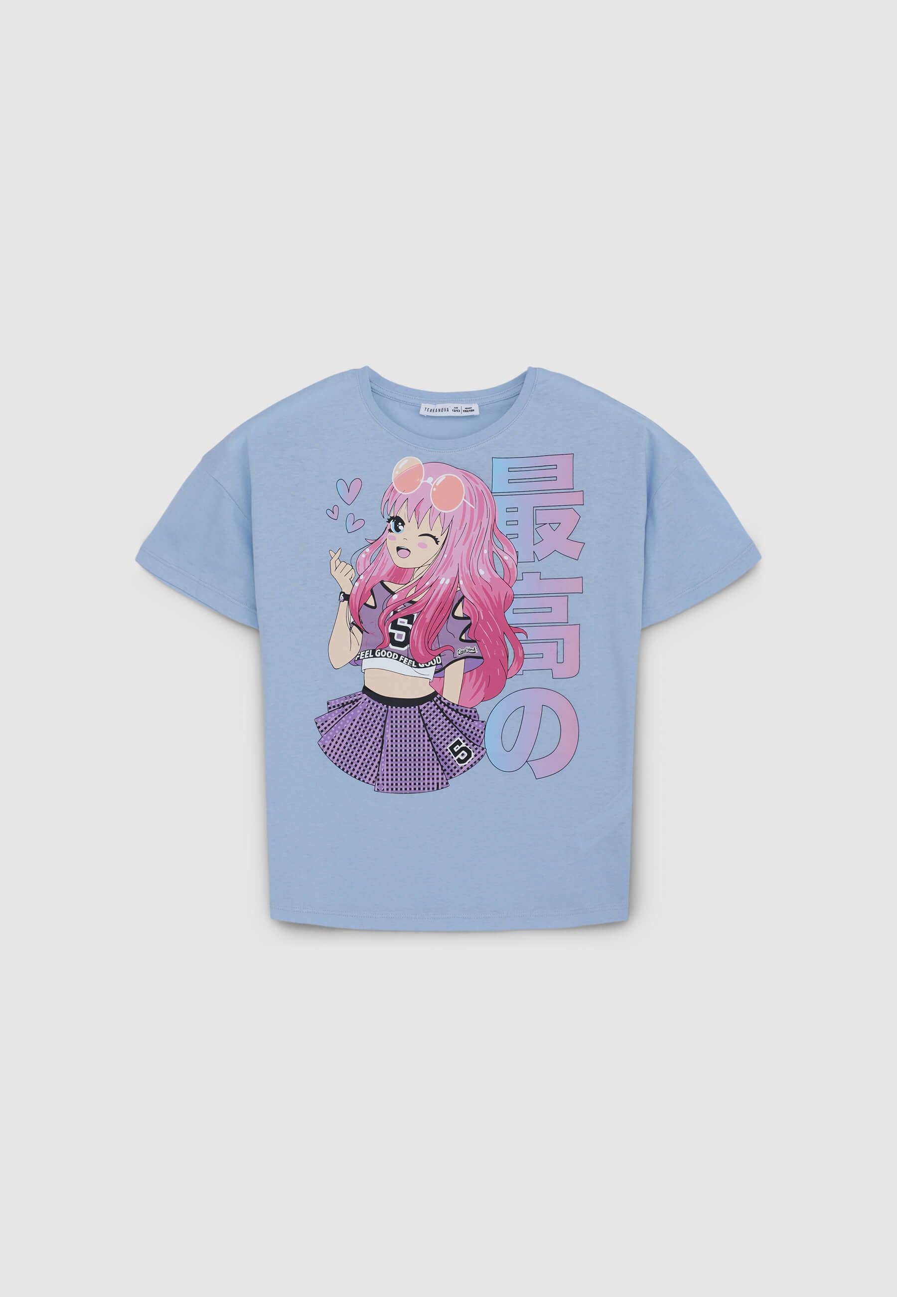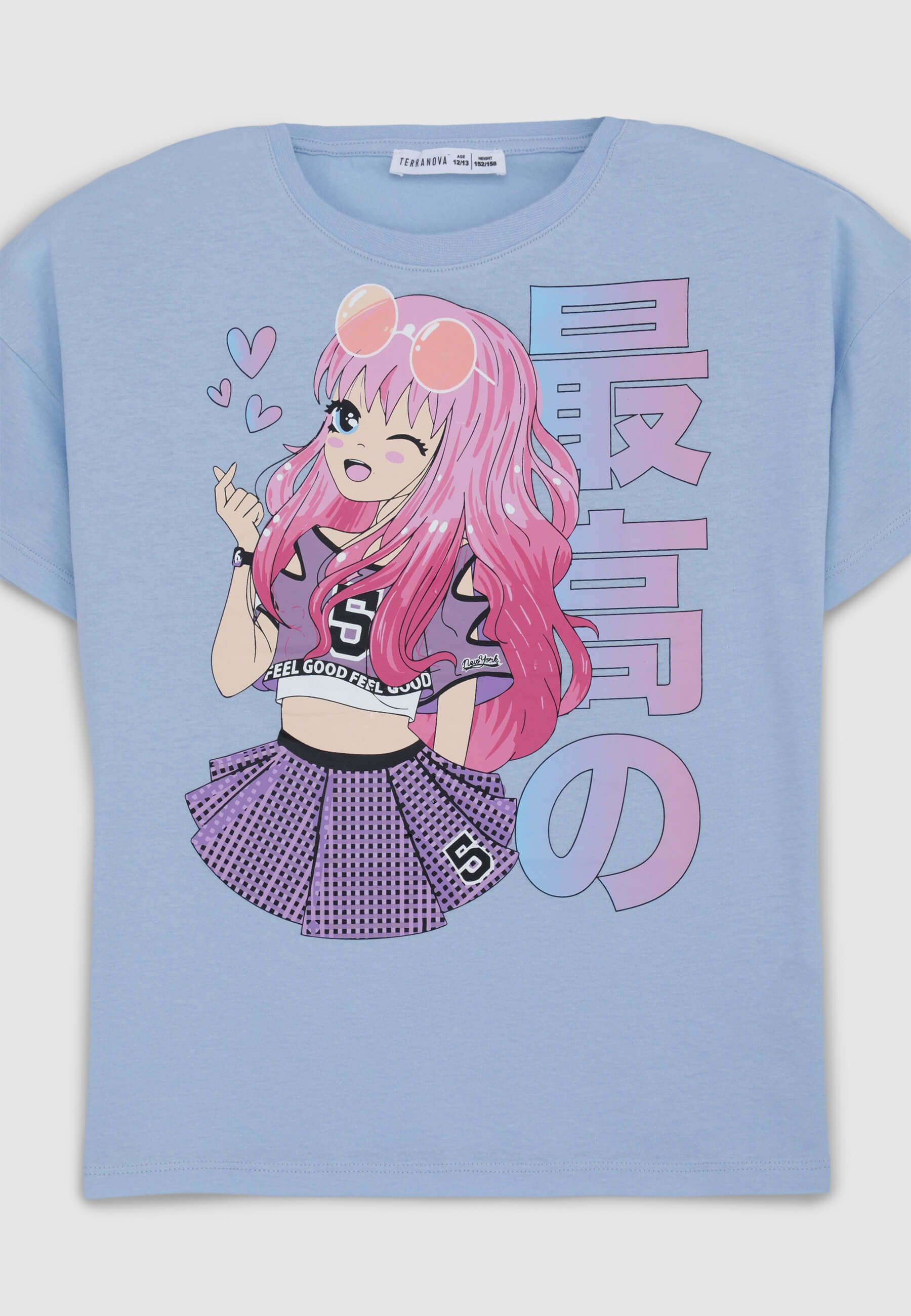 Maglietta da bambina con un design in stile manga sul davanti, che raffigura una ragazza con occhiali da sole sulla testa e un abbigliamento sportivo, composto da una maglietta e una gonna con un numero stampato. Il personaggio è circondato da cuori stilizzati e scritte decorative in caratteri giapponesi. La maglietta ha maniche corte e il girocollo, con un taglio comodo che la rende adatta per un look casual.