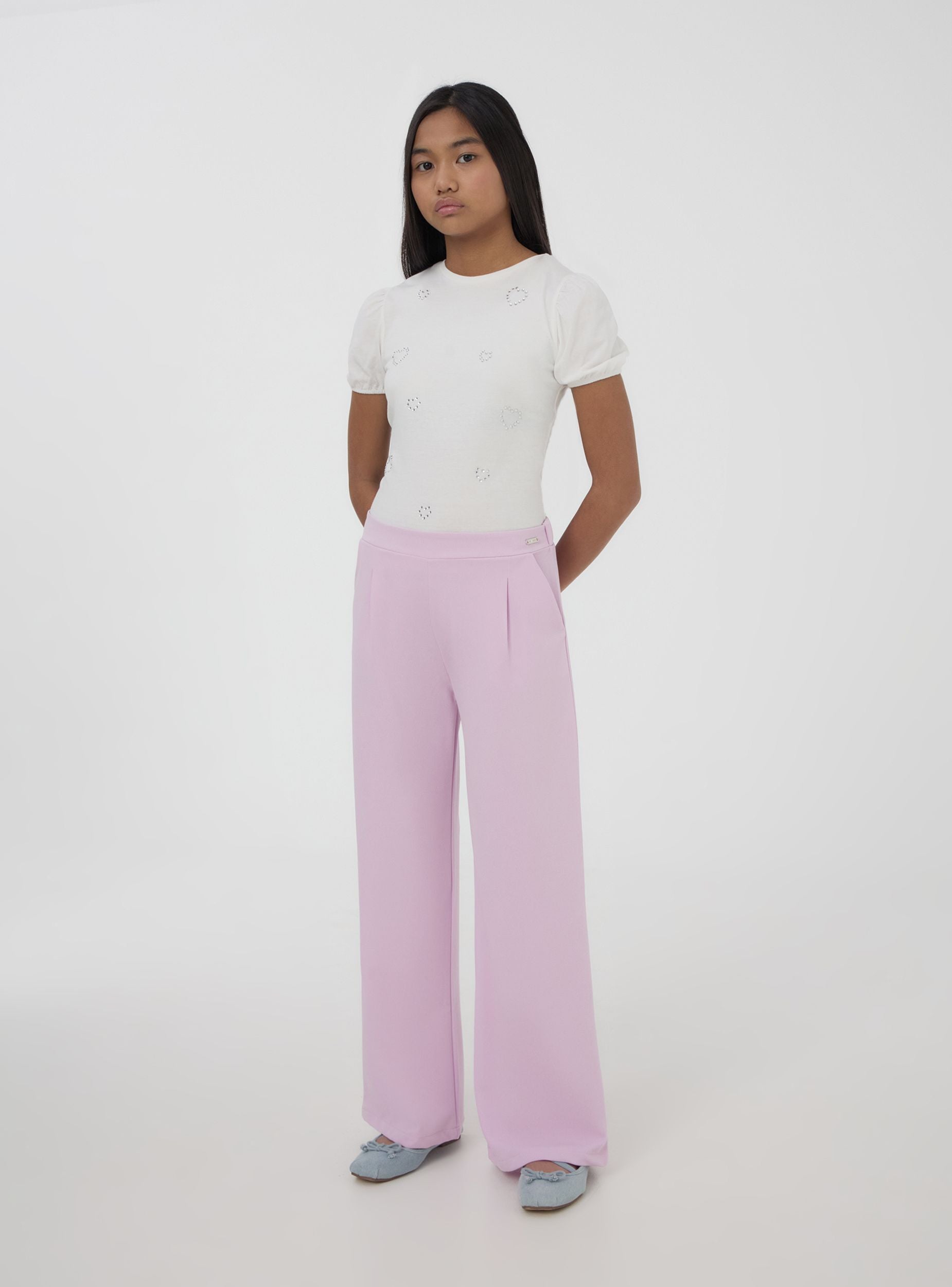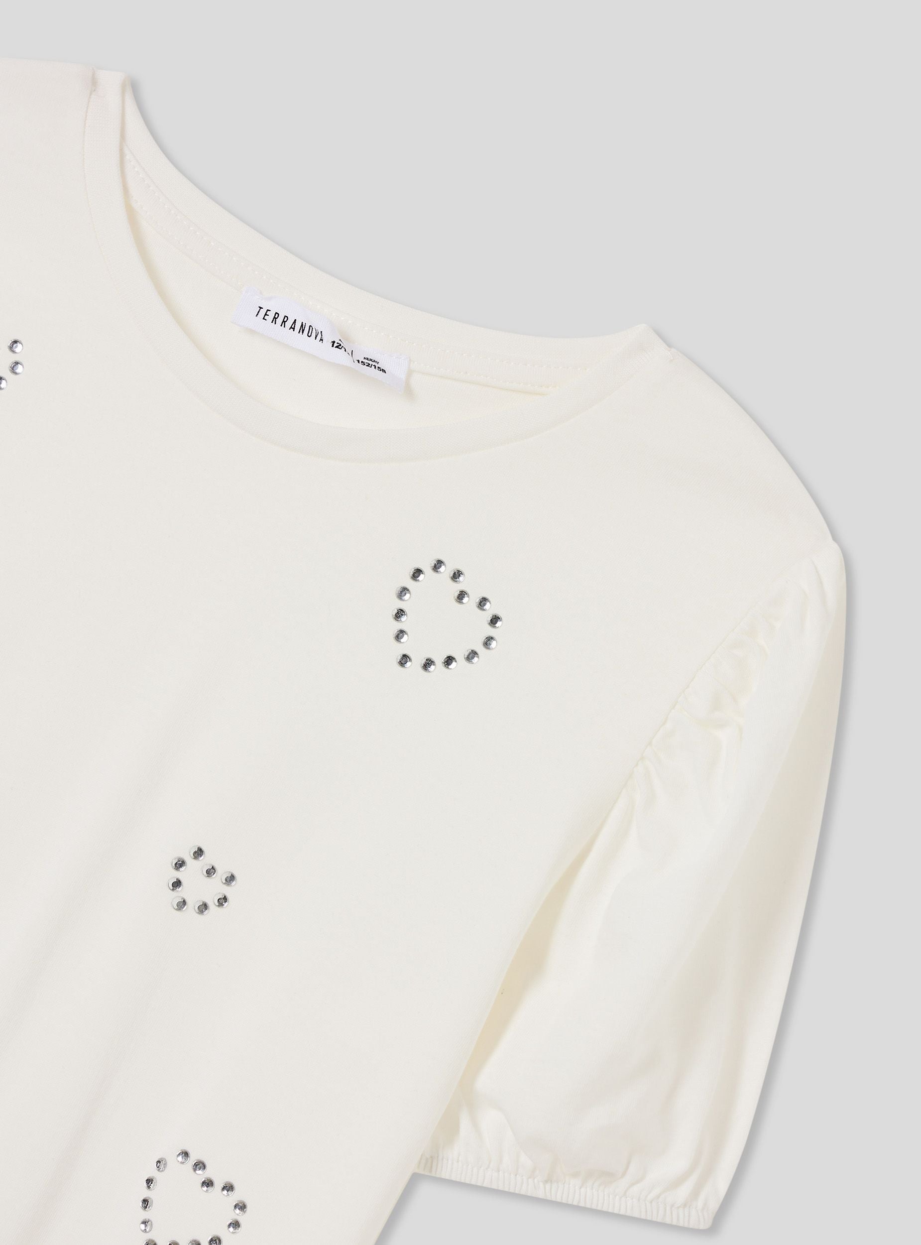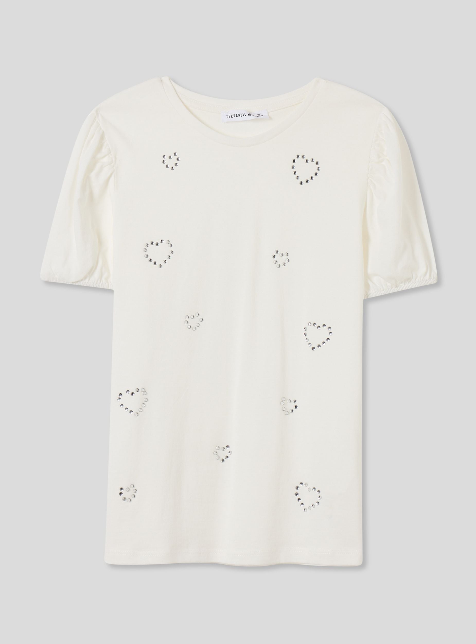 Maglietta da bambina ideale per un look brillante e vivace, perfetta per occasioni speciali o per aggiungere un tocco di stile al quotidiano. Presenta maniche corte a palloncino e un girocollo confortevole. Le applicazioni a forma di cuori impreziositi da strass regalano luminosità e originalità, rendendola unica e accattivante.
