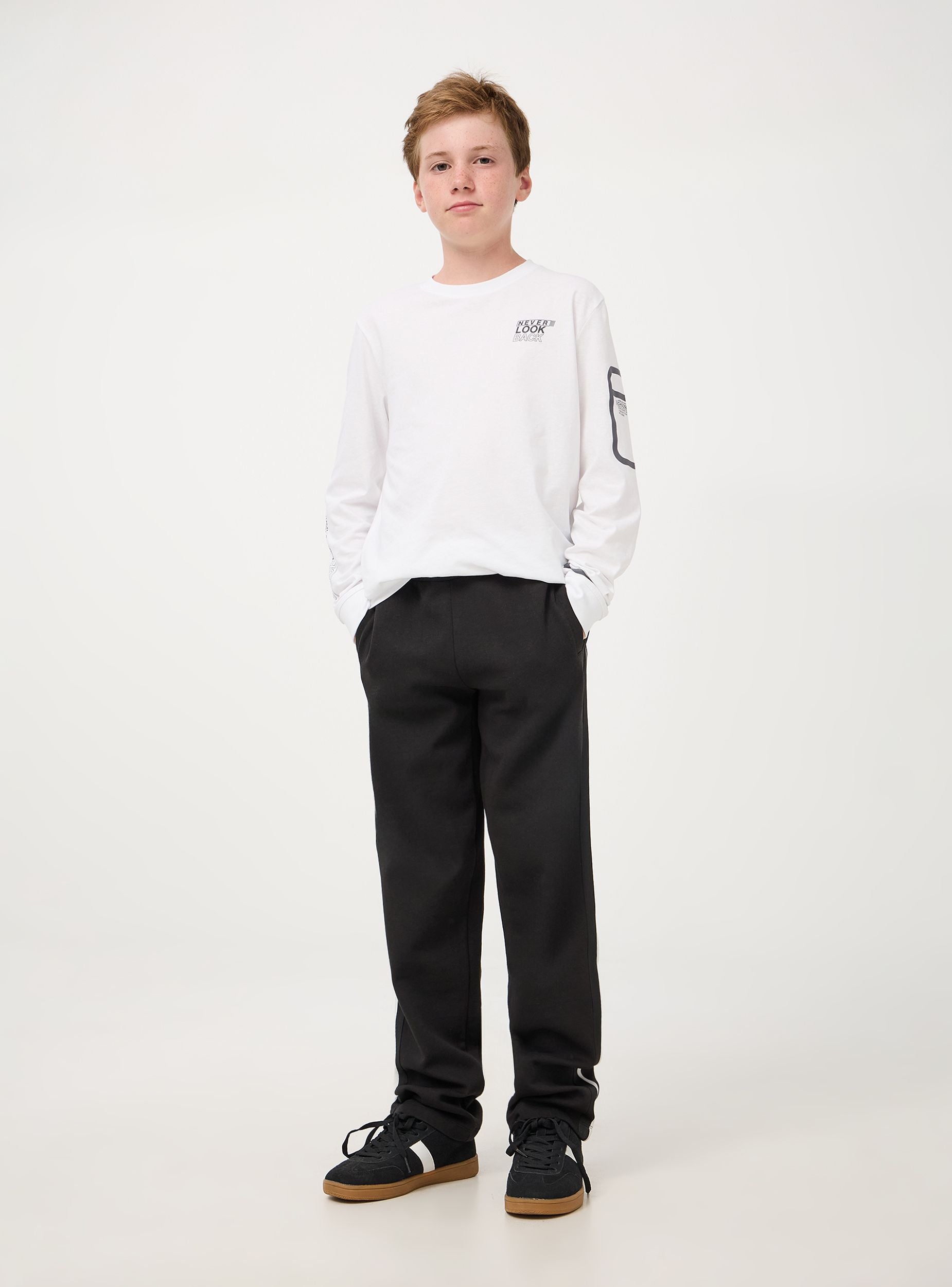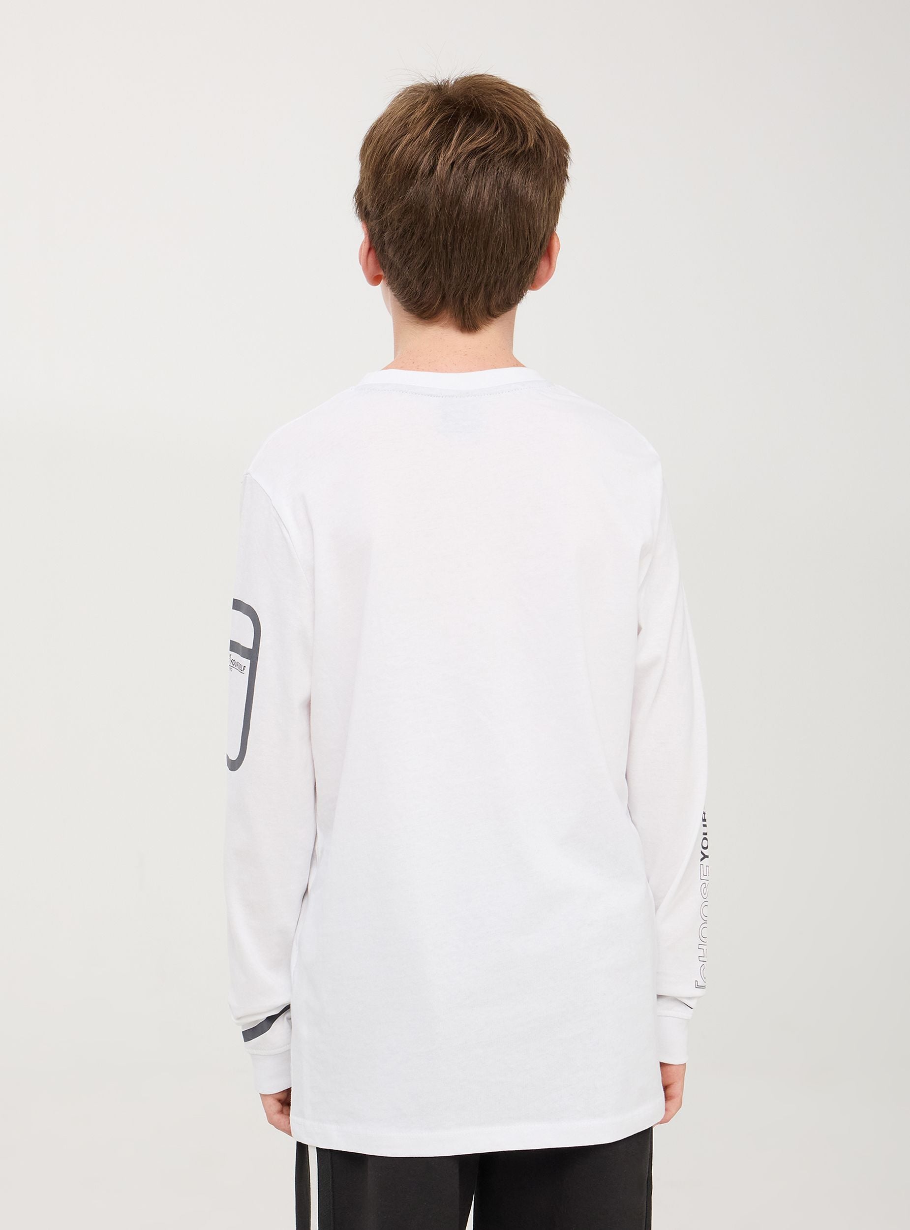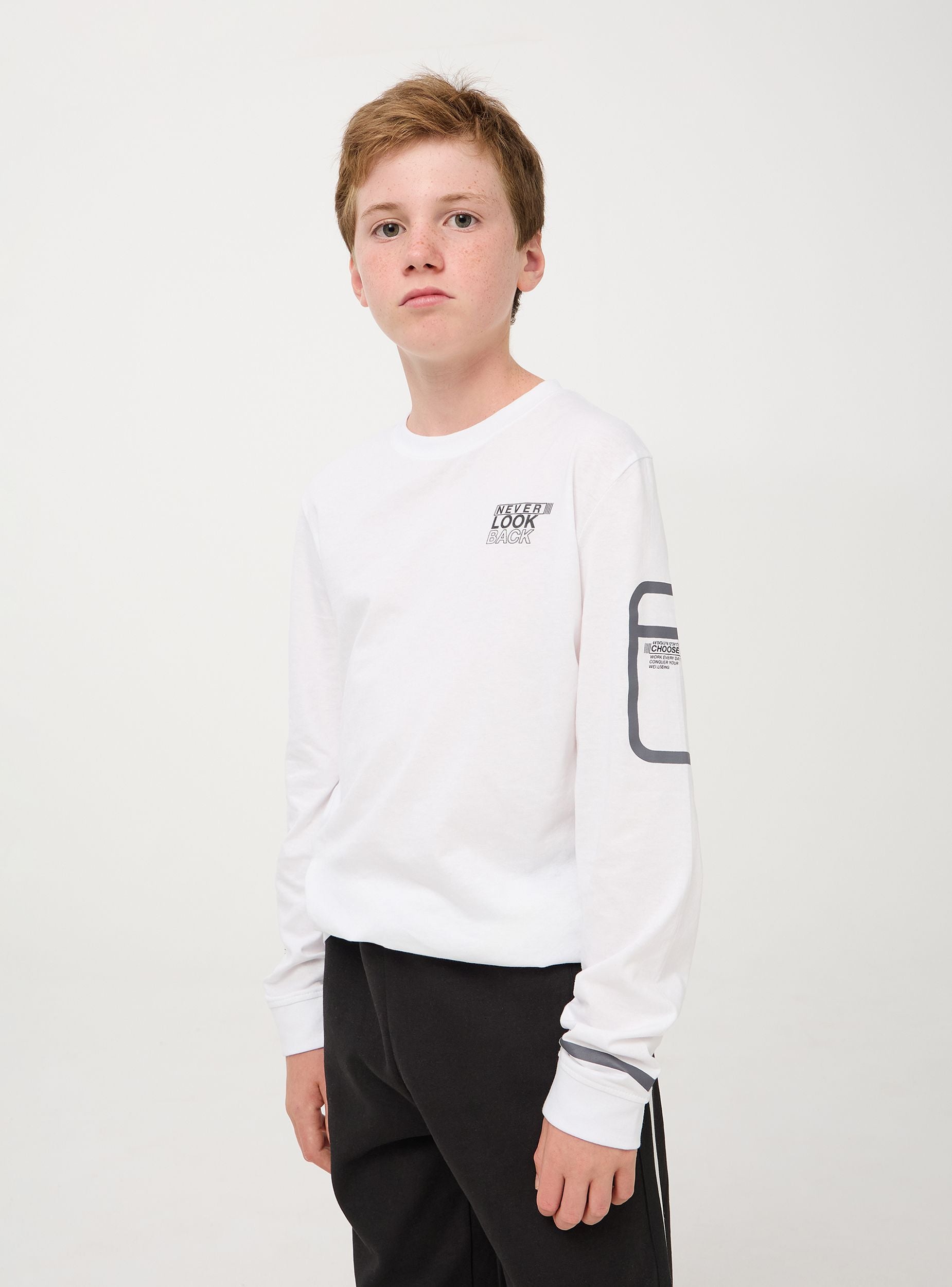 Maglia a maniche lunghe in cotone da bambino, colore bianco, con stampe grafiche. Questa maglia presenta una stampa ispirazionale "Never Look Back" sul petto e dettagli grafici sulle maniche, aggiungendo un tocco moderno e dinamico. La vestibilità è regolare, garantendo comfort e libertà di movimento. Le cuciture sono rinforzate, offrendo una maggiore durata. Ideale per un look casual e sportivo.