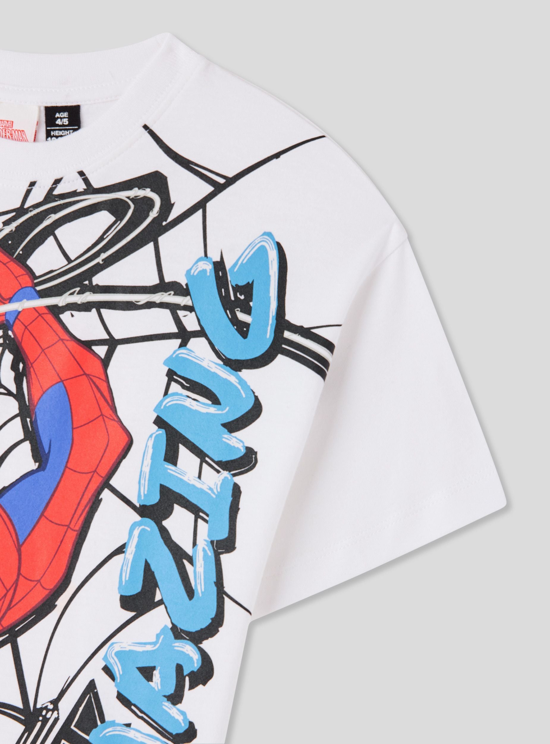 Maglietta da bimbo con stampa Spiderman®, ideale per look casual e per il tempo libero. Modello a maniche corte con girocollo e vestibilità regular, valorizzato da maxi stampa con scritta e ragnatele che dona carattere urban. Facile da abbinare con jeans, joggers o pantaloncini e sneakers, perfetta per la scuola e le uscite di tutti i giorni.
