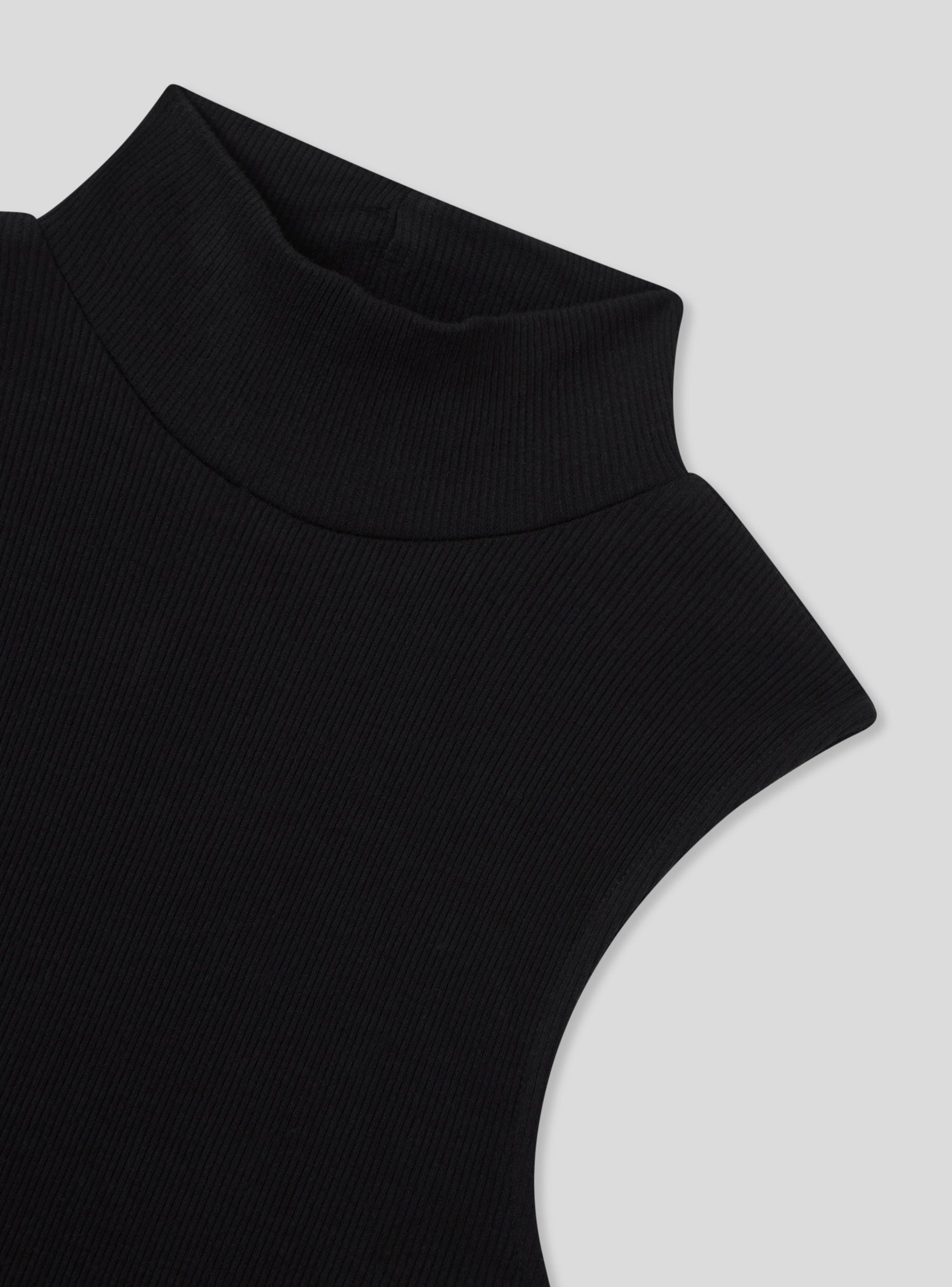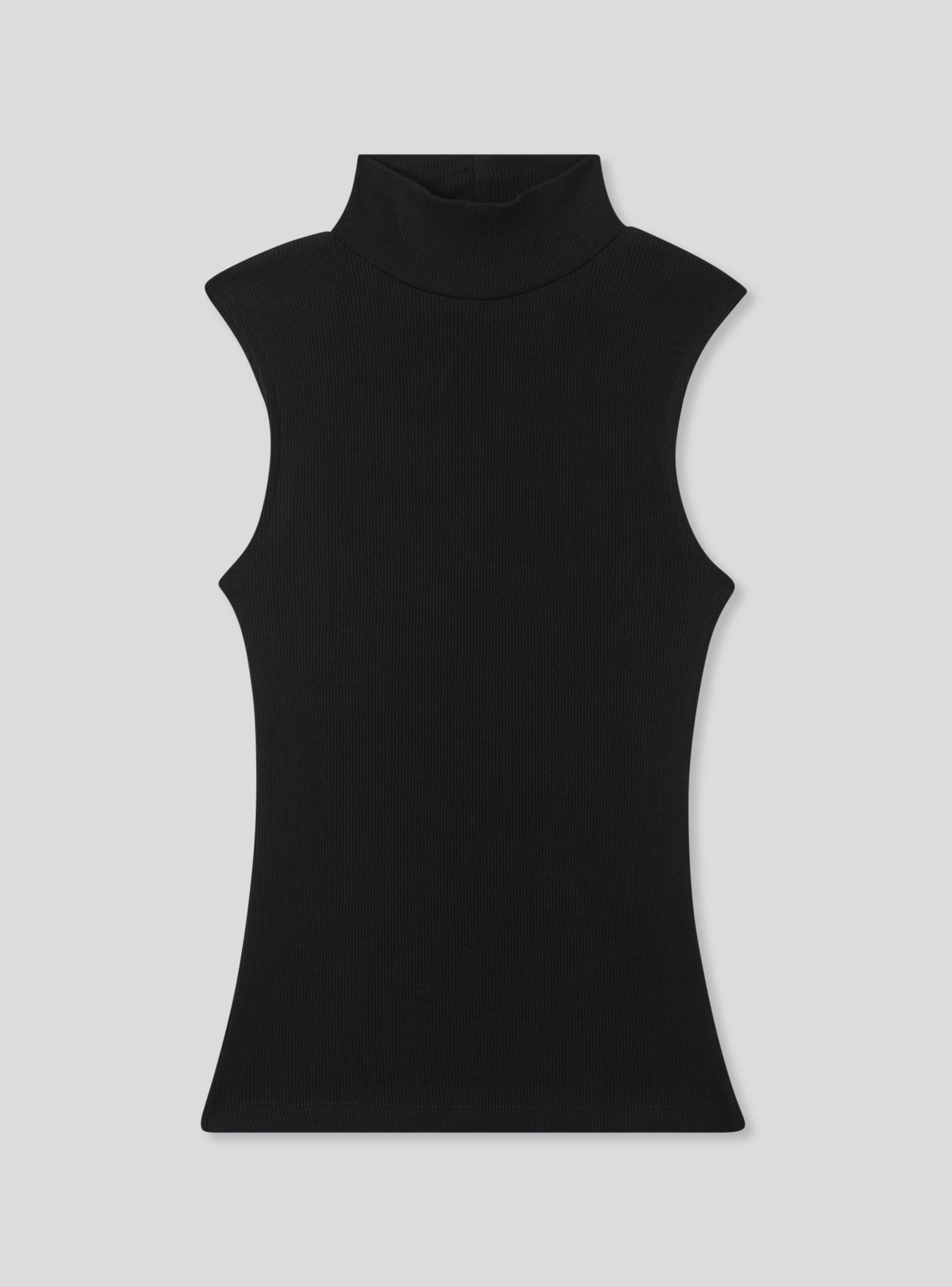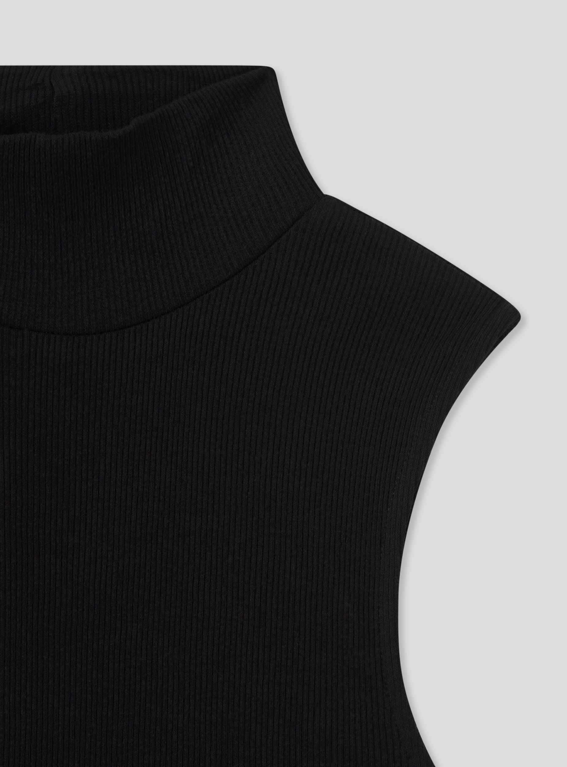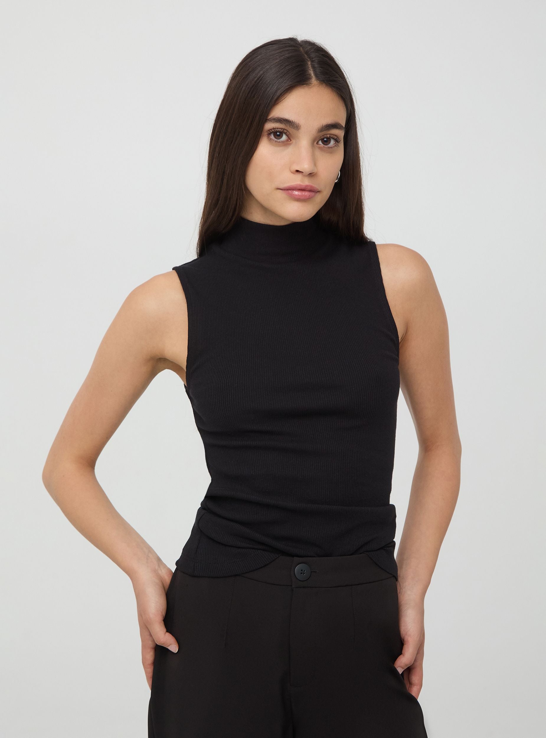 Top da donna a costine a tinta unita, senza maniche, e con collo alto. Realizzato in un tessuto morbido e aderente, offre comfort e libertà di movimento. Il design semplice e versatile lo rende ideale da abbinare a vari stili di abbigliamento, sia casual che più formali. Perfetto per essere indossato da solo o sotto una giacca o un cardigan.Dettagli