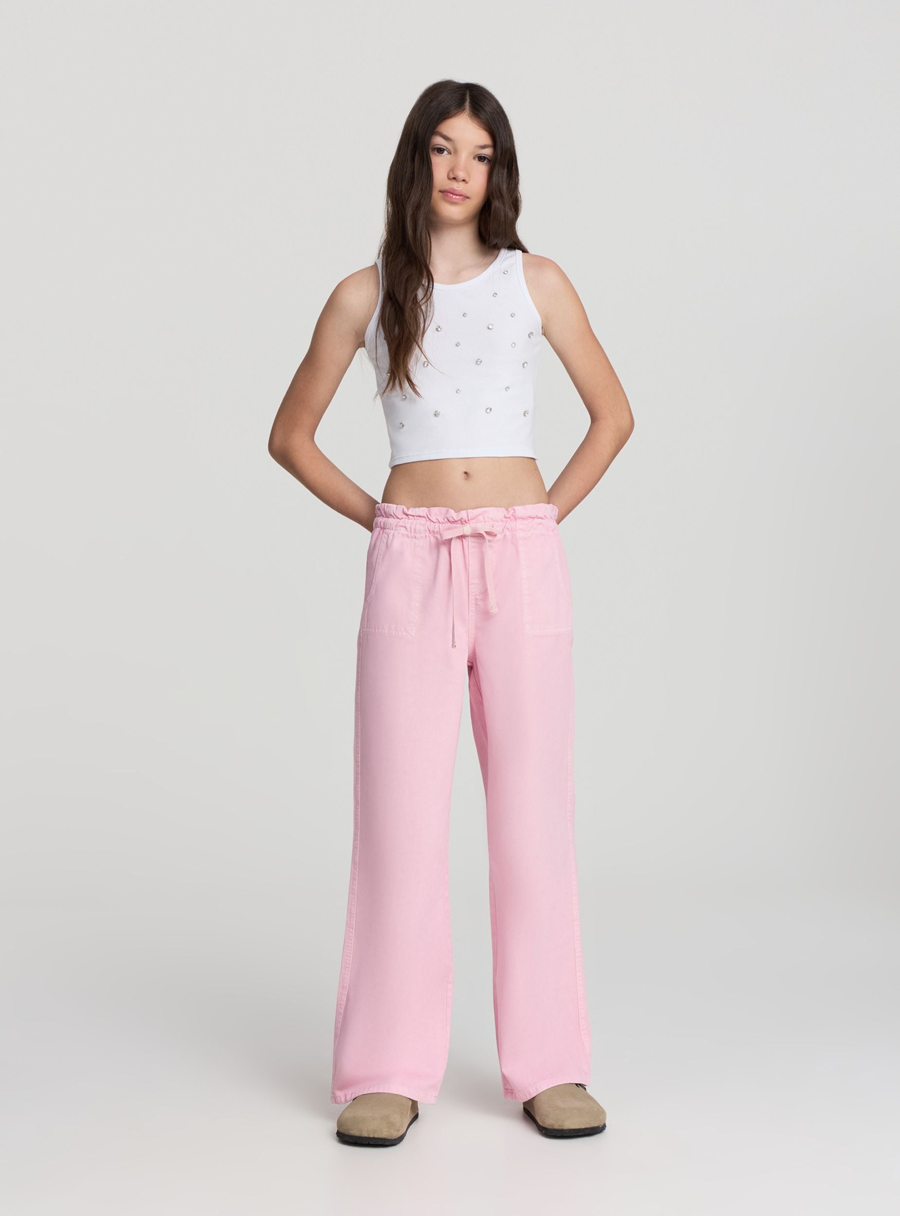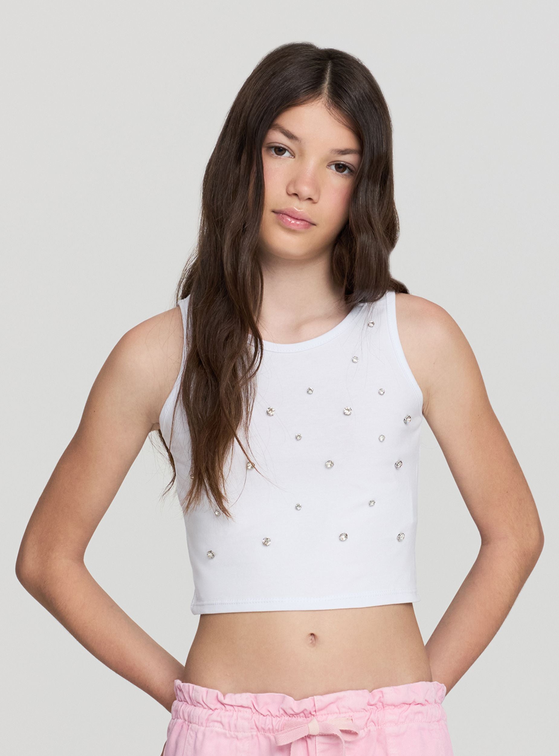 Top da bambina ideale per look trendy e versatili, perfetto da abbinare a jeans o gonne per occasioni casual o momenti speciali. Il design a tinta unita è arricchito da applicazioni gioiello sul davanti, che donano un tocco luminoso e originale. Il modello senza maniche con spalline larghe e scollo rotondo garantisce comfort e libertà di movimento, valorizzando ogni outfit con dettagli raffinati.