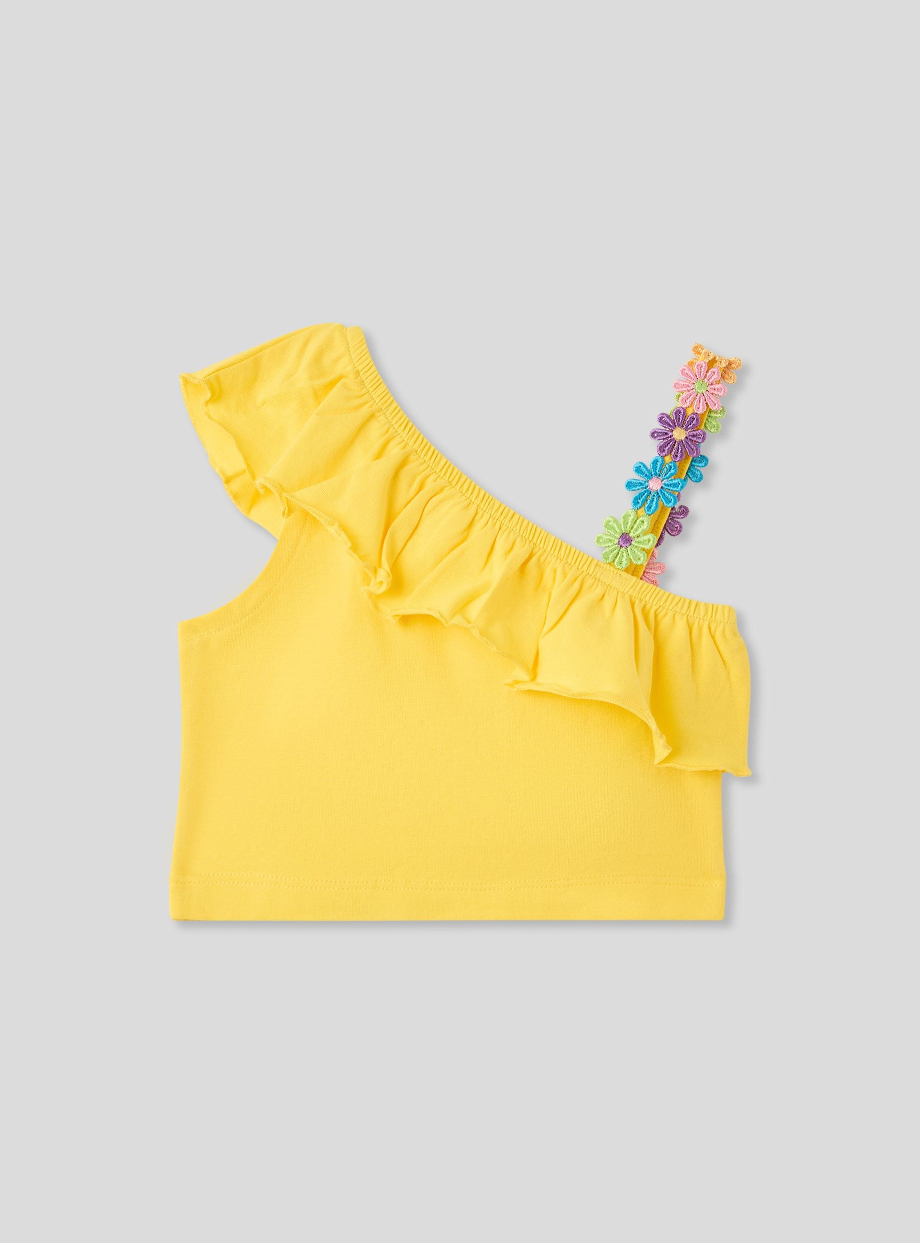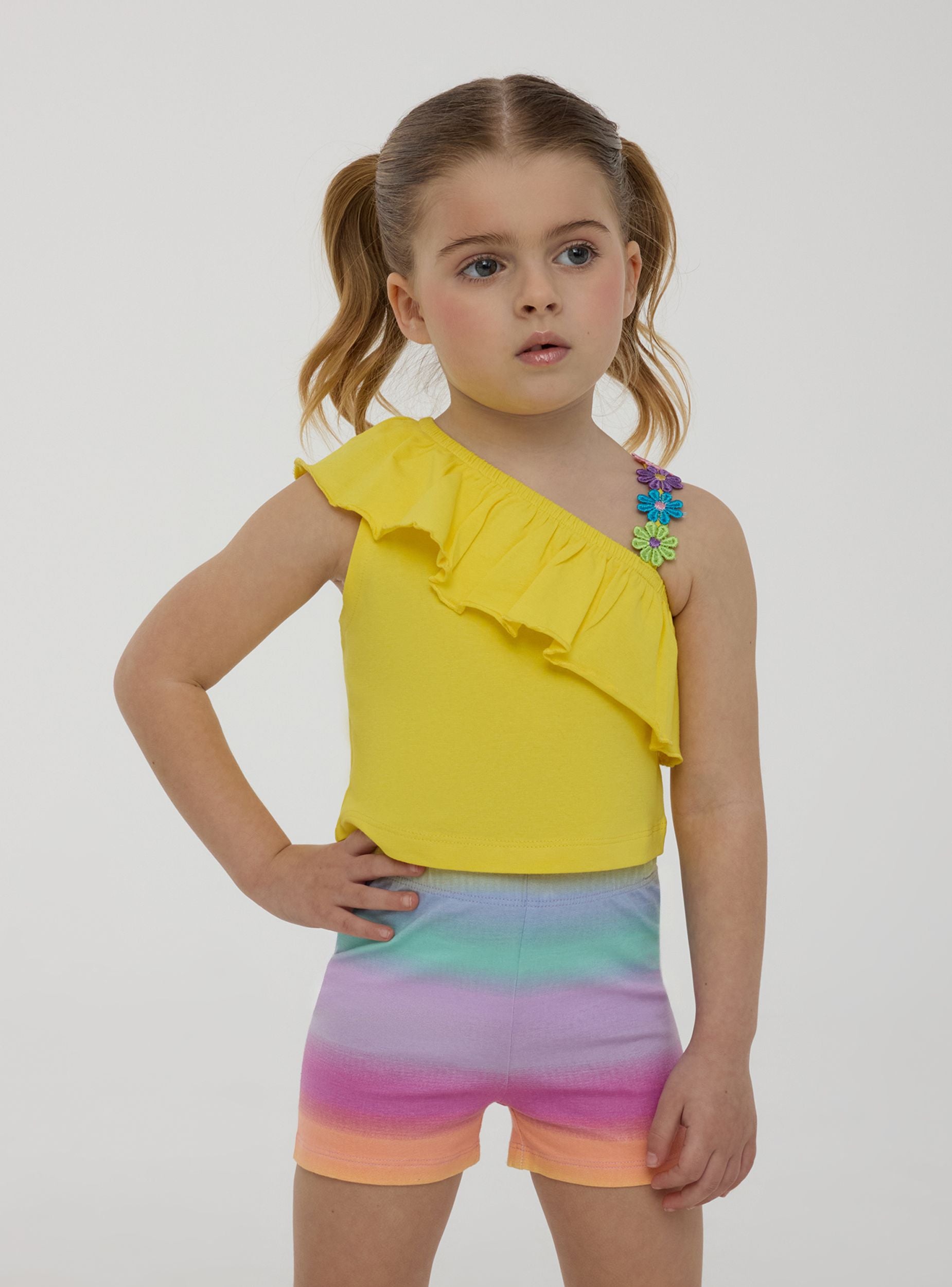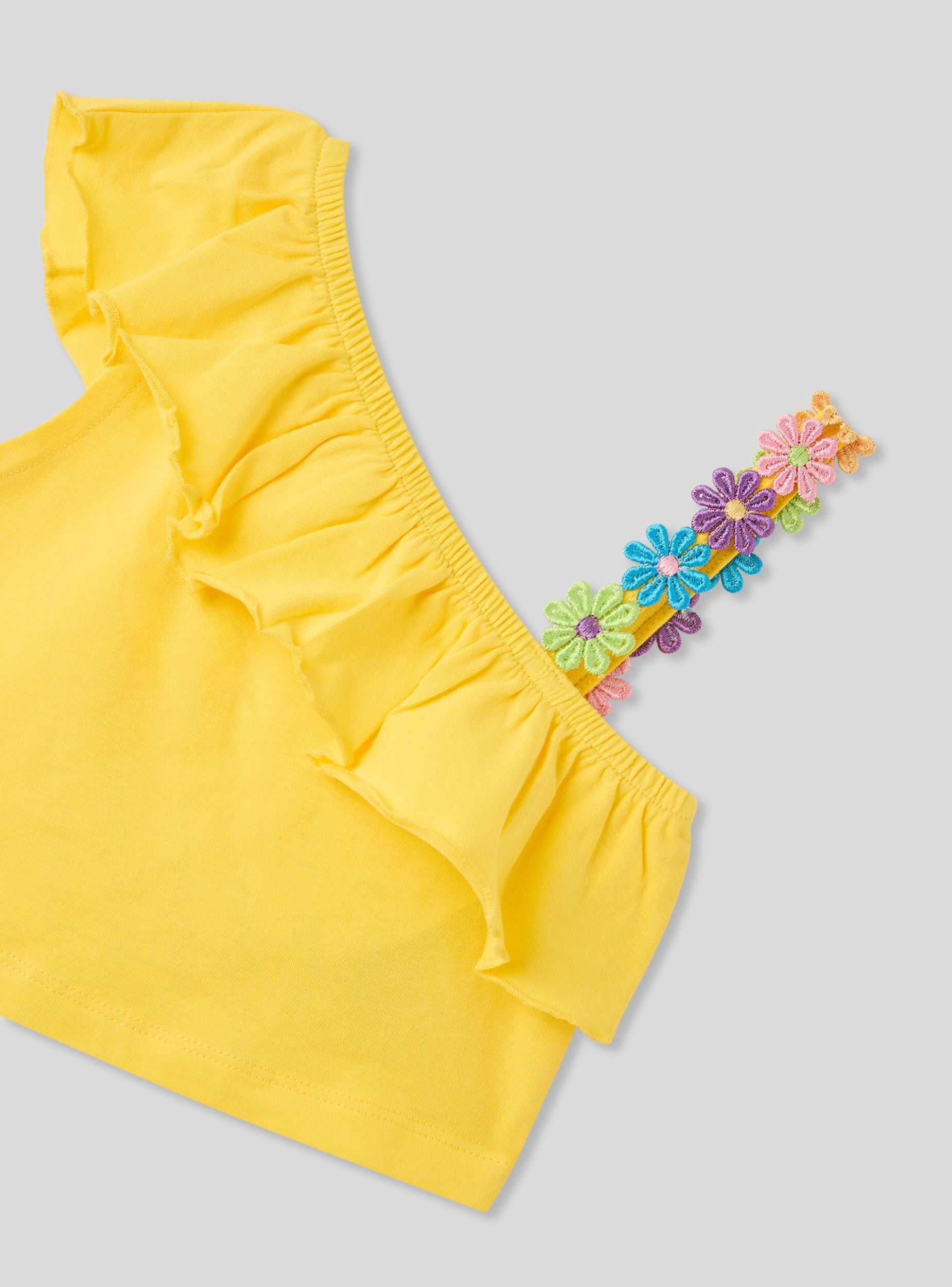Top da bimba perfetto per un look allegro e alla moda. La monospalla con un'elegante balza dona un tocco vivace, mentre la fantasia a fiorellini sulla spallina aggiunge un dettaglio delizioso e colorato. Ideale per le giornate estive, questo top a tinta unita combina comfort e stile, regalando un capo versatile e originale.