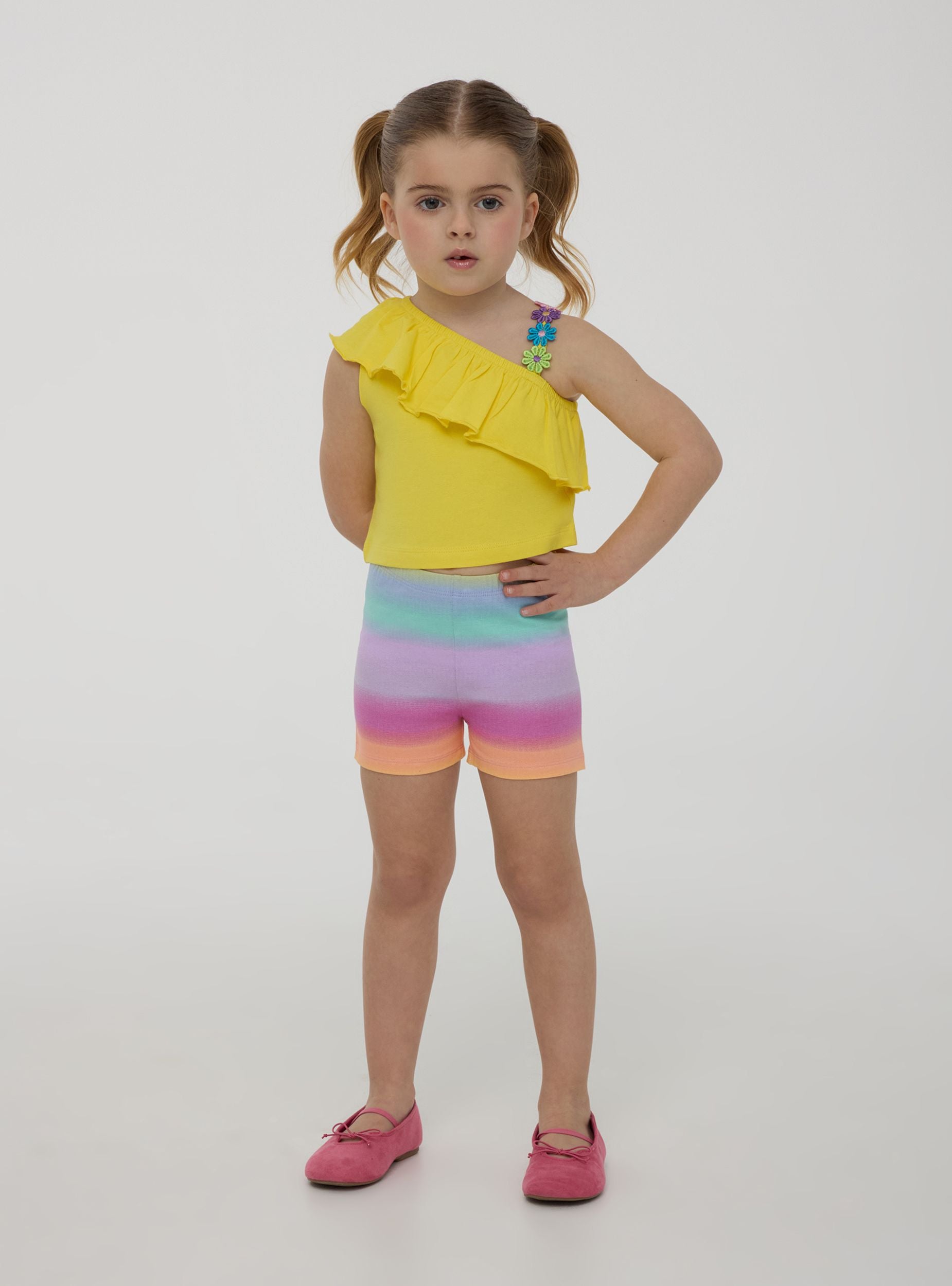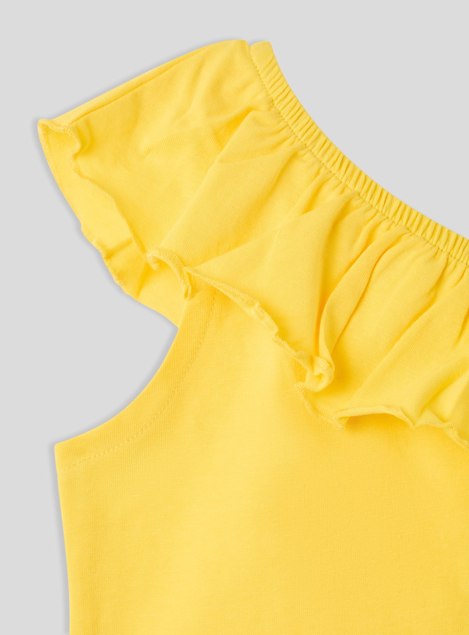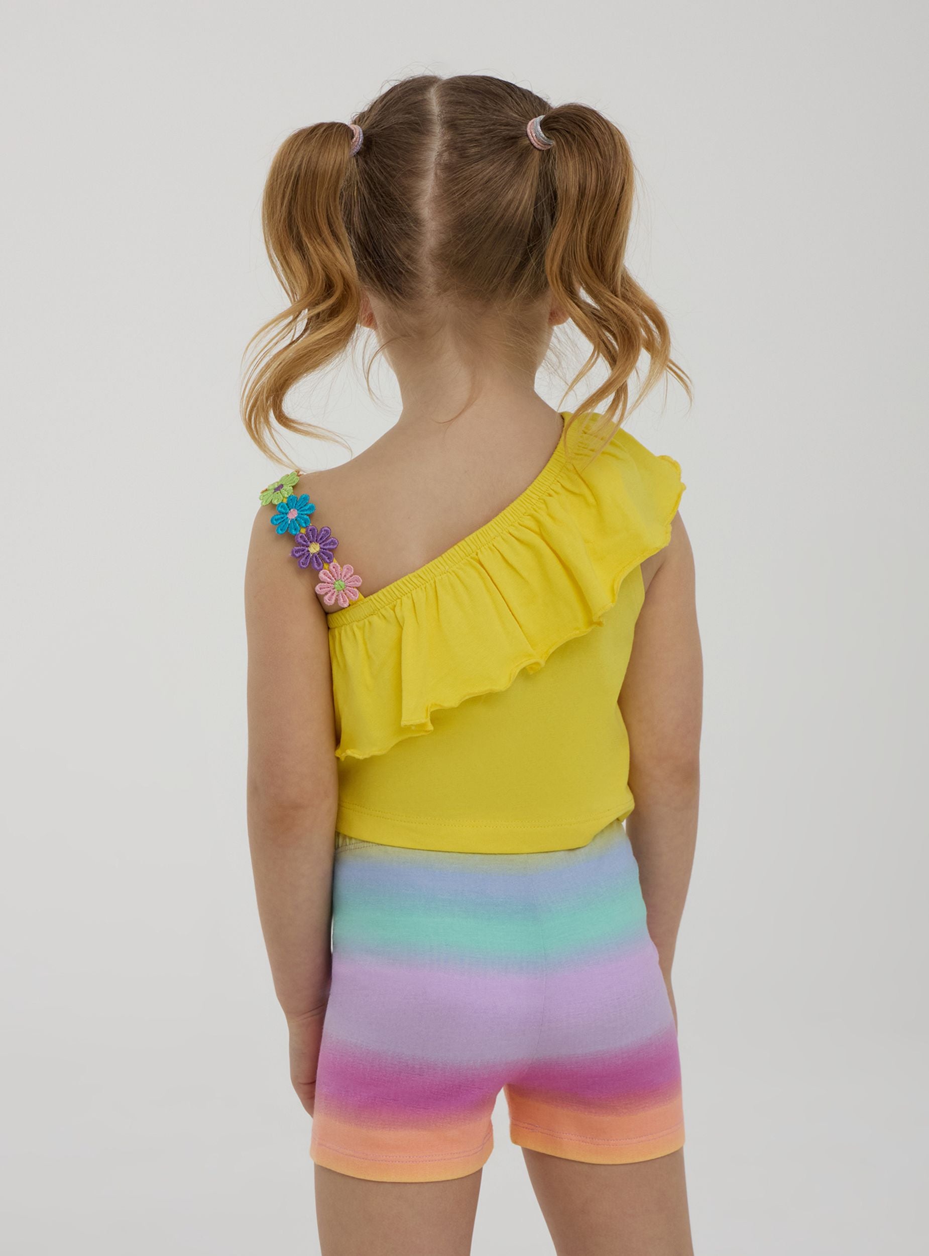 Top da bimba perfetto per un look allegro e alla moda. La monospalla con un'elegante balza dona un tocco vivace, mentre la fantasia a fiorellini sulla spallina aggiunge un dettaglio delizioso e colorato. Ideale per le giornate estive, questo top a tinta unita combina comfort e stile, regalando un capo versatile e originale.
