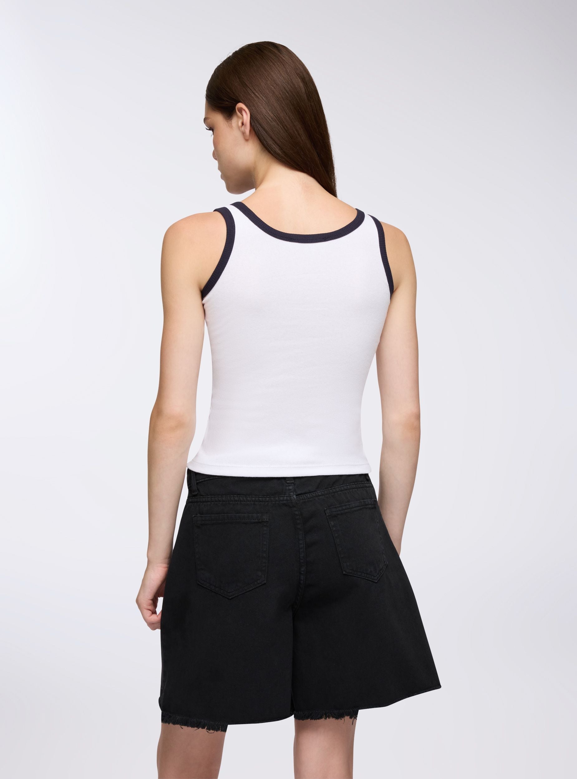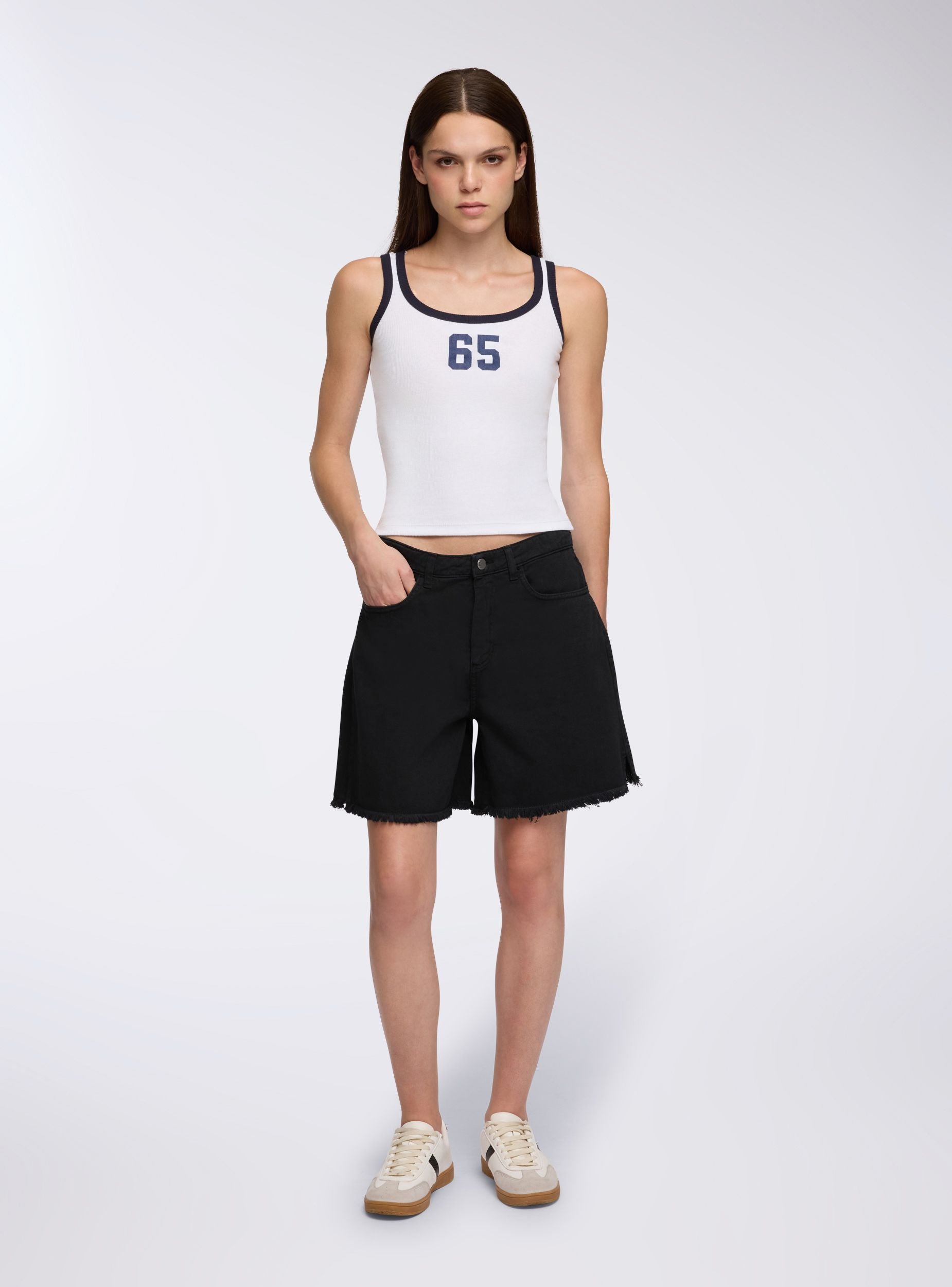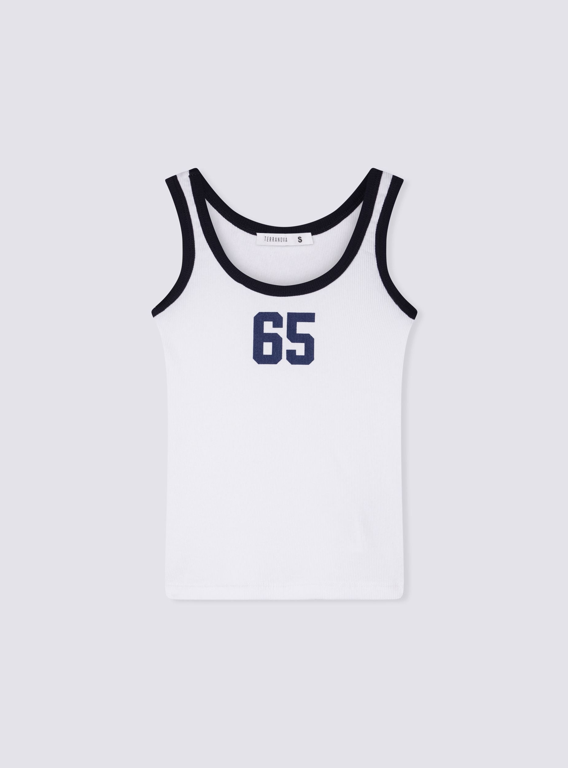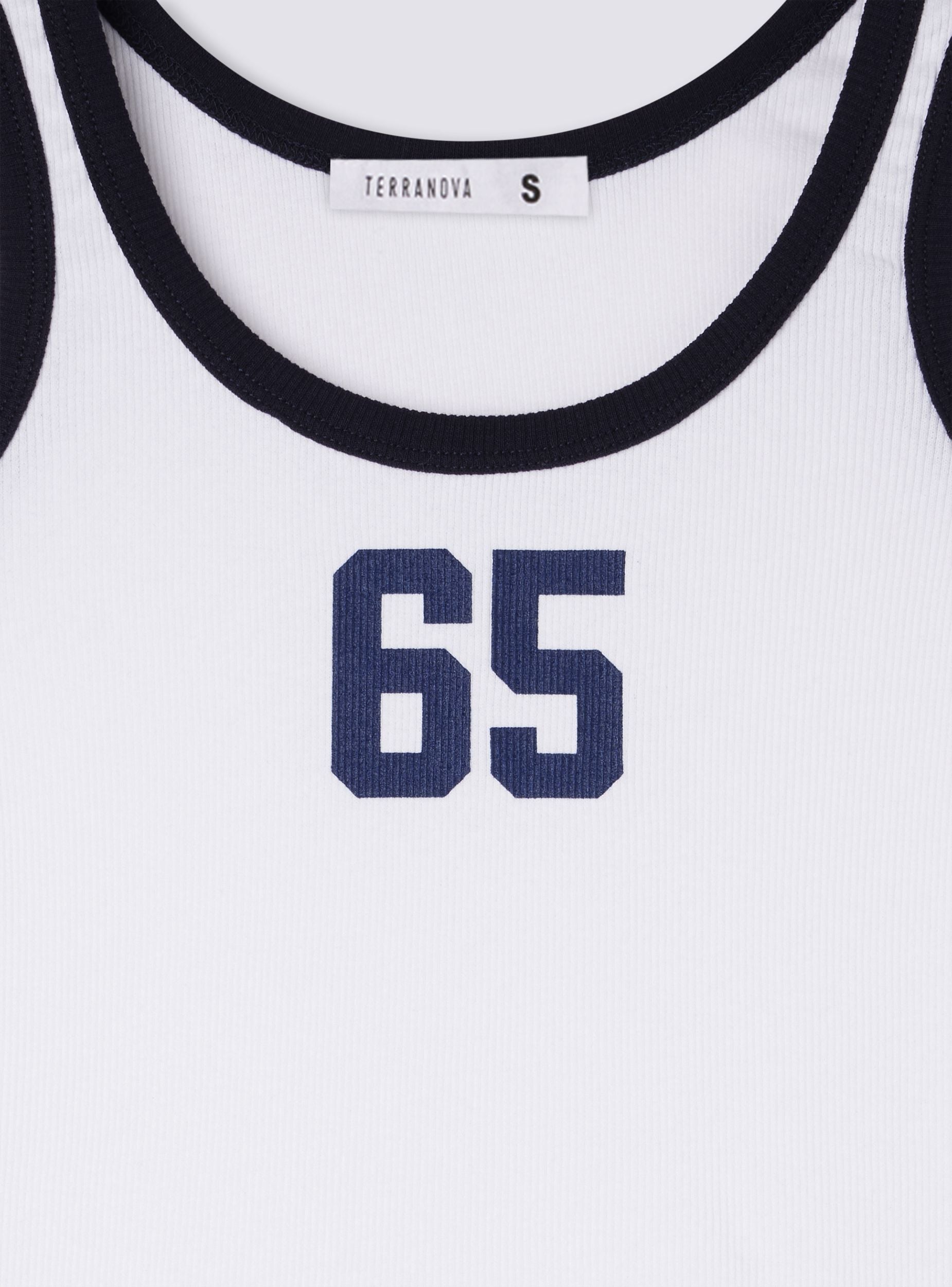 Canotta da donna con design sportivo e casual. Il tessuto a costine presenta una stampa con numero al centro e profili a contrasto, ideale per un look dinamico e informale. Perfetta da abbinare a jeans o pantaloncini per un outfit estivo. Le spalline larghe e lo scollo rotondo garantiscono comfort e libertà di movimento. Un capo versatile per il tempo libero e le giornate calde.