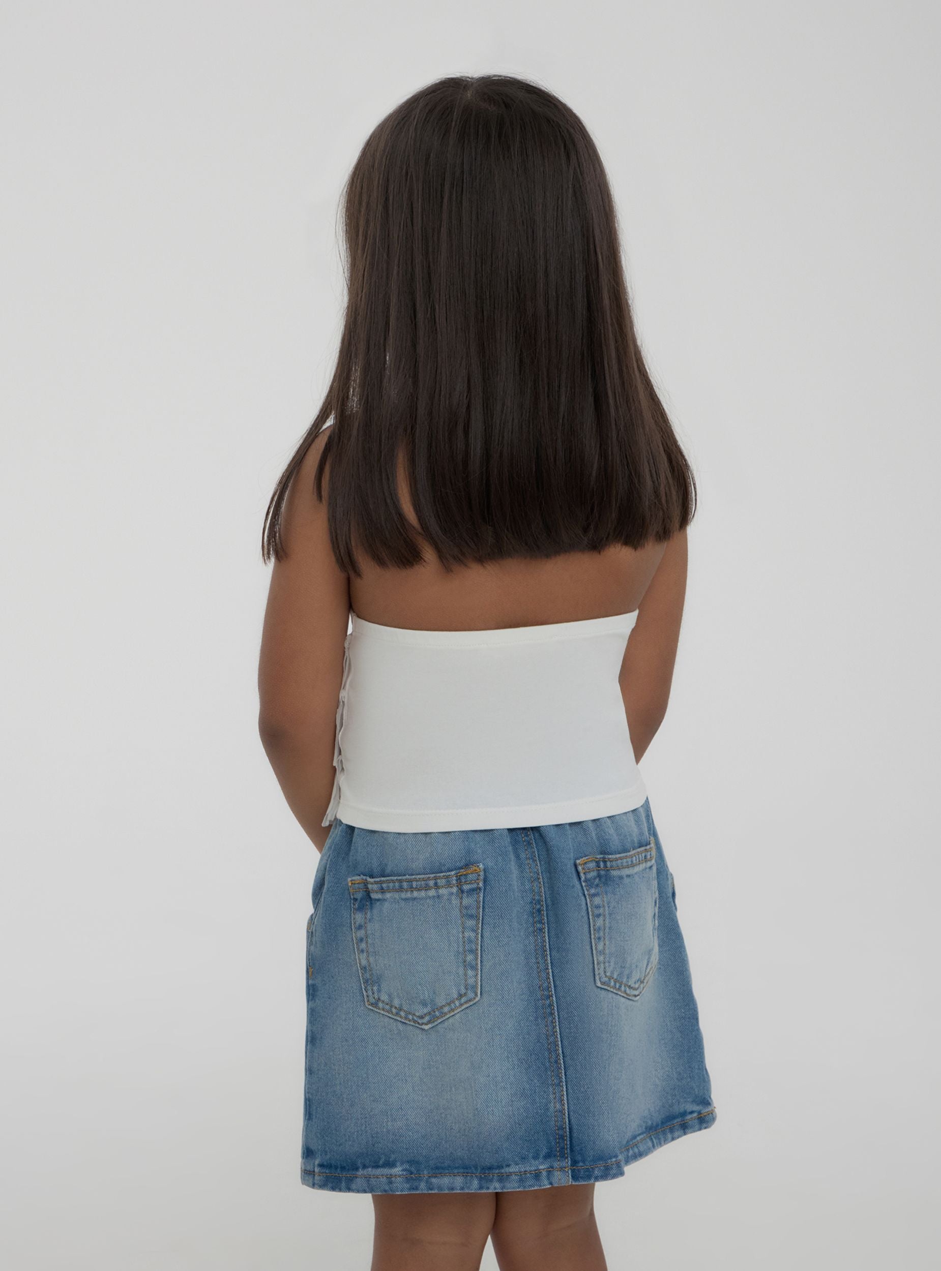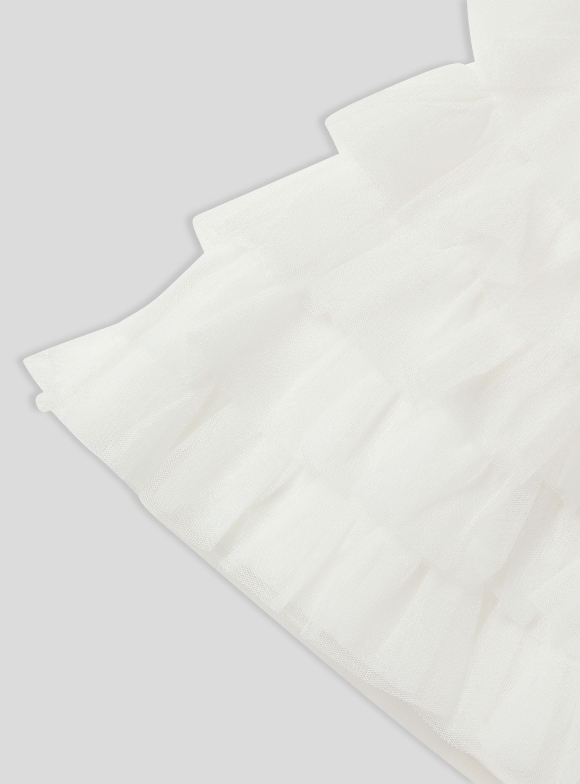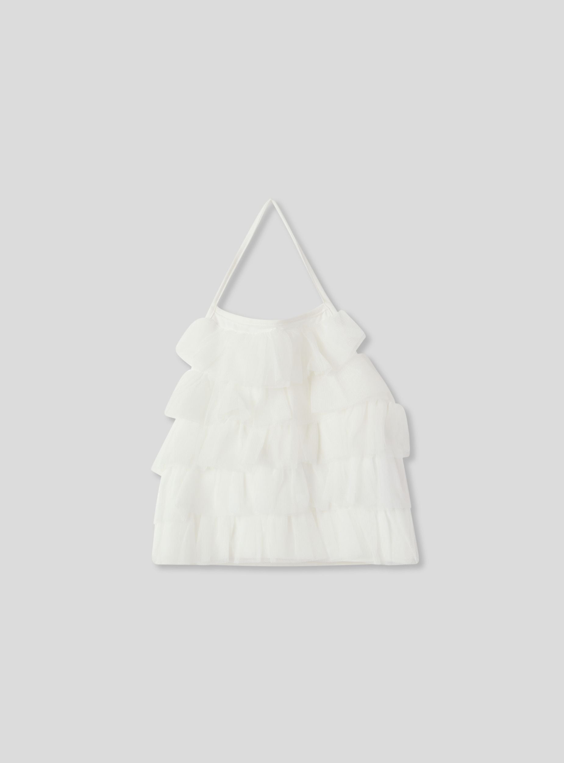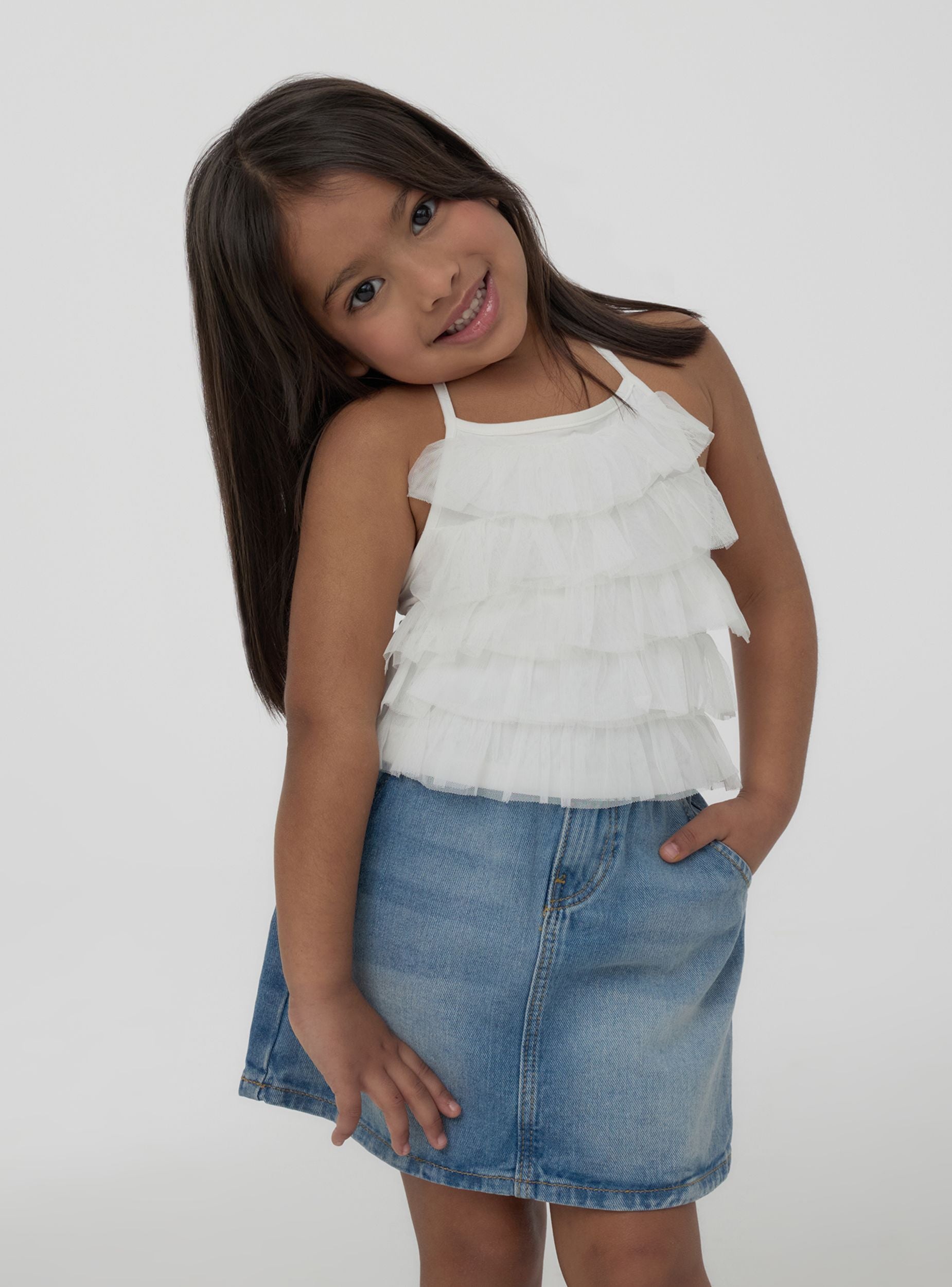 Top crop da bimba dal design elegante e giocoso, caratterizzata da una texture in tulle e romantiche balze che aggiungono volume e movimento. Il modello a tinta unita si abbina perfettamente a gonne svolazzanti o pantaloncini per un look raffinato e sbarazzino. Ideale per occasioni speciali, feste o semplicemente per aggiungere un tocco di fantasia agli outfit quotidiani.