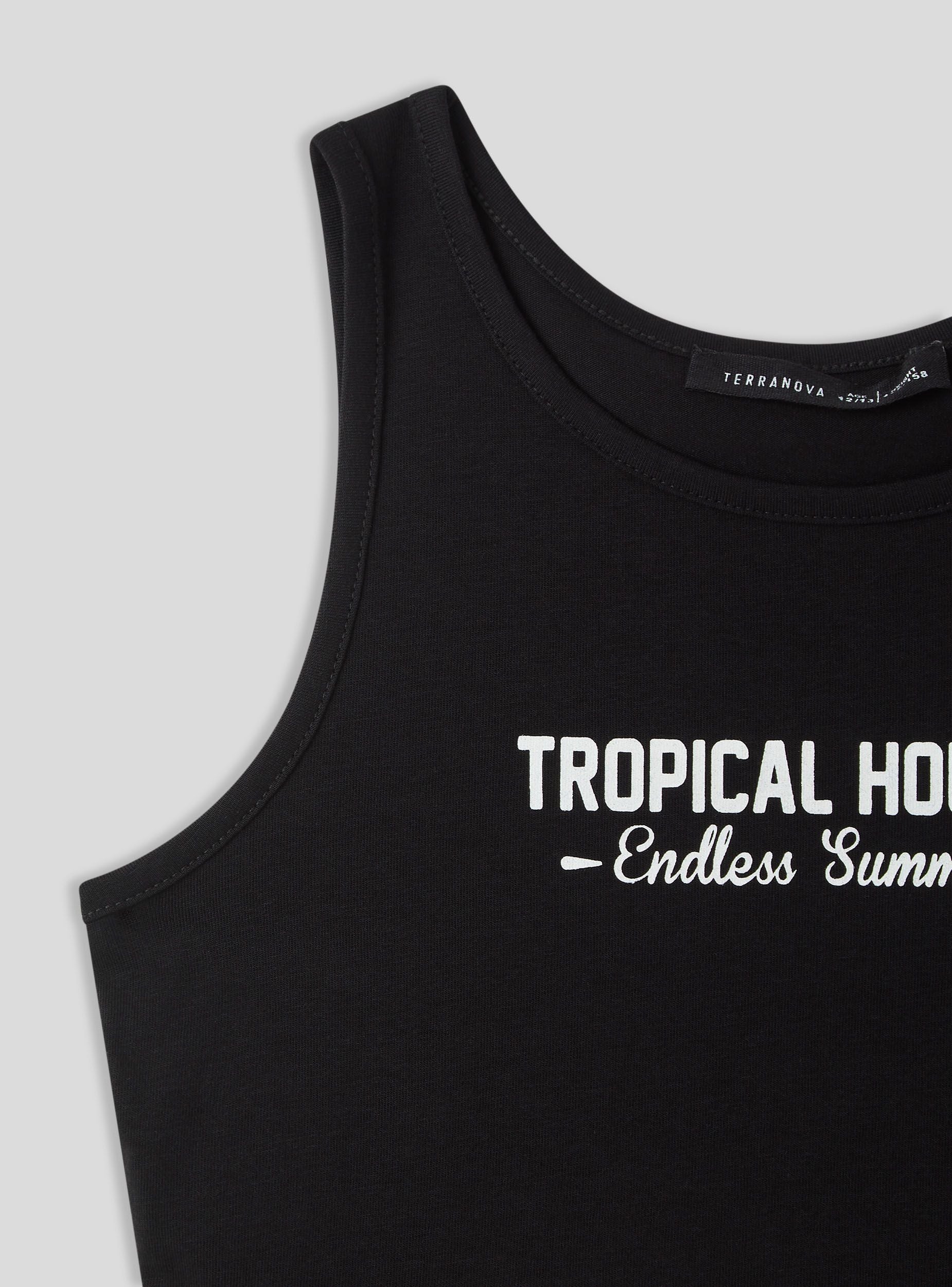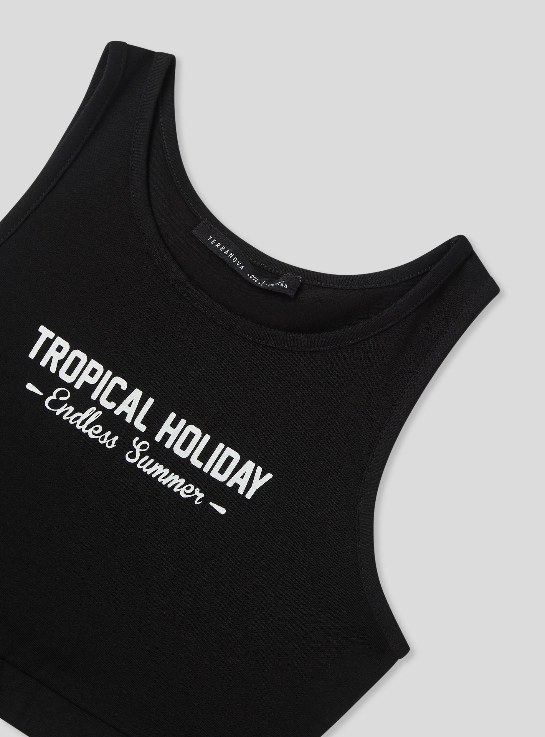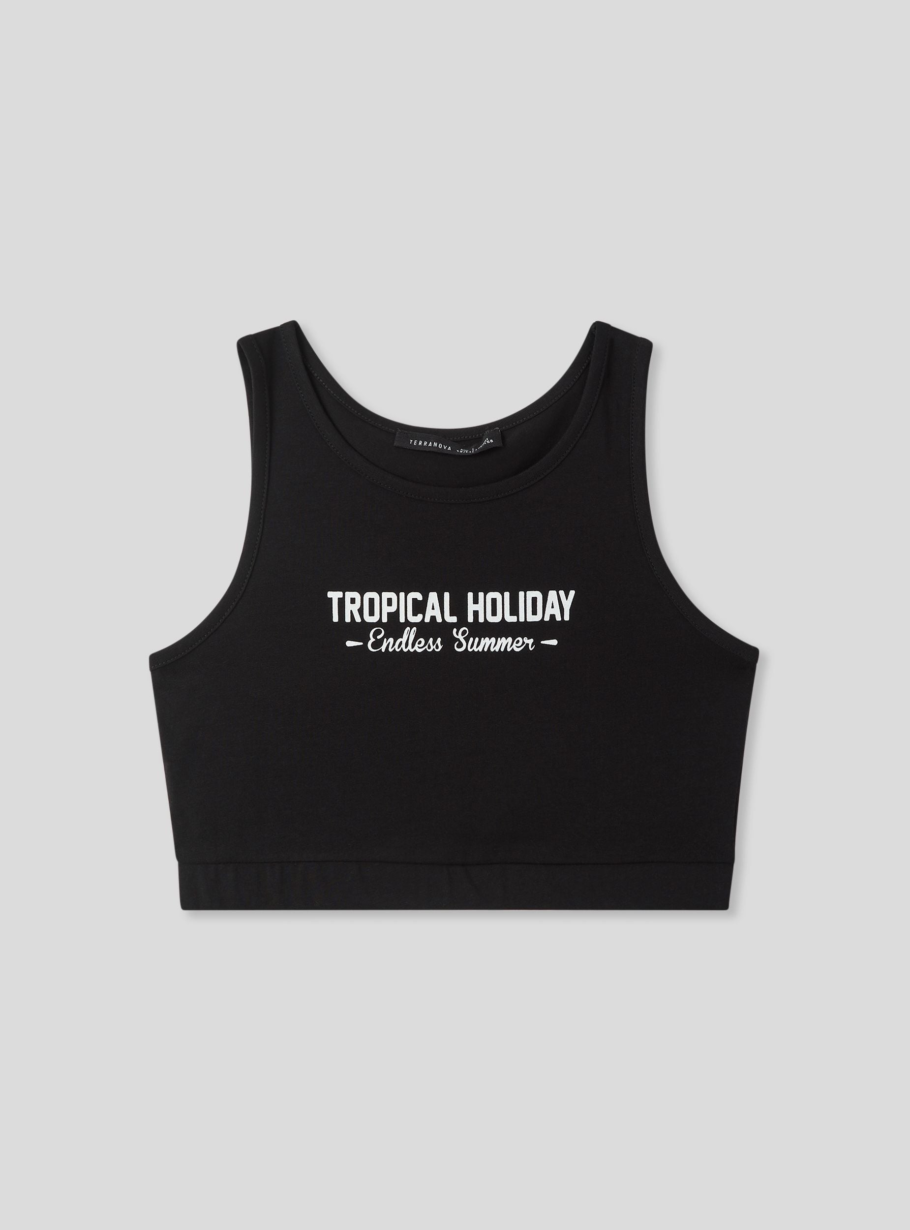 Top da bambina dallo stile fresco e vivace, caratterizzato da una tinta unita che ne esalta la versatilità. Il design crop aggiunge un tocco moderno, mentre la scritta a contrasto sul davanti dona un dettaglio accattivante e originale. Le spalline larghe garantiscono comfort e sostegno, rendendo questo top ideale per le giornate estive e per creare look allegri e dinamici.