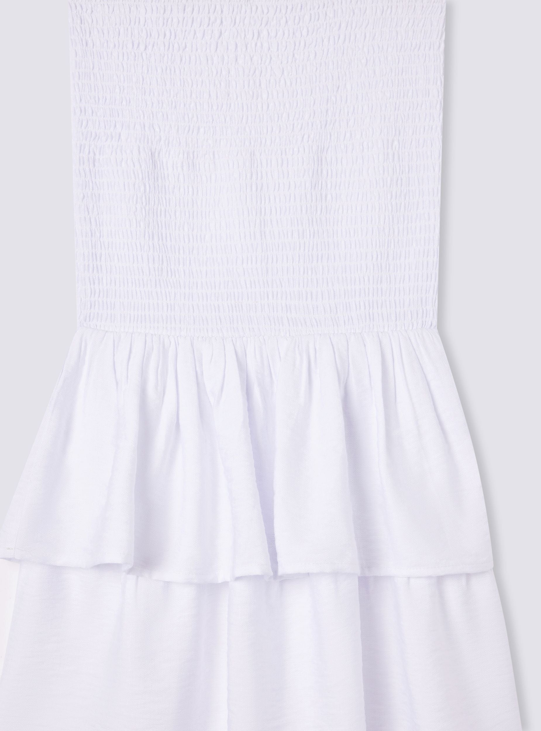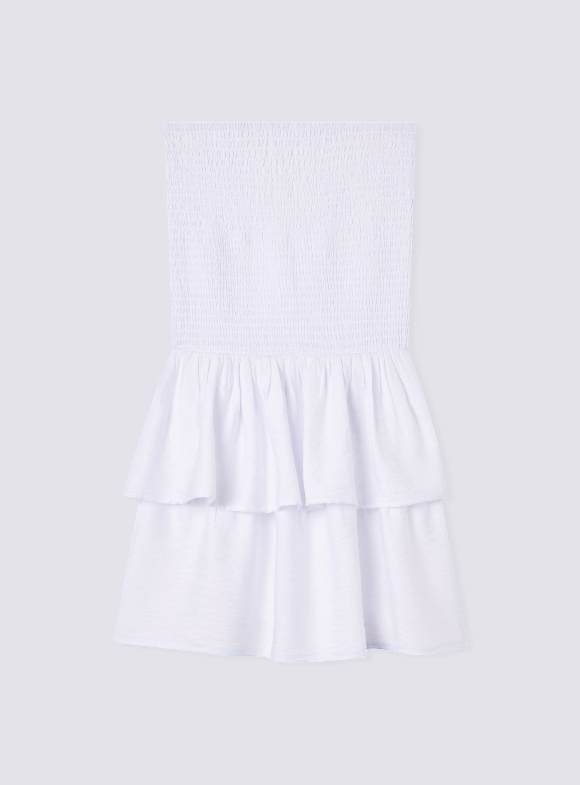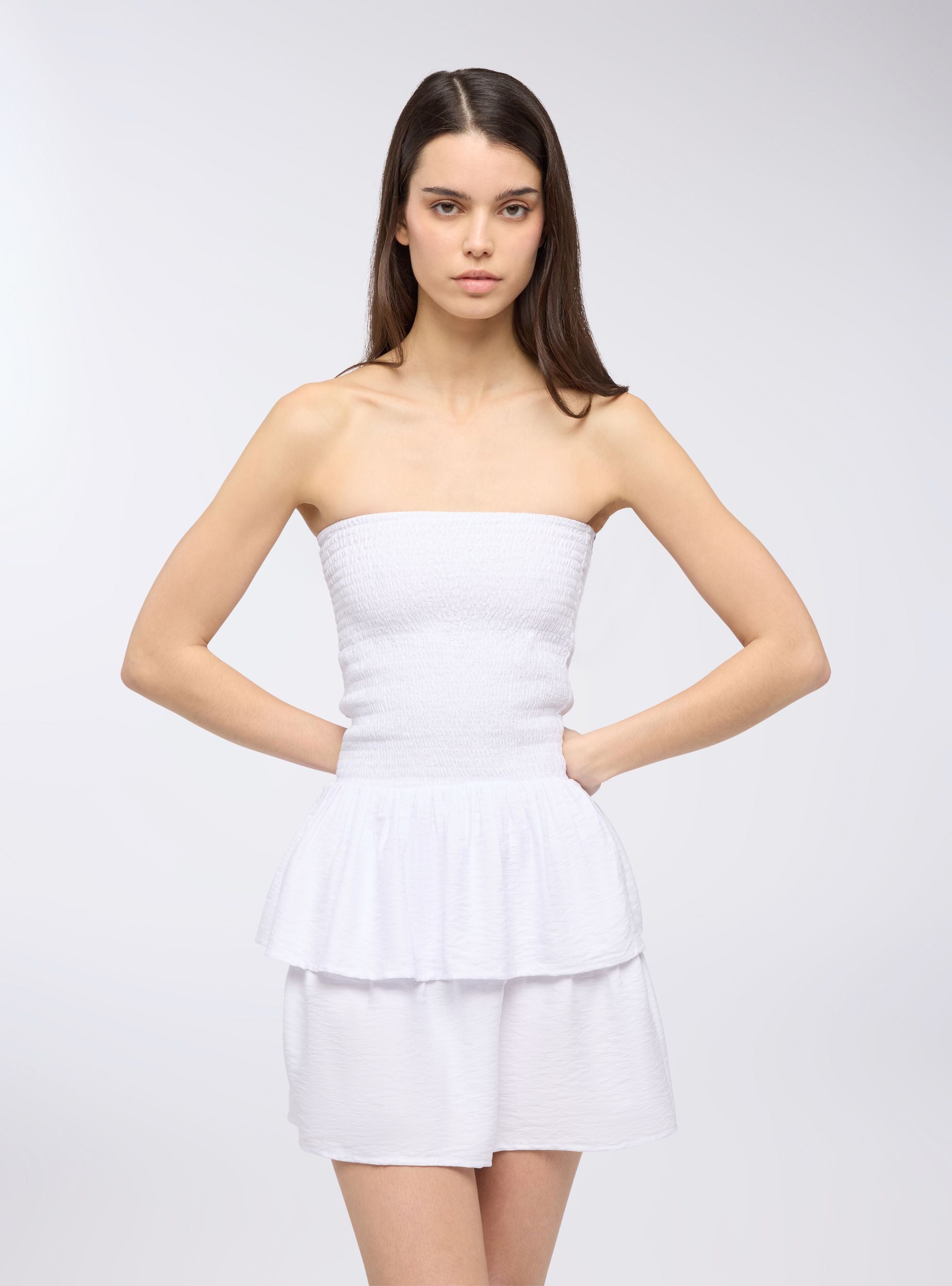 Abito da donna corto a tinta unita, caratterizzato da una fascia superiore con lavorazione a punto smock che garantisce un'aderenza perfetta al corpo, lasciando le spalle scoperte. La gonna è arricchita da morbide balze che aggiungono movimento e leggerezza all'intero capo, creando un effetto voluminoso e dinamico. La linea a balze conferisce un aspetto femminile e giovanile, ideale per le giornate estive e le occasioni casual.