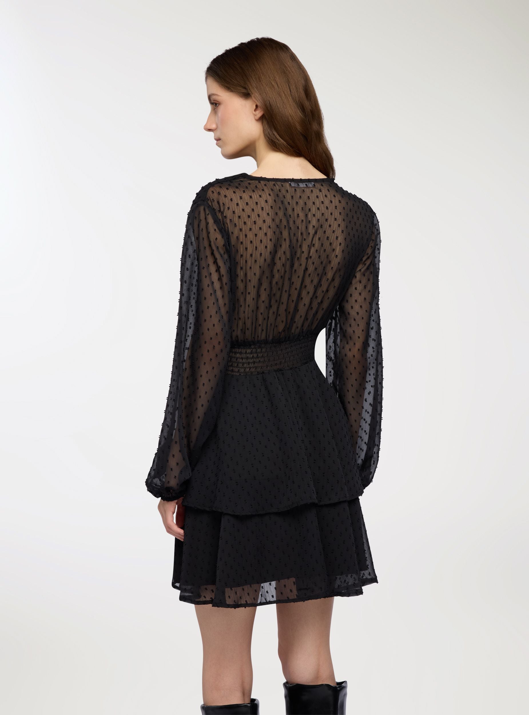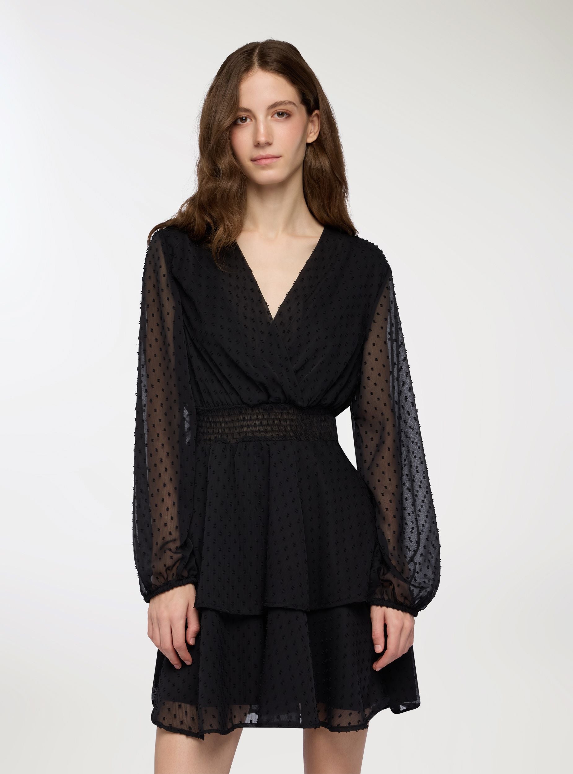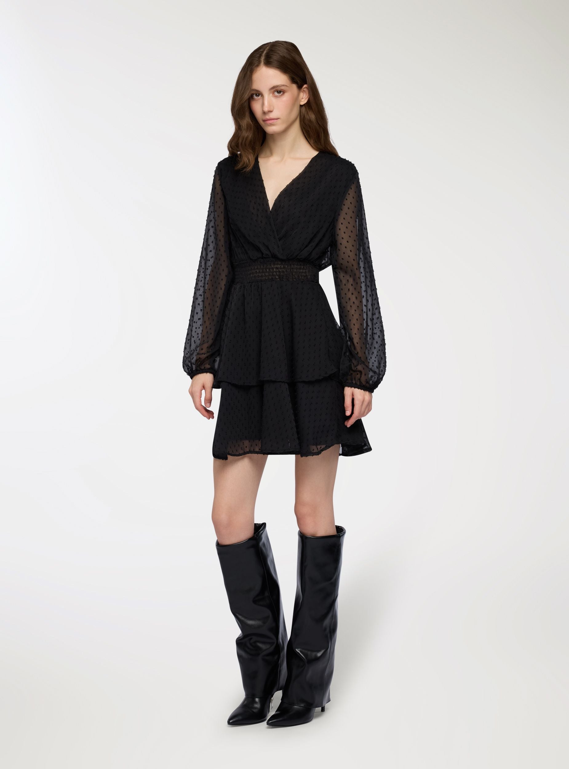 Abito corto da donna con design incrociato sul davanti, ideale per valorizzare il décolleté con eleganza. La vita elasticizzata con punto smock scolpisce la silhouette, mentre le balze sul fondo donano volume e movimento. Le maniche lunghe leggere e semi-trasparenti aggiungono un tocco romantico e femminile. Perfetto per look da sera o occasioni speciali, abbinato a stivali o tacchi per un effetto wow.