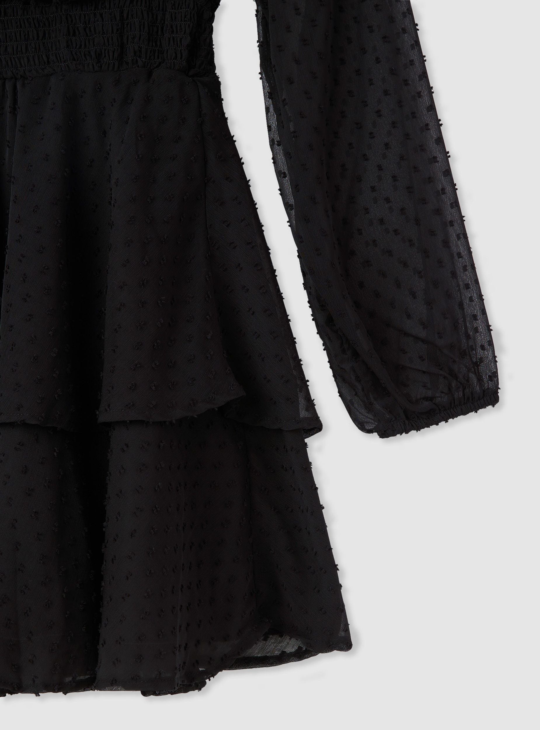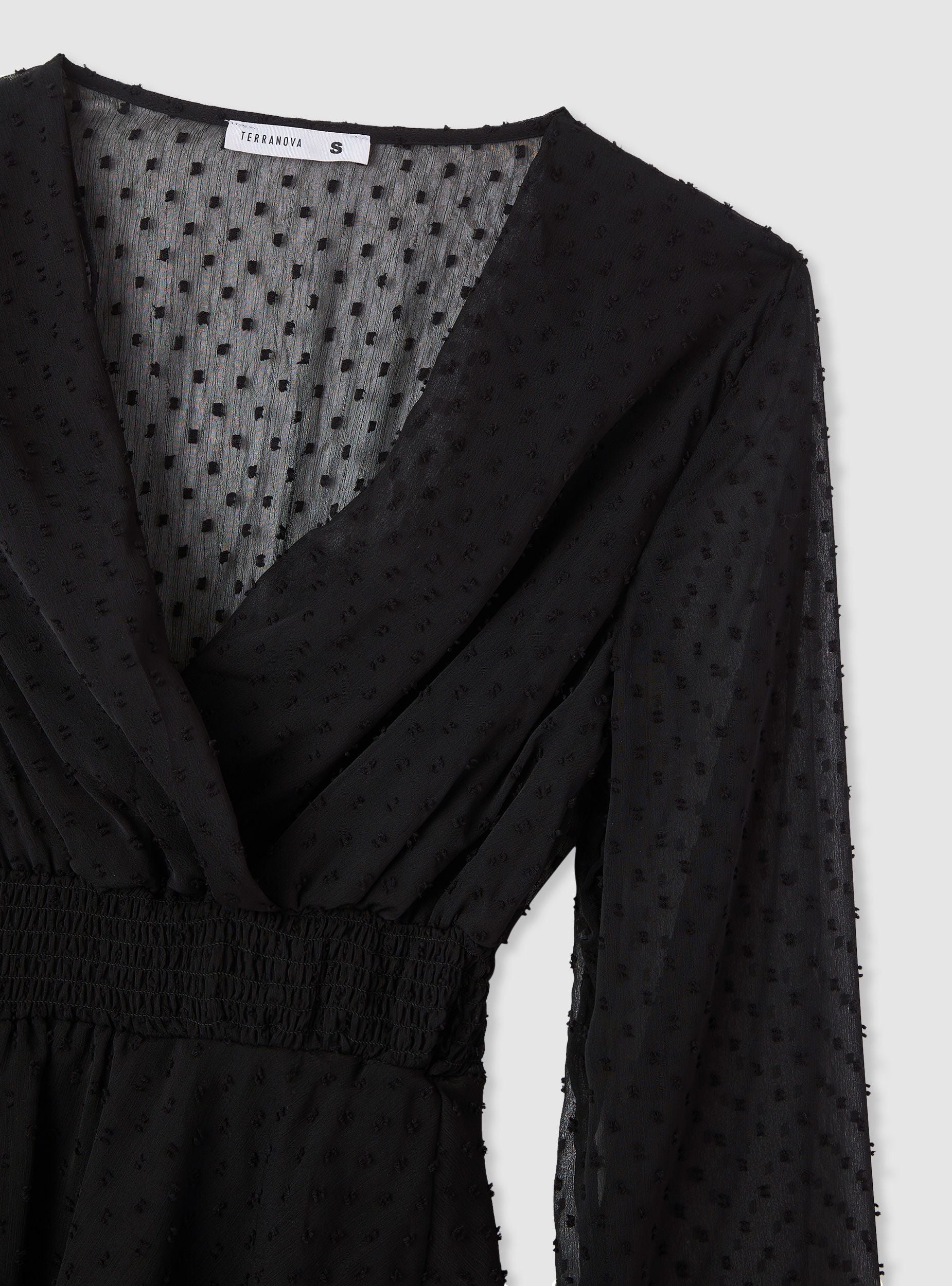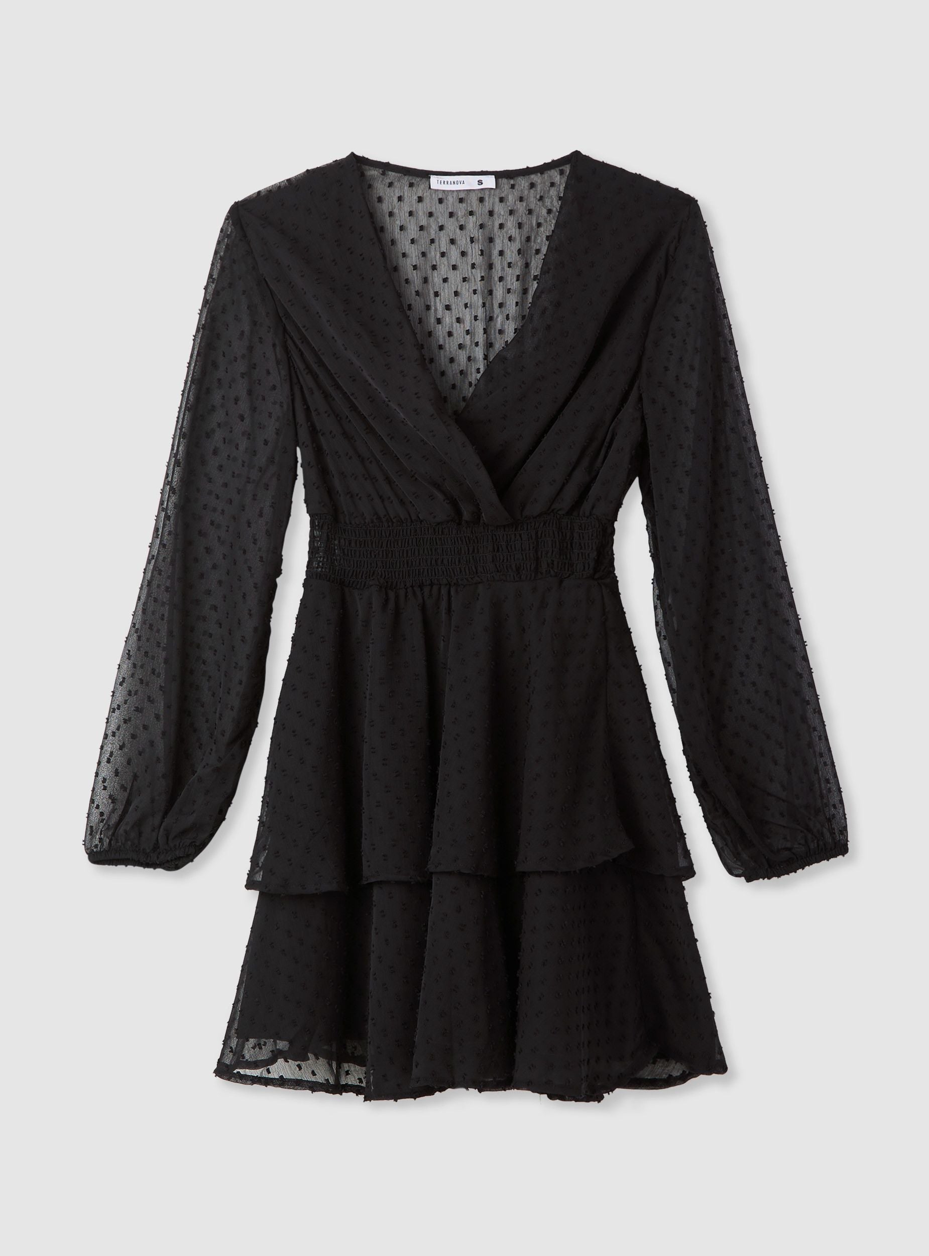 Abito corto da donna con design incrociato sul davanti, ideale per valorizzare il décolleté con eleganza. La vita elasticizzata con punto smock scolpisce la silhouette, mentre le balze sul fondo donano volume e movimento. Le maniche lunghe leggere e semi-trasparenti aggiungono un tocco romantico e femminile. Perfetto per look da sera o occasioni speciali, abbinato a stivali o tacchi per un effetto wow.